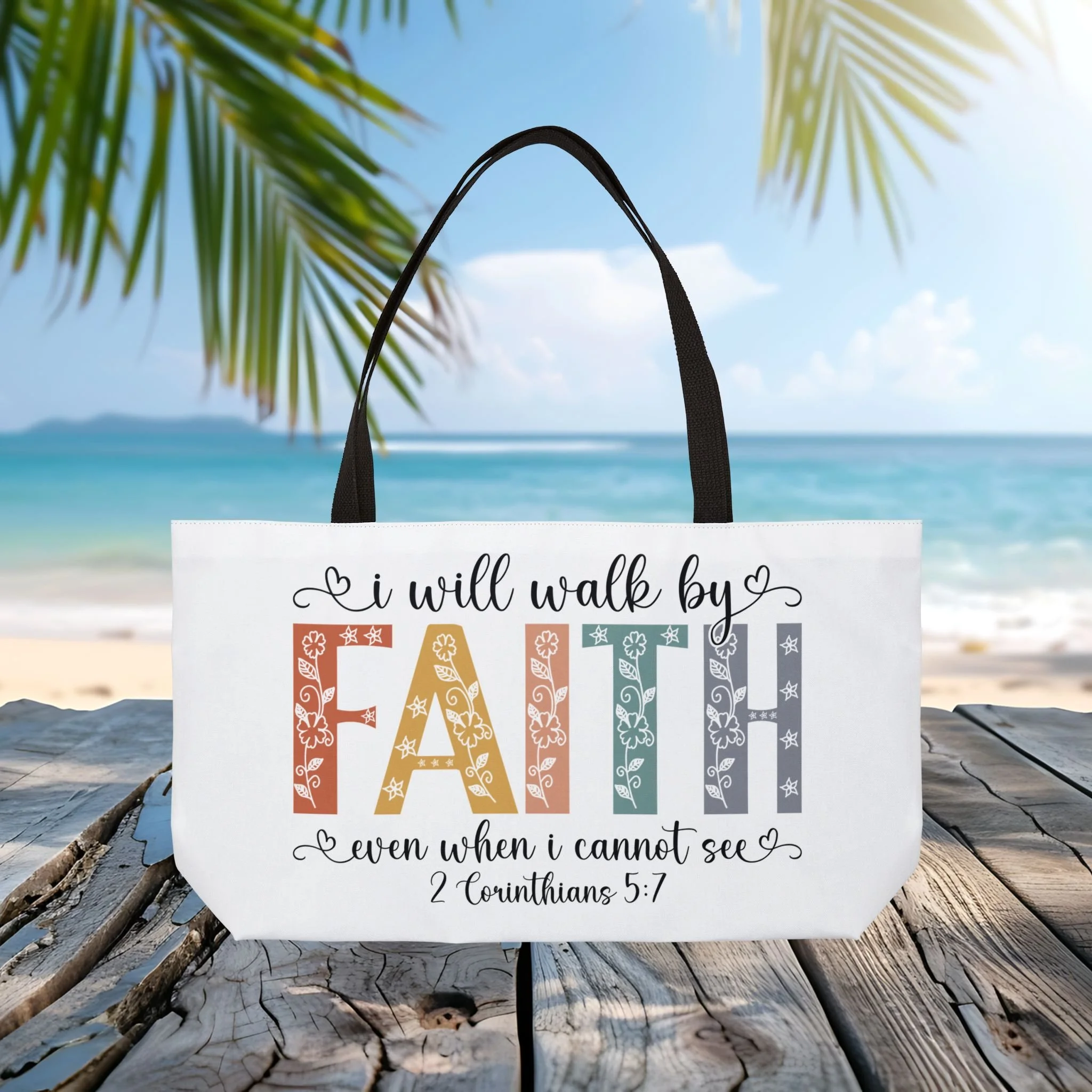 Carry a quiet reminder of hope on your shoulder. This roomy weekender tote features the phrase “I will walk by FAITH even when I cannot see” in warm, floral-filled lettering — a gentle declaration that moves with you from church outings to coastal walks. The all-over print sits on a crisp white spun polyester exterior with a smart black lining and sturdy black woven handles. Its T-bottom shape keeps groceries, Bibles, sandals or a change of clothes neatly organized, while vibrant printing holds its color trip after trip. Thoughtful and unpretentious, this tote blends everyday practicality with a small, steady encouragement to keep going.