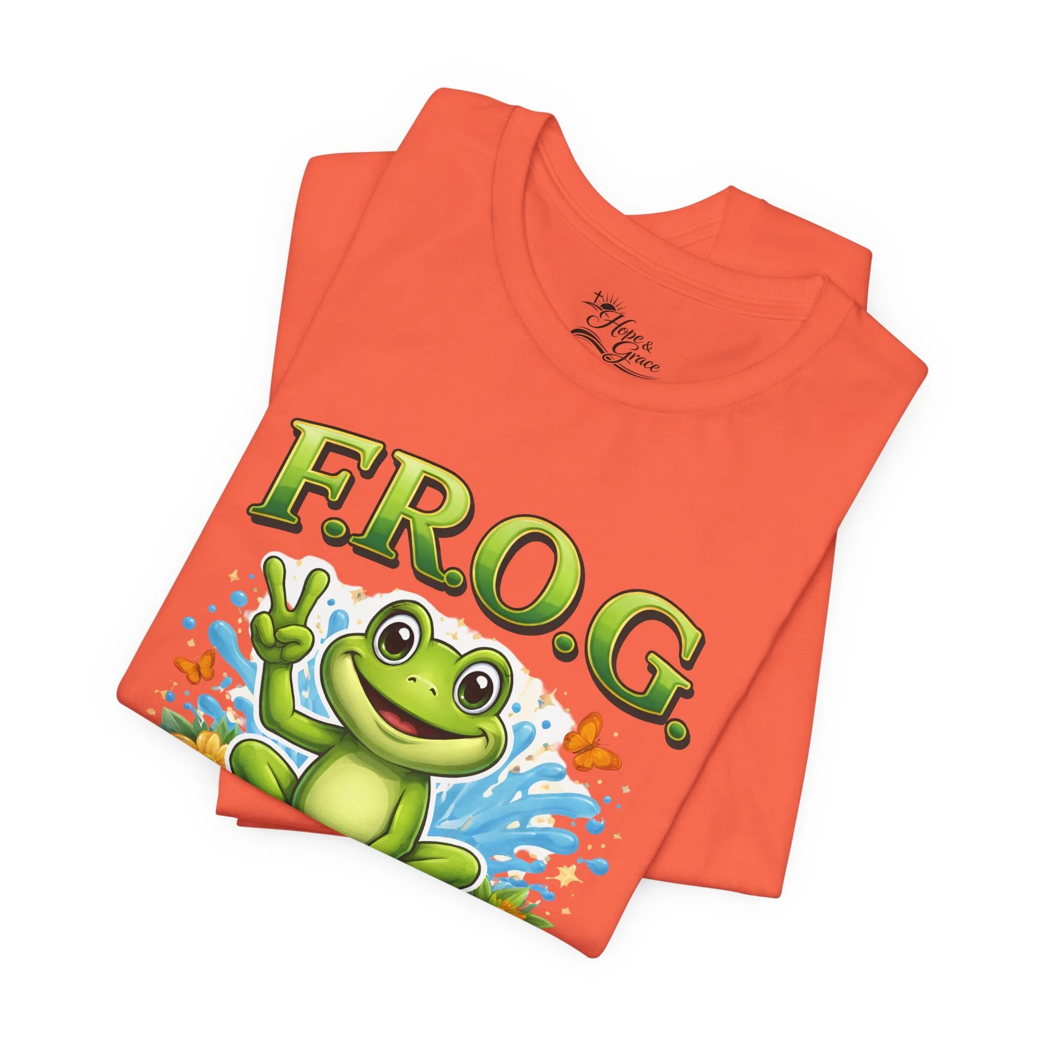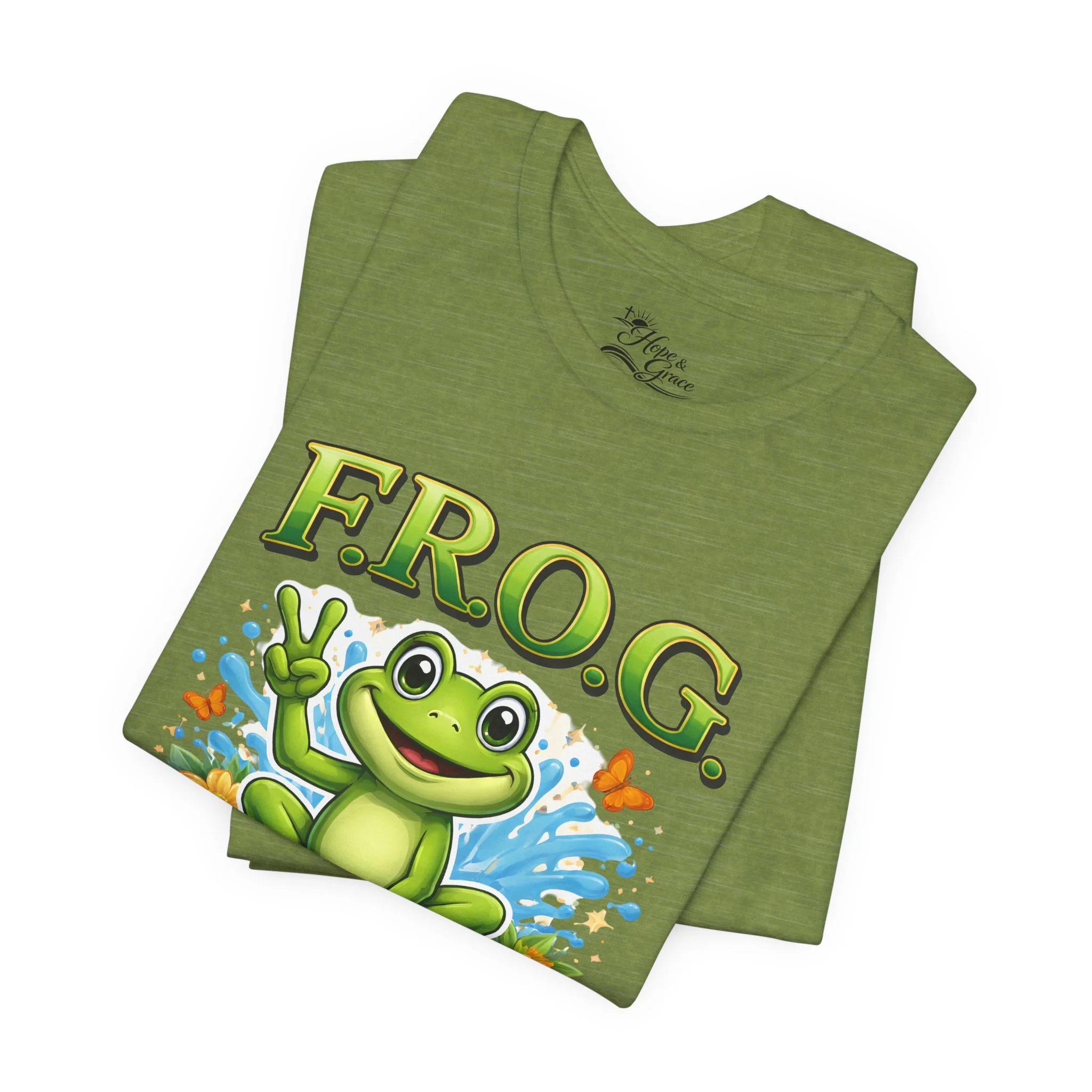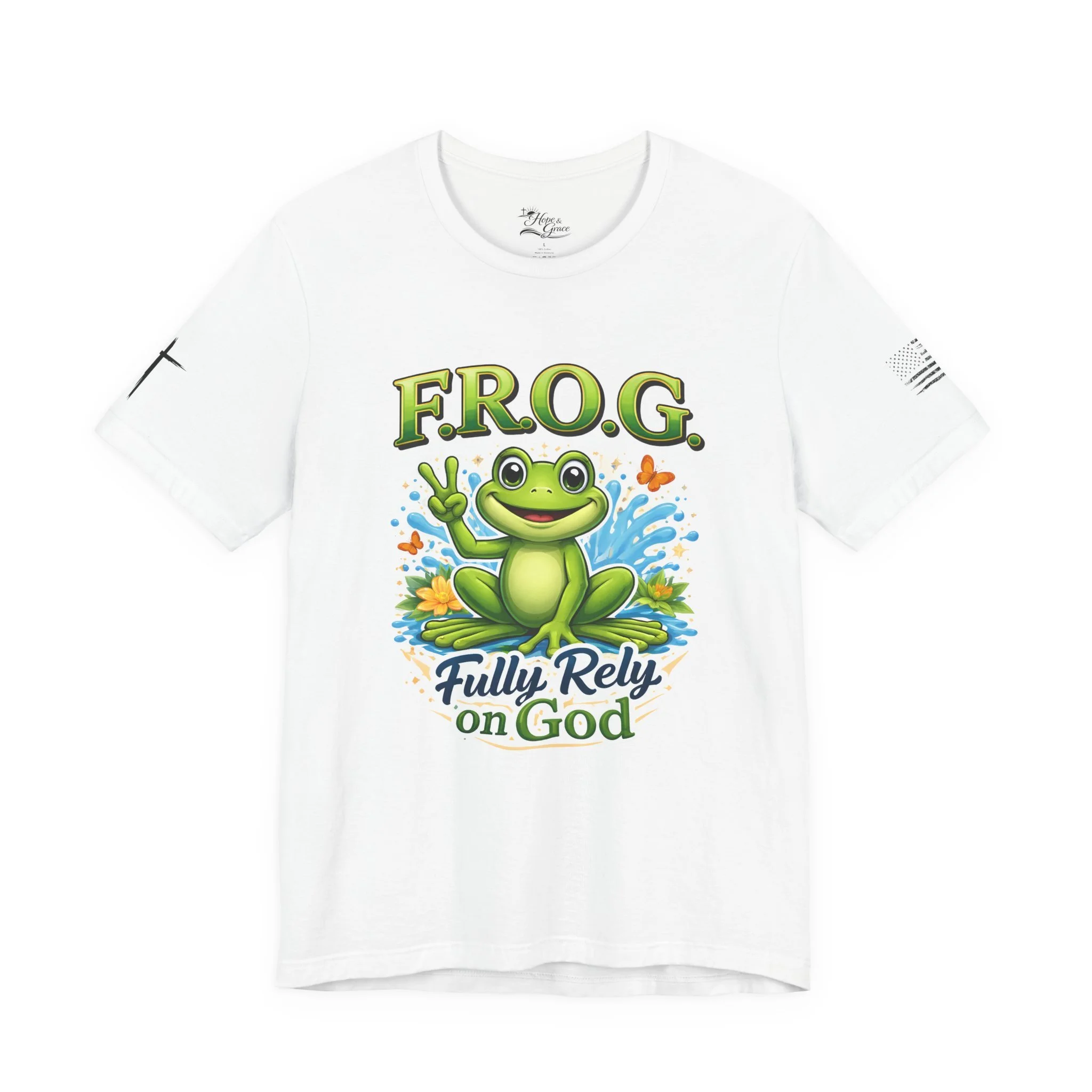 Lightweight, breathable, and soft — this tee brings playful faith-based charm to everyday wear. A cheerful cartoon frog sits amid splashy water and butterflies, hand raised in a peace sign under the bold headline “F.R.O.G.” with the phrase “Fully Rely on God” beneath. The shirt’s clean white canvas makes the vibrant greens and blues pop, while subtle sleeve graphics add an extra touch of personality. Wear it to church youth events, casual meetups, volunteer days, or lazy weekends to share a gentle, joyful faith statement without saying a word.
