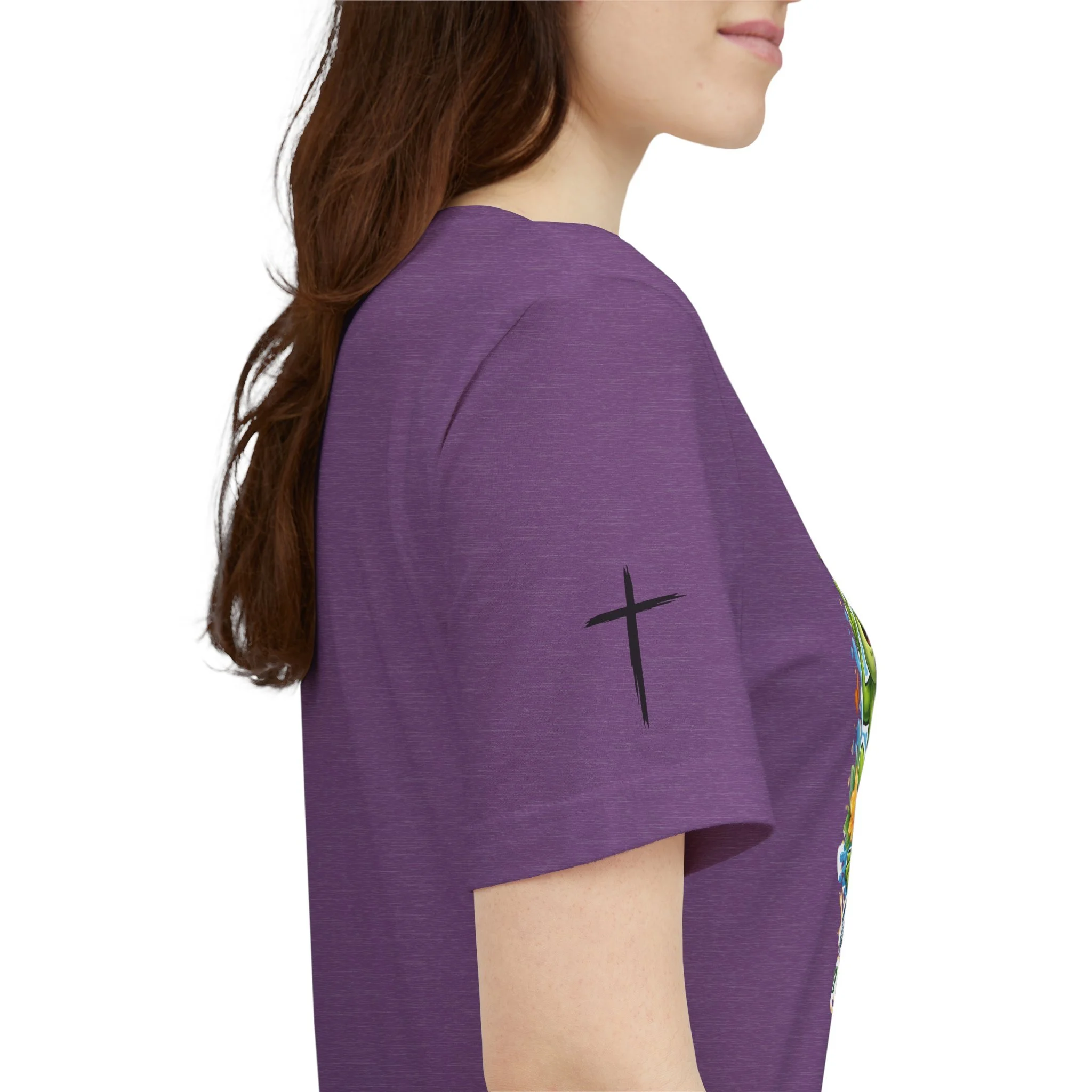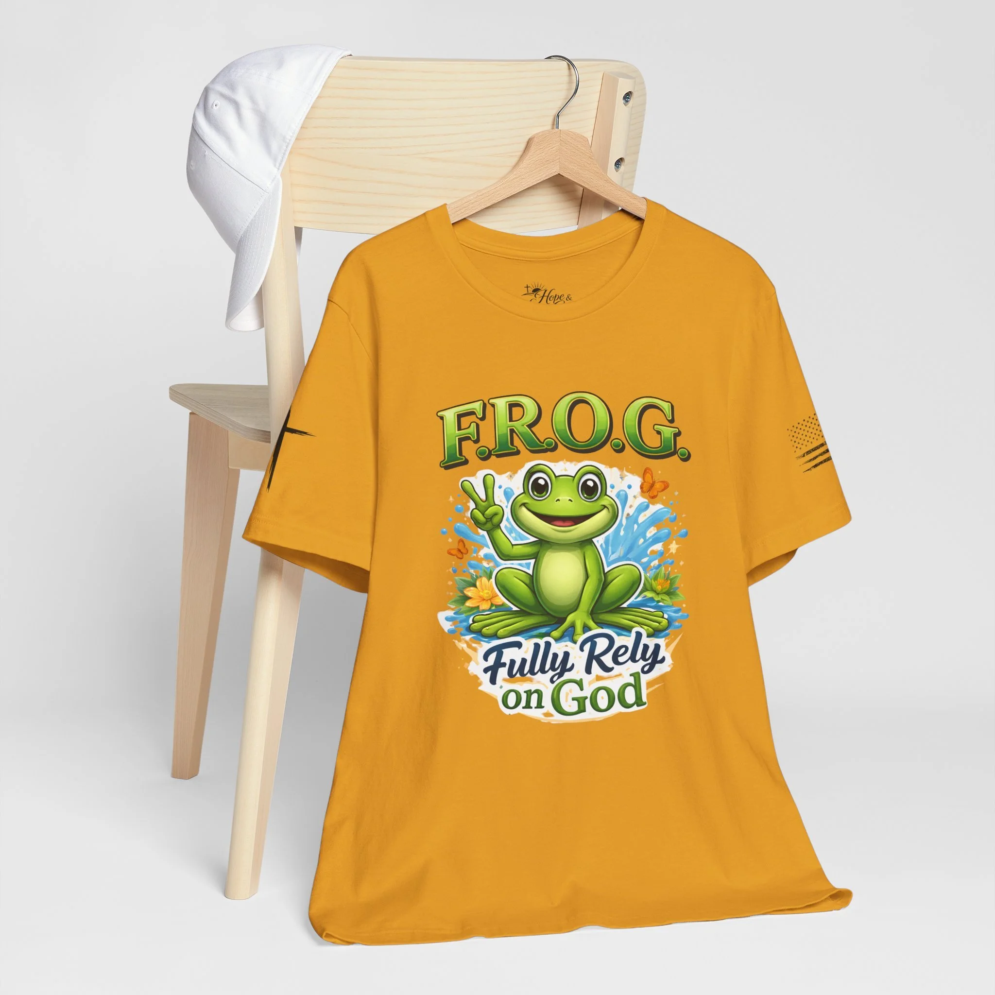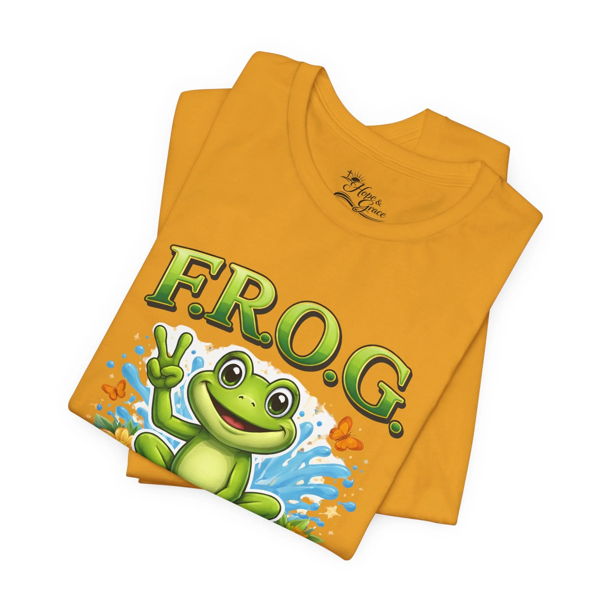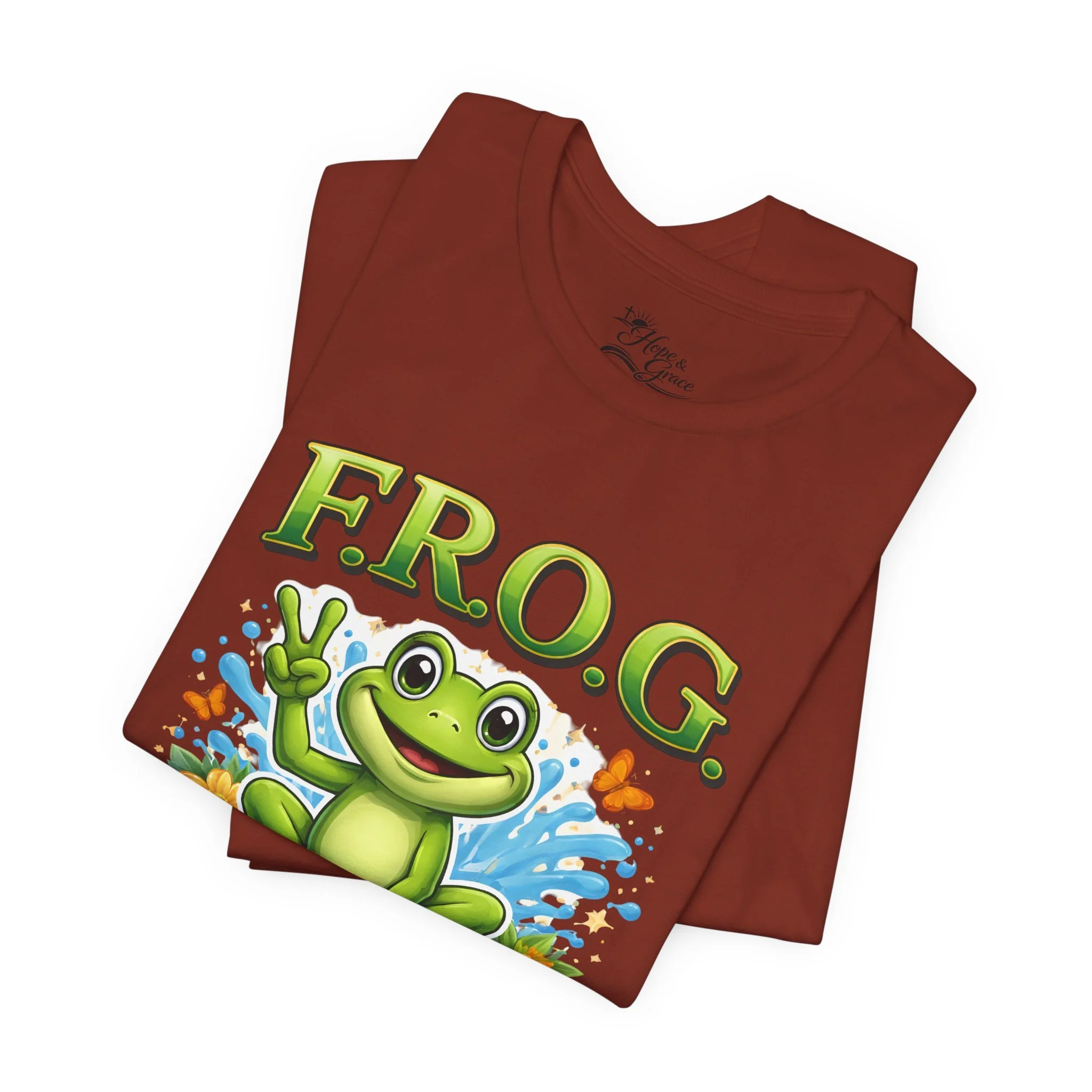 Lightweight, breathable, and soft — this tee brings playful faith-based charm to everyday wear. A cheerful cartoon frog sits amid splashy water and butterflies, hand raised in a peace sign under the bold headline “F.R.O.G.” with the phrase “Fully Rely on God” beneath. The shirt’s clean white canvas makes the vibrant greens and blues pop, while subtle sleeve graphics add an extra touch of personality. Wear it to church youth events, casual meetups, volunteer days, or lazy weekends to share a gentle, joyful faith statement without saying a word.