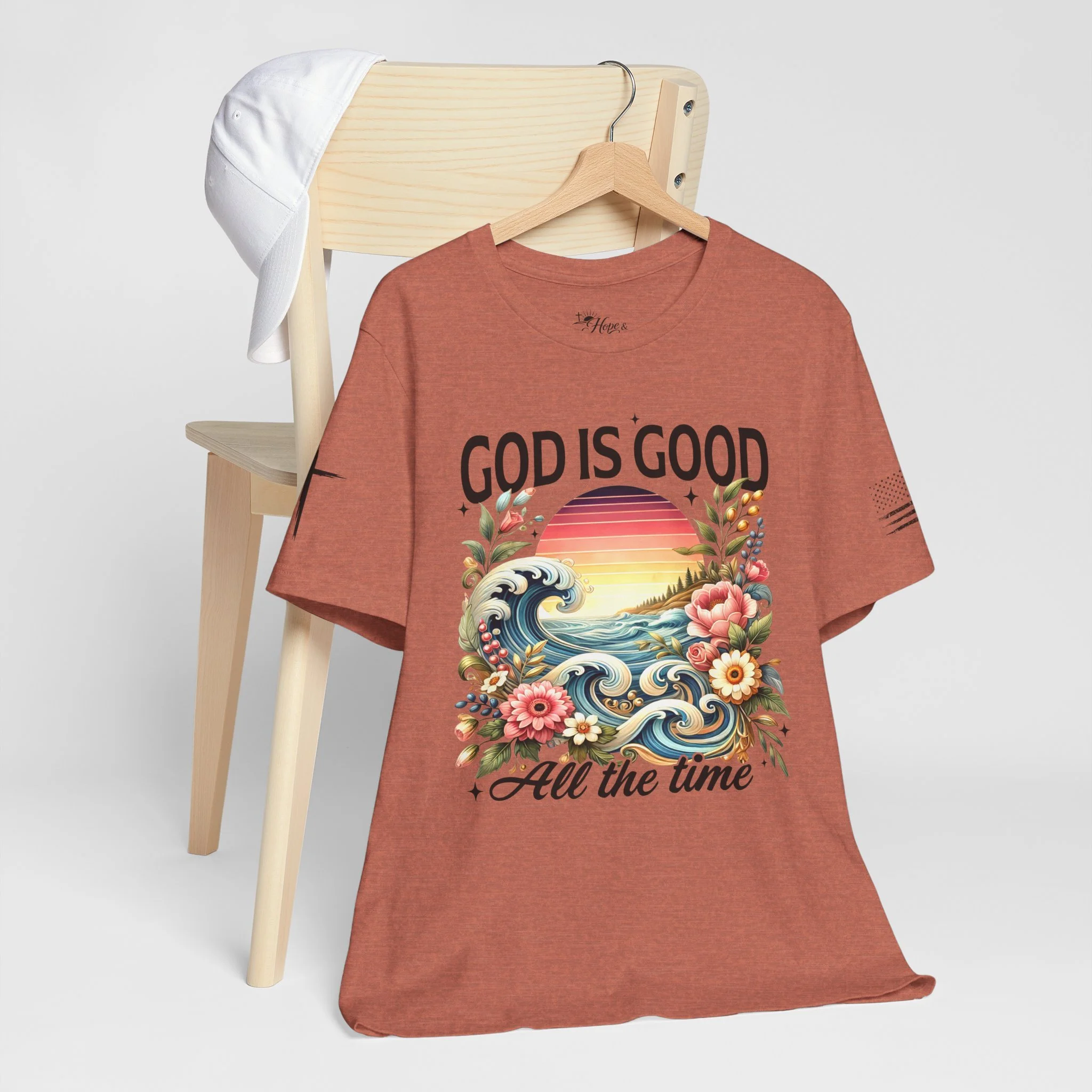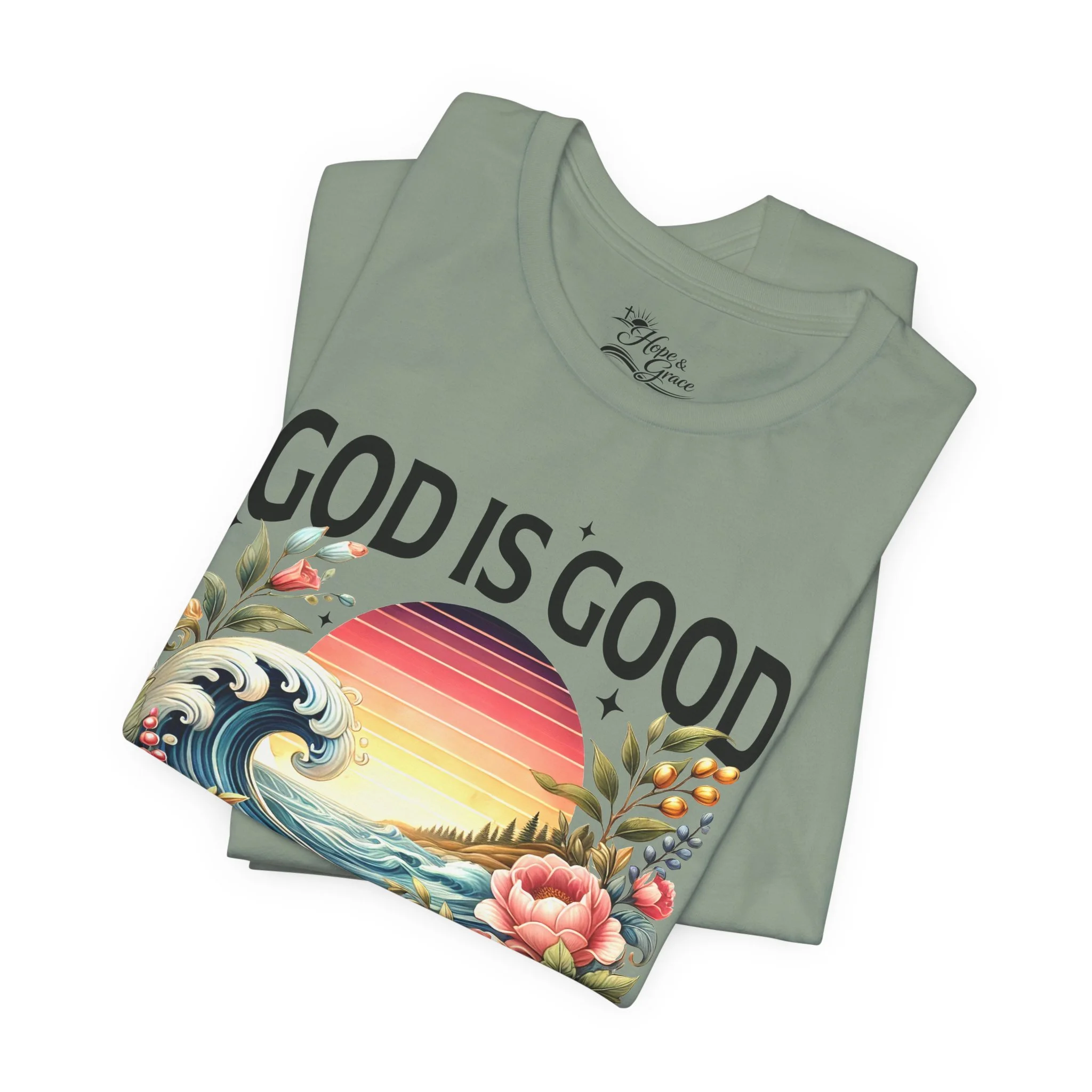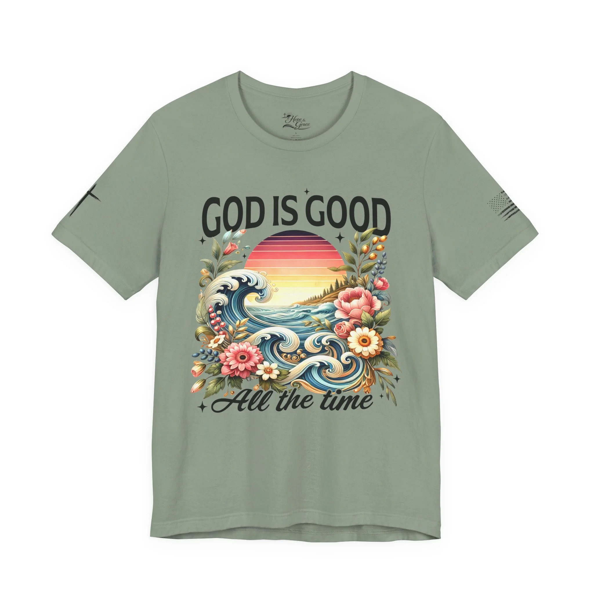 Lightweight and breathable, this crew-neck tee carries a bold, faith-forward design that feels both fresh and familiar. A retro sunrise and curling ocean waves bloom with vintage florals beneath the uplifting headline “GOD IS GOOD” and the cursive reminder “All the time.” The soft Airlume combed cotton drapes easily for everyday wear, while side seams, ribbed collar, and shoulder tape keep the shirt looking neat wash after wash. Subtle sleeve markings add an artisanal touch without overpowering the central artwork. Wear it to quiet mornings, church gatherings, outreach events, or when you want to carry a gentle, hopeful message through your day.