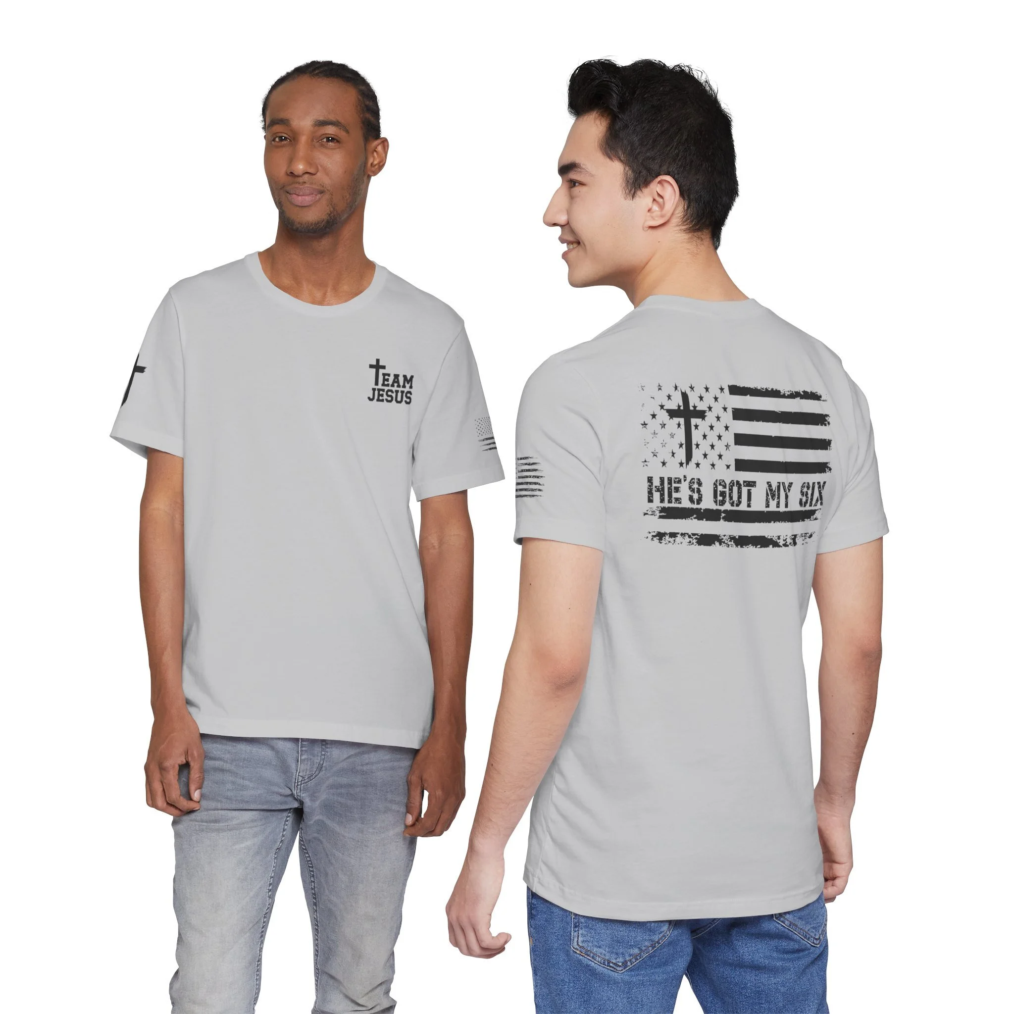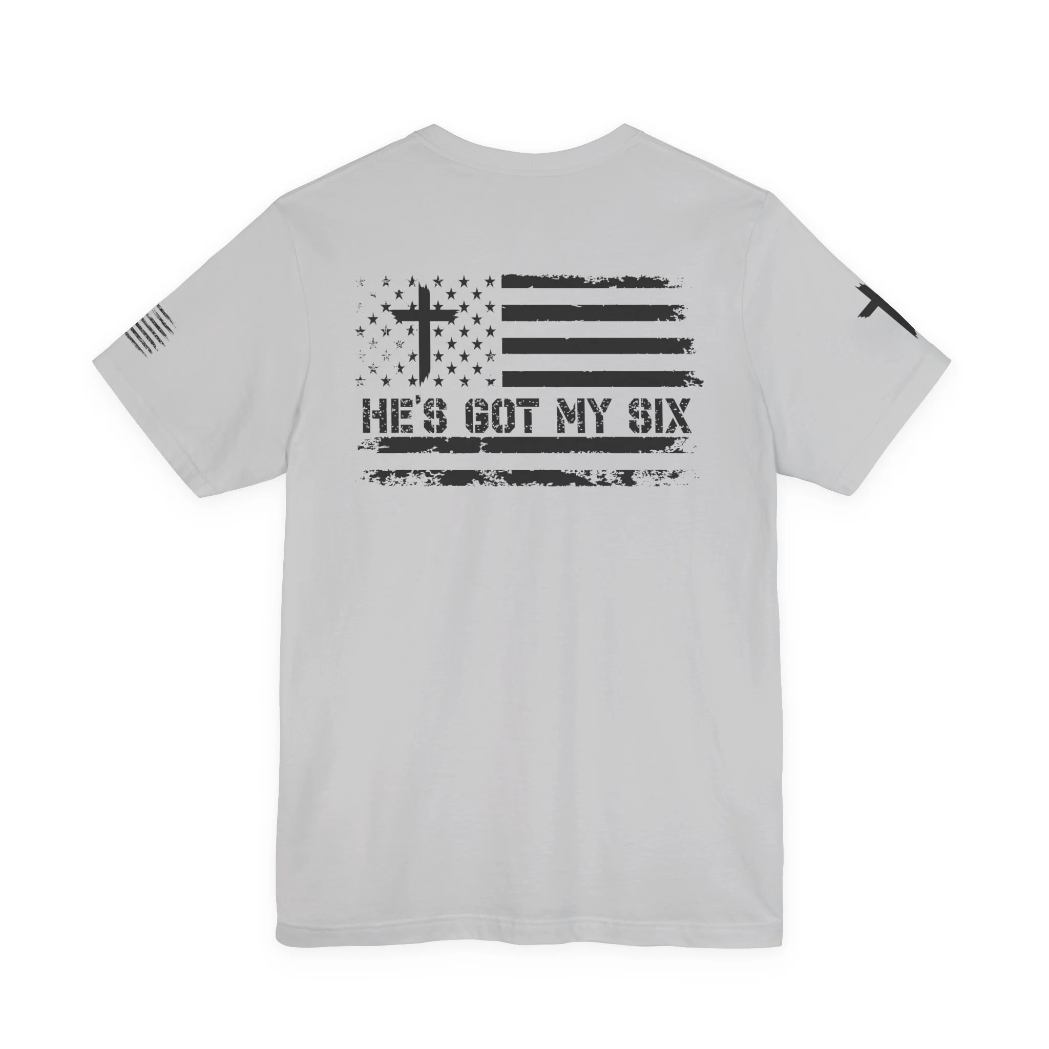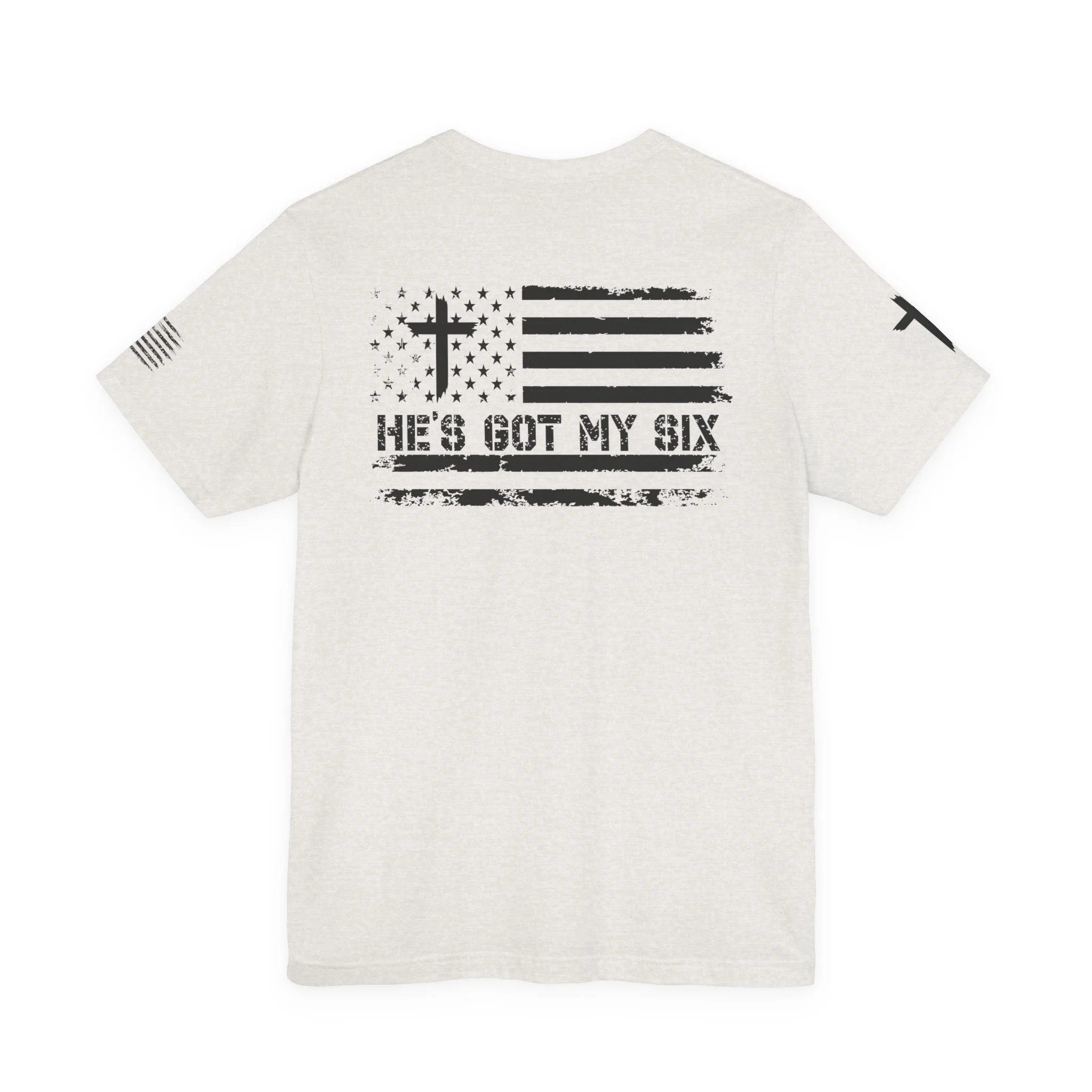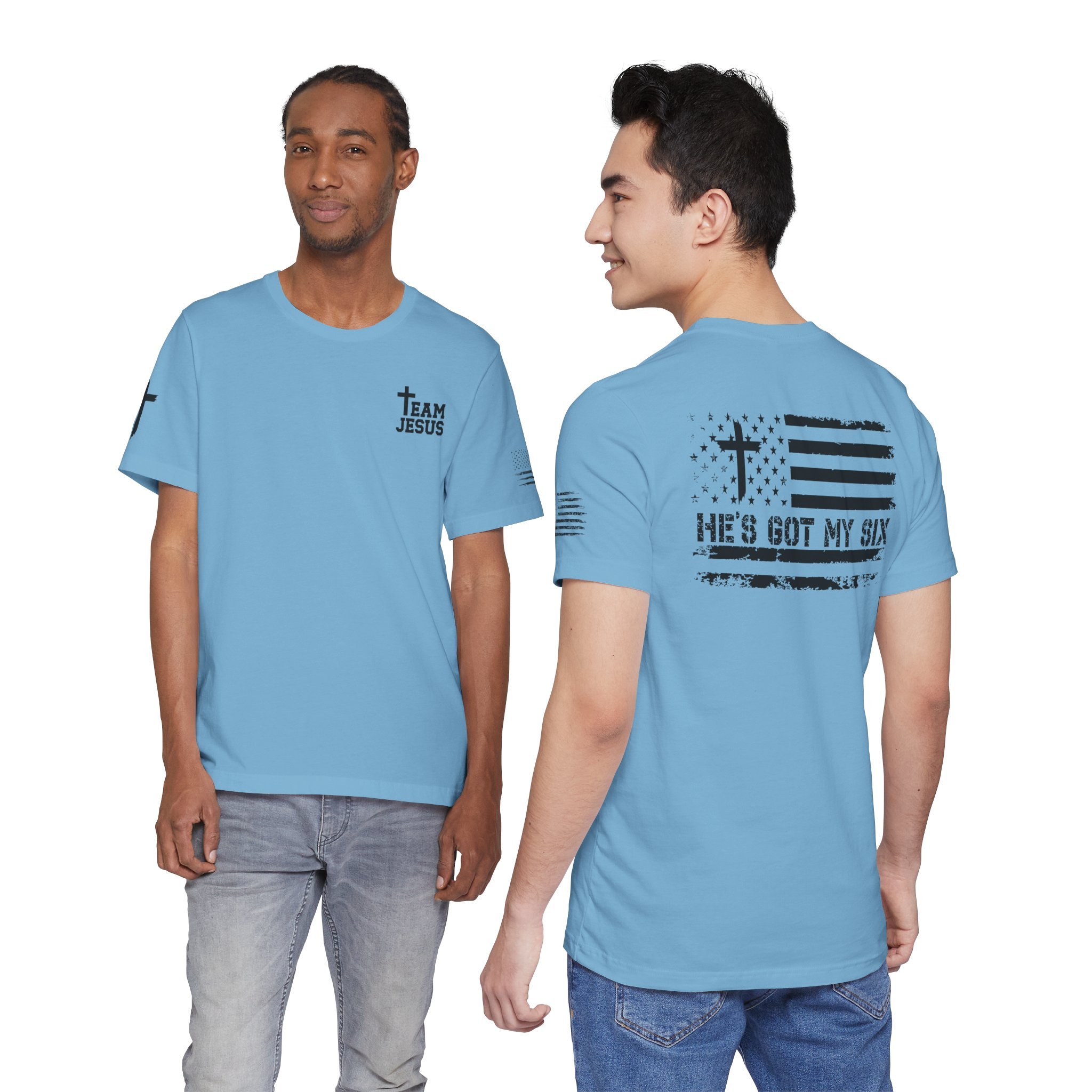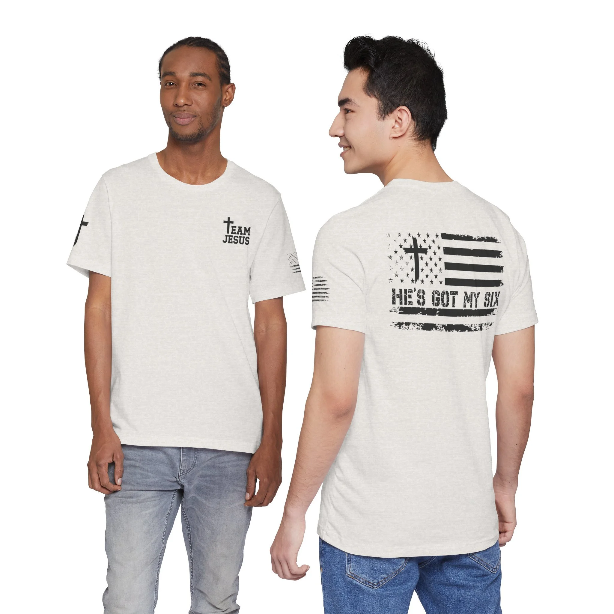 This lightweight crew-neck tee carries a quiet, confident faith-forward design made to be worn daily. Breathable Airlume combed cotton keeps you comfortable through service, volunteer shifts, or weekend errands. The front chest features a simple cross with “Team Jesus,” while the back shows a distressed flag and the phrase “He’s Got My Six,” a subtle statement of faith and camaraderie. Clean sleeve accents complete the look so it layers easily under jackets or wears alone for a straightforward, wearable witness.