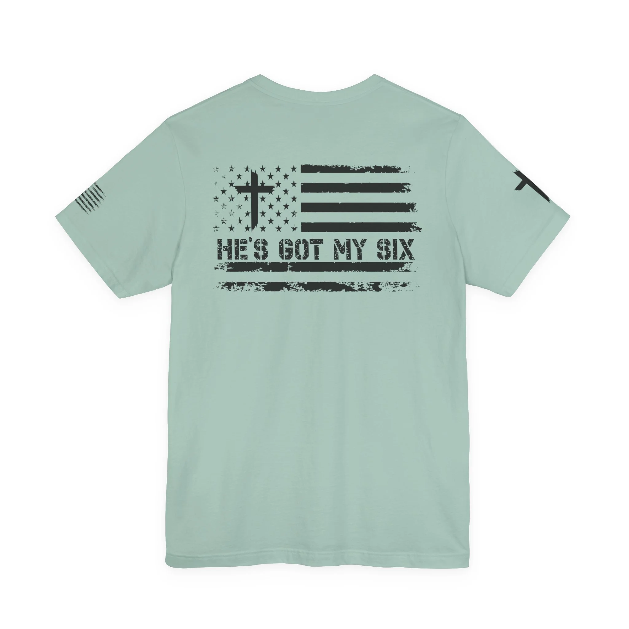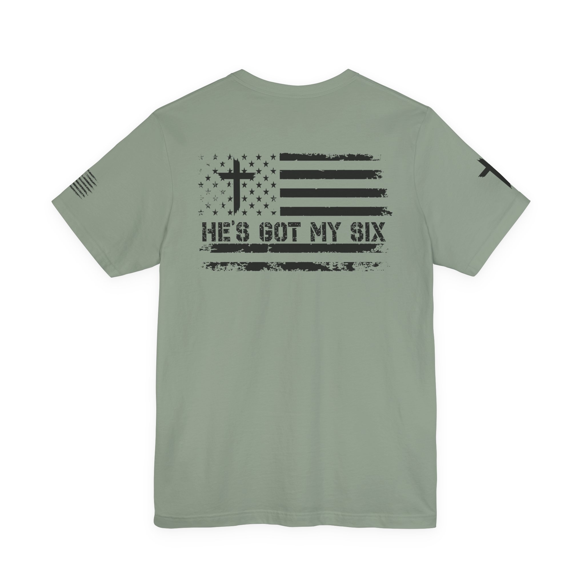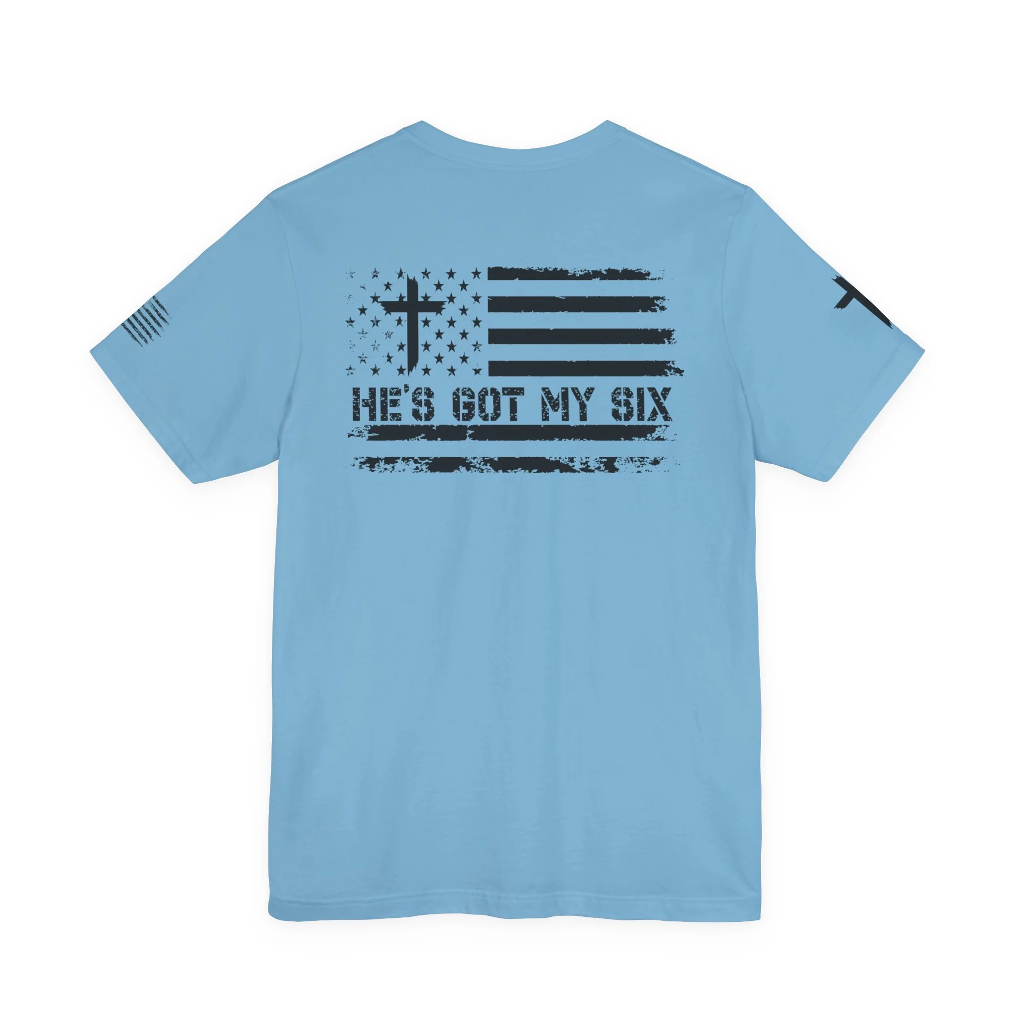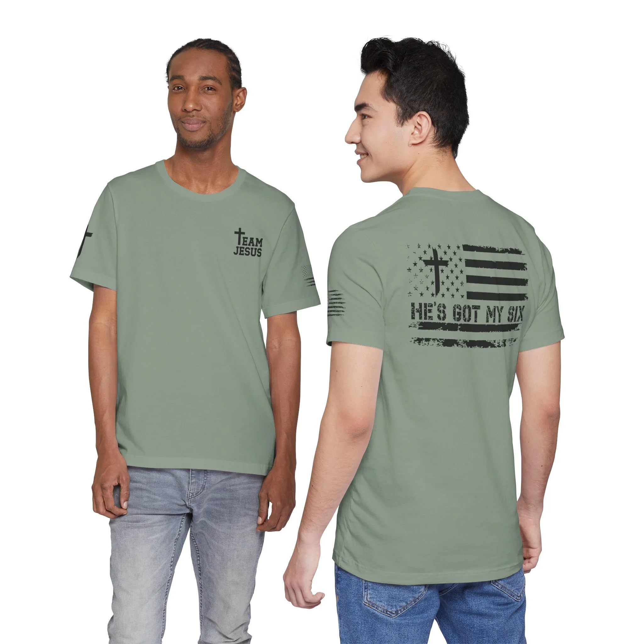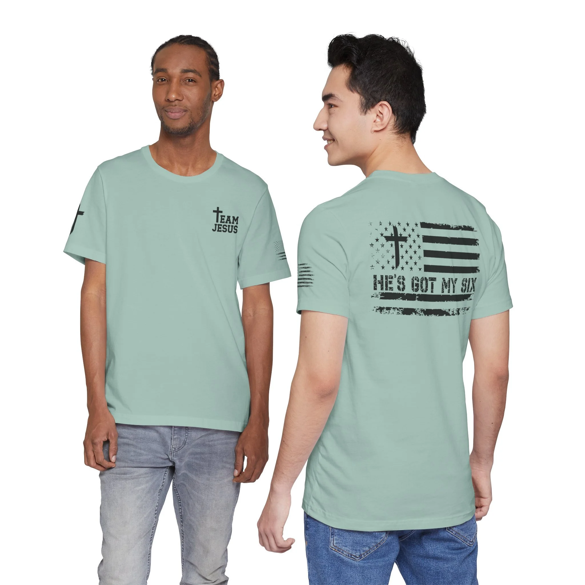 This lightweight crew-neck tee carries a quiet, confident faith-forward design made to be worn daily. Breathable Airlume combed cotton keeps you comfortable through service, volunteer shifts, or weekend errands. The front chest features a simple cross with “Team Jesus,” while the back shows a distressed flag and the phrase “He’s Got My Six,” a subtle statement of faith and camaraderie. Clean sleeve accents complete the look so it layers easily under jackets or wears alone for a straightforward, wearable witness.