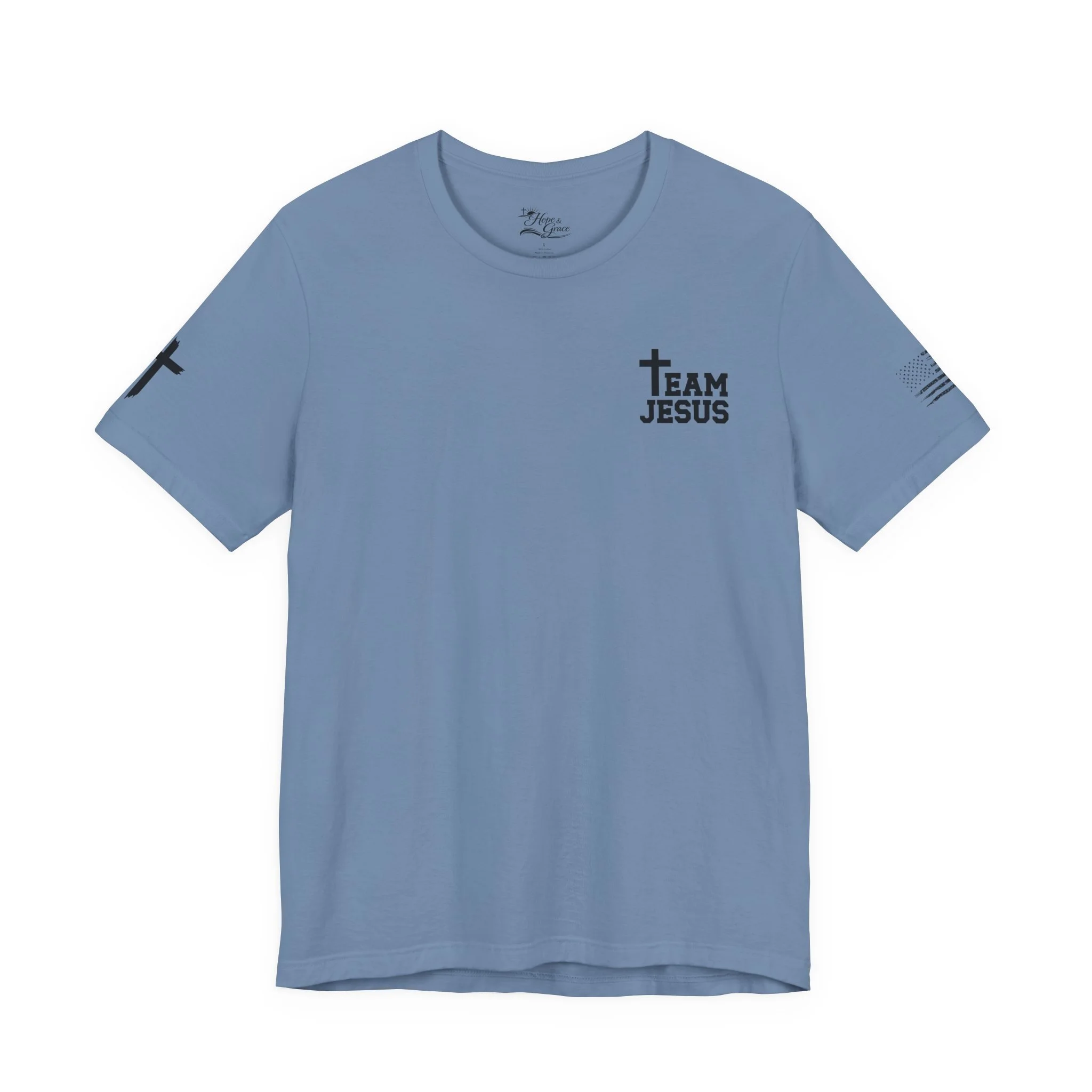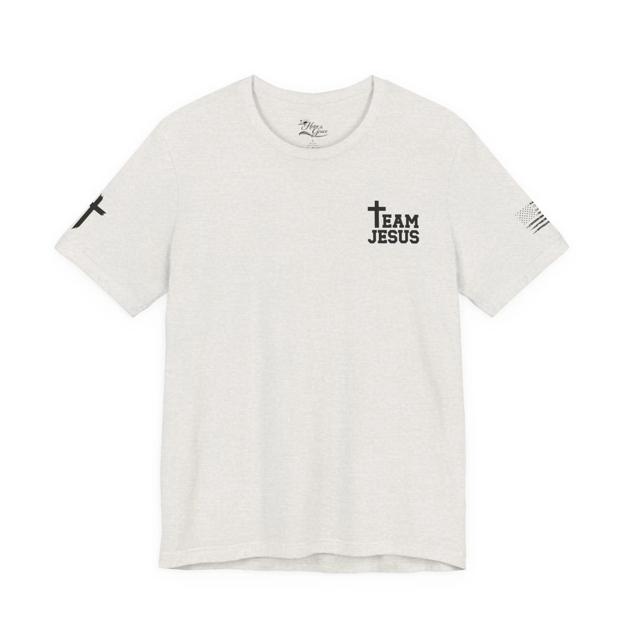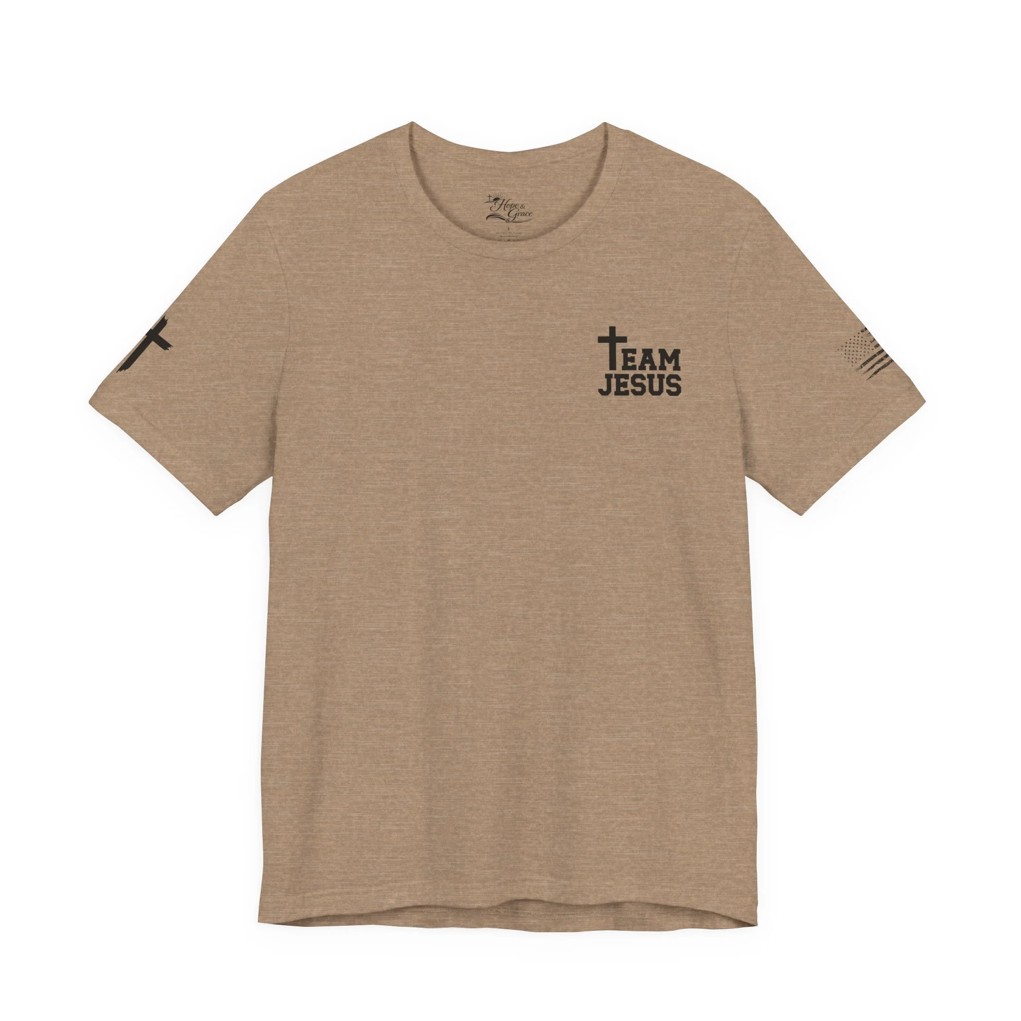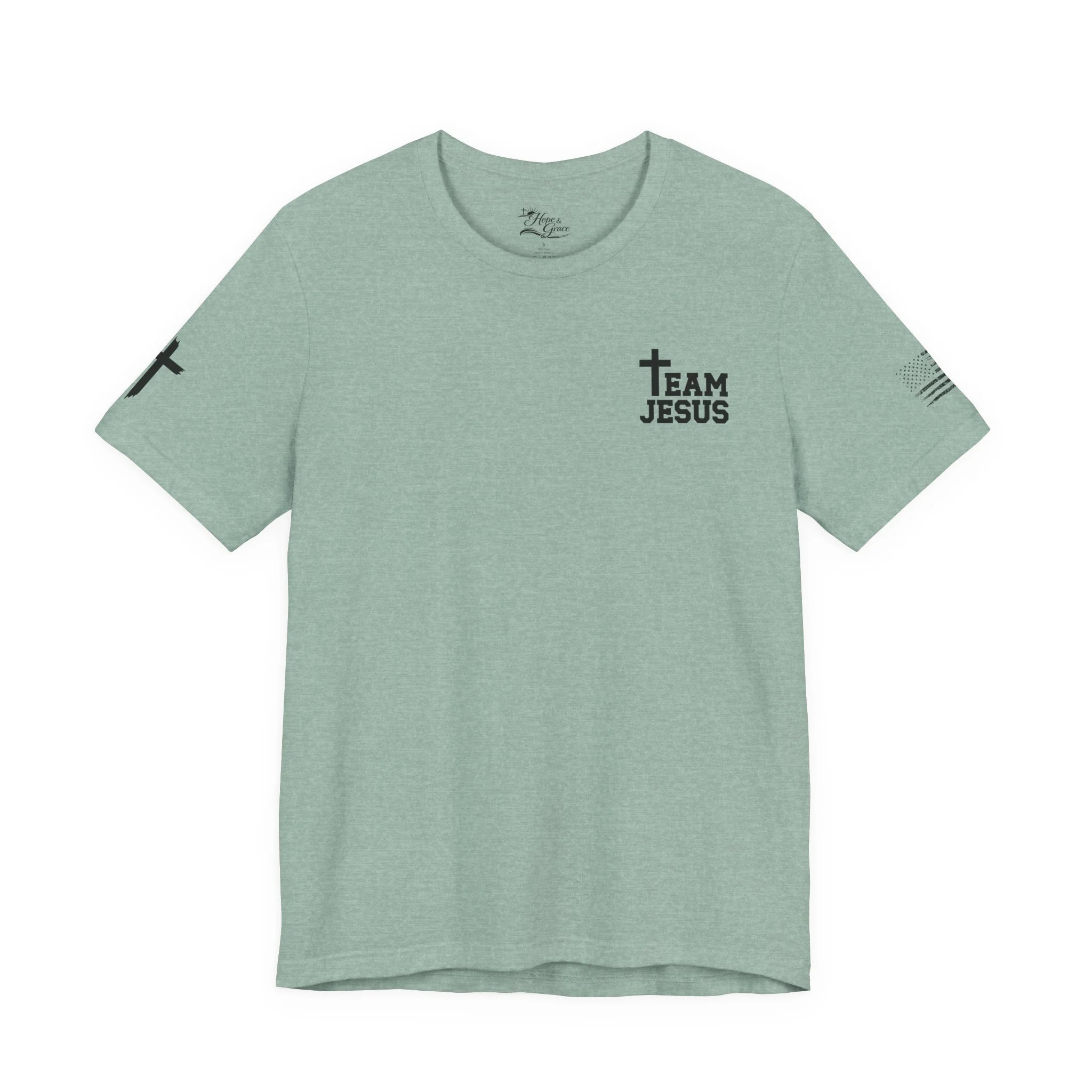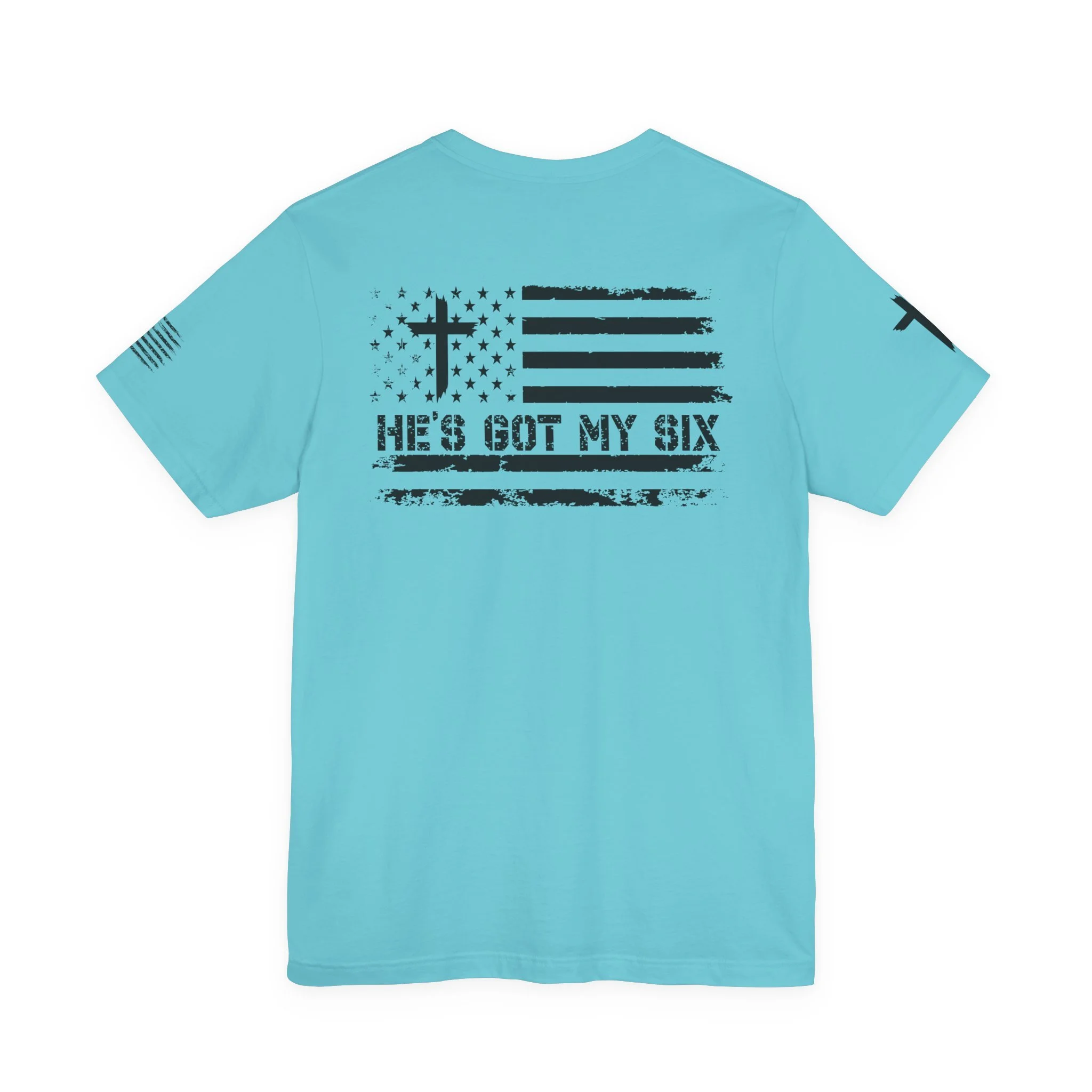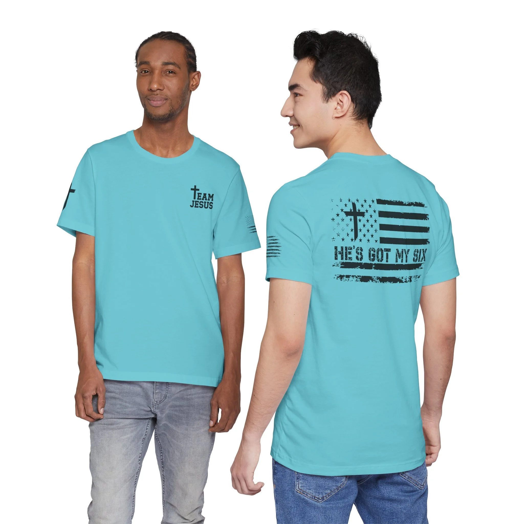 This lightweight crew-neck tee carries a quiet, confident faith-forward design made to be worn daily. Breathable Airlume combed cotton keeps you comfortable through service, volunteer shifts, or weekend errands. The front chest features a simple cross with “Team Jesus,” while the back shows a distressed flag and the phrase “He’s Got My Six,” a subtle statement of faith and camaraderie. Clean sleeve accents complete the look so it layers easily under jackets or wears alone for a straightforward, wearable witness.