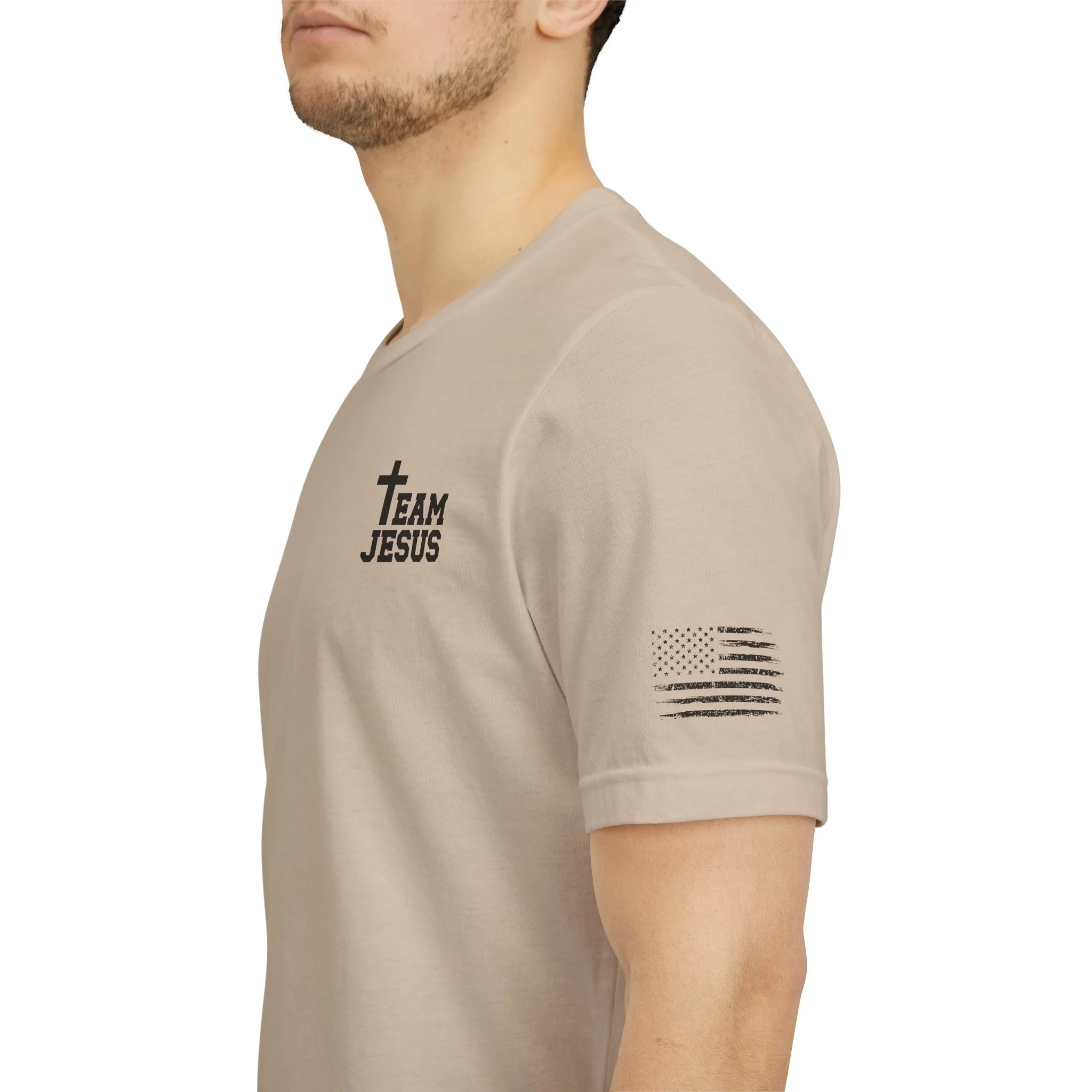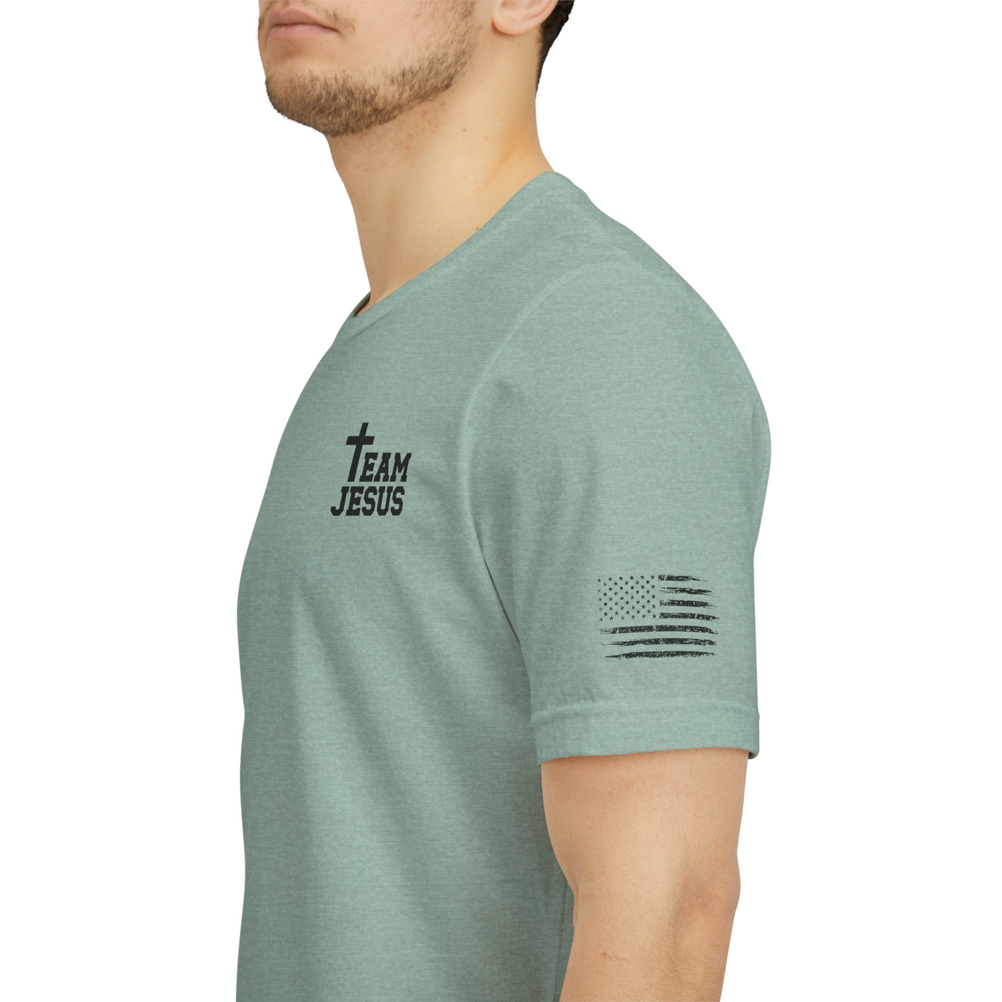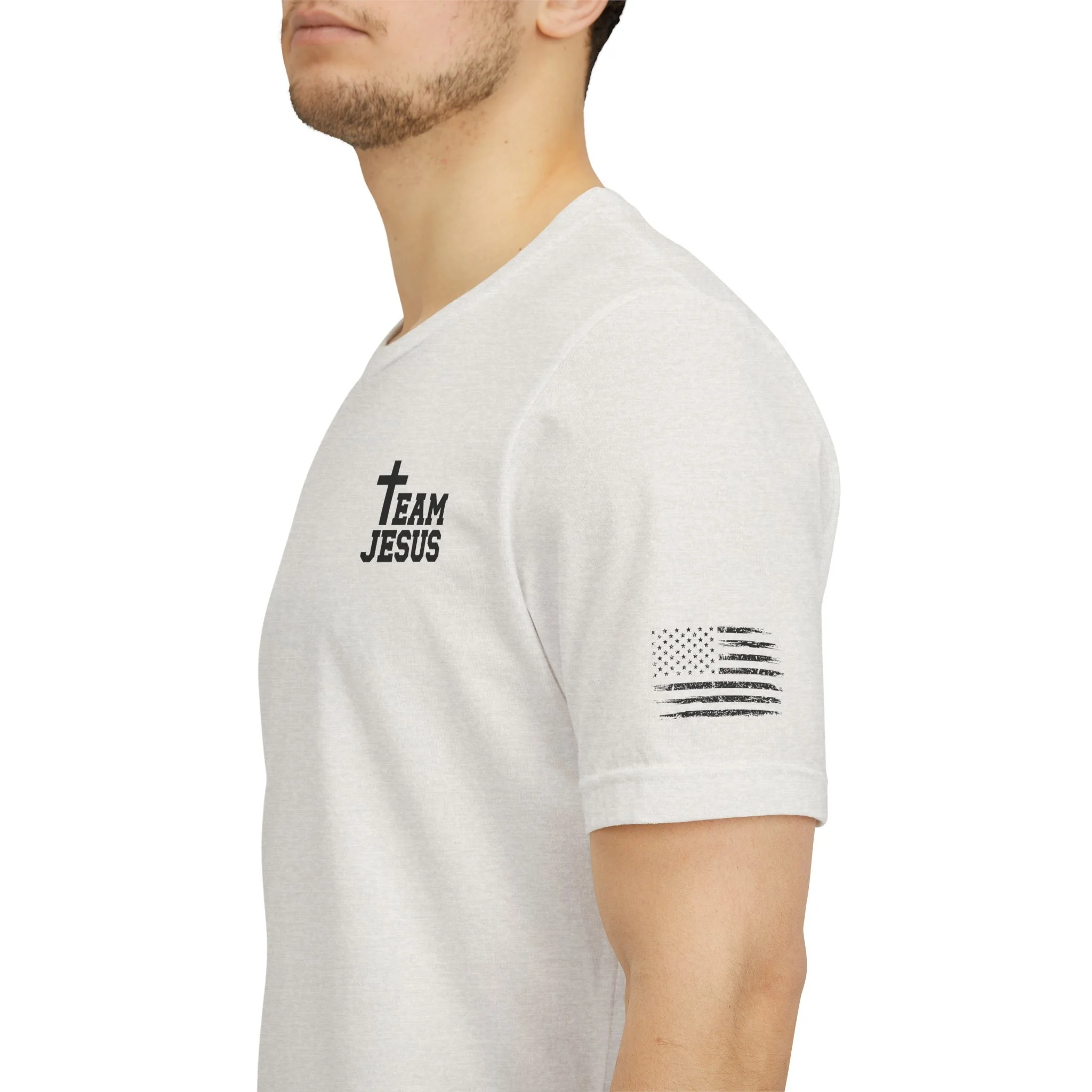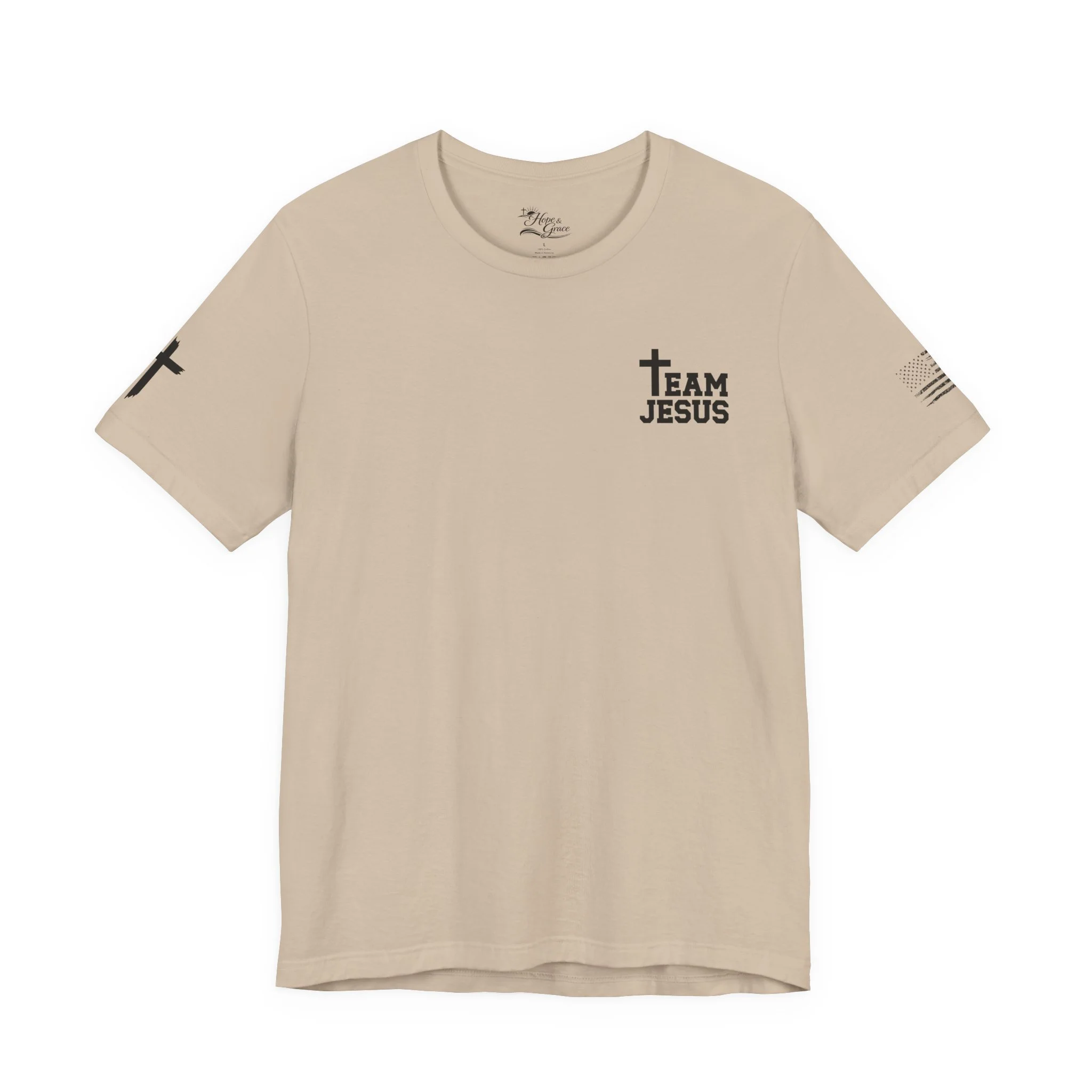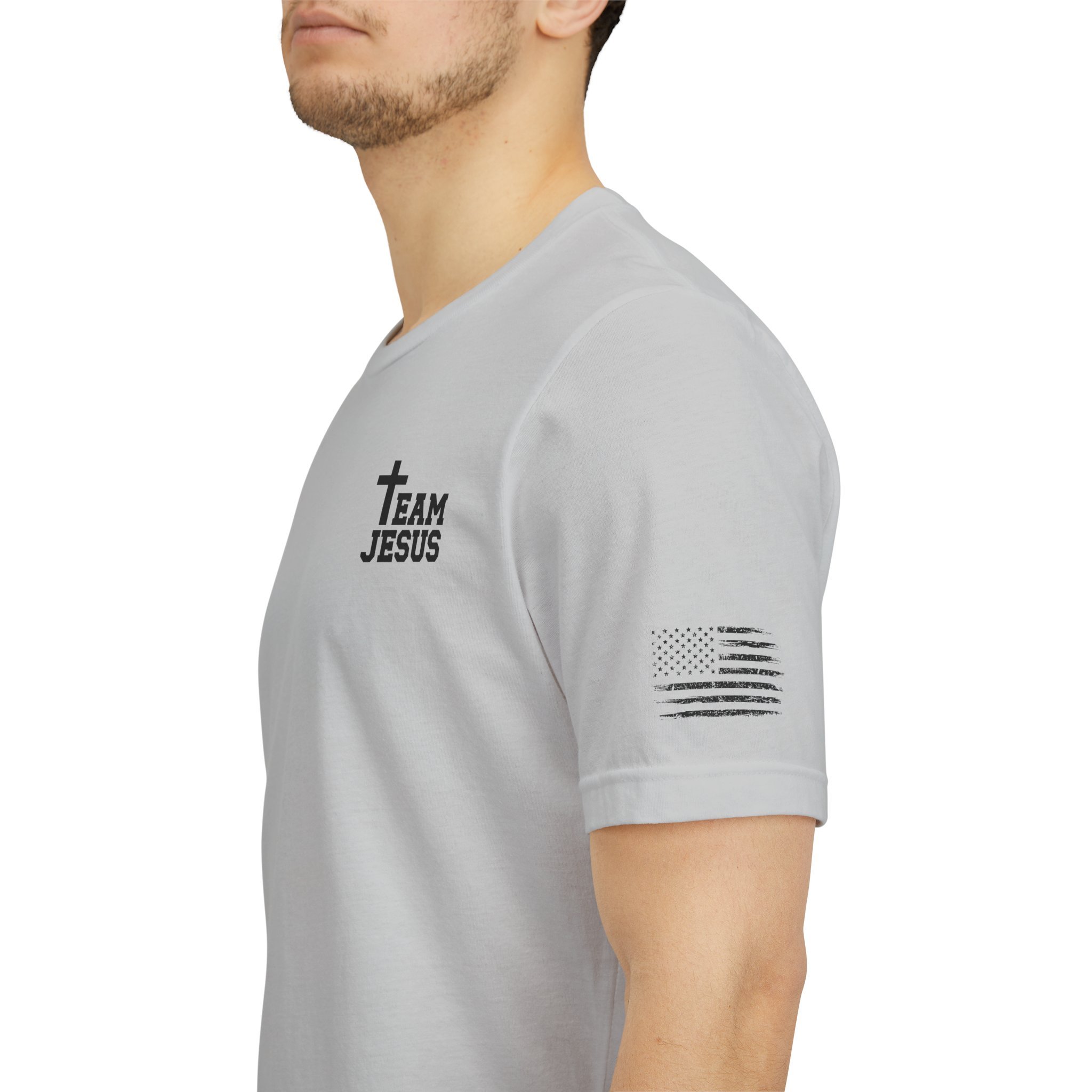 This lightweight crew-neck tee carries a quiet, confident faith-forward design made to be worn daily. Breathable Airlume combed cotton keeps you comfortable through service, volunteer shifts, or weekend errands. The front chest features a simple cross with “Team Jesus,” while the back shows a distressed flag and the phrase “He’s Got My Six,” a subtle statement of faith and camaraderie. Clean sleeve accents complete the look so it layers easily under jackets or wears alone for a straightforward, wearable witness.