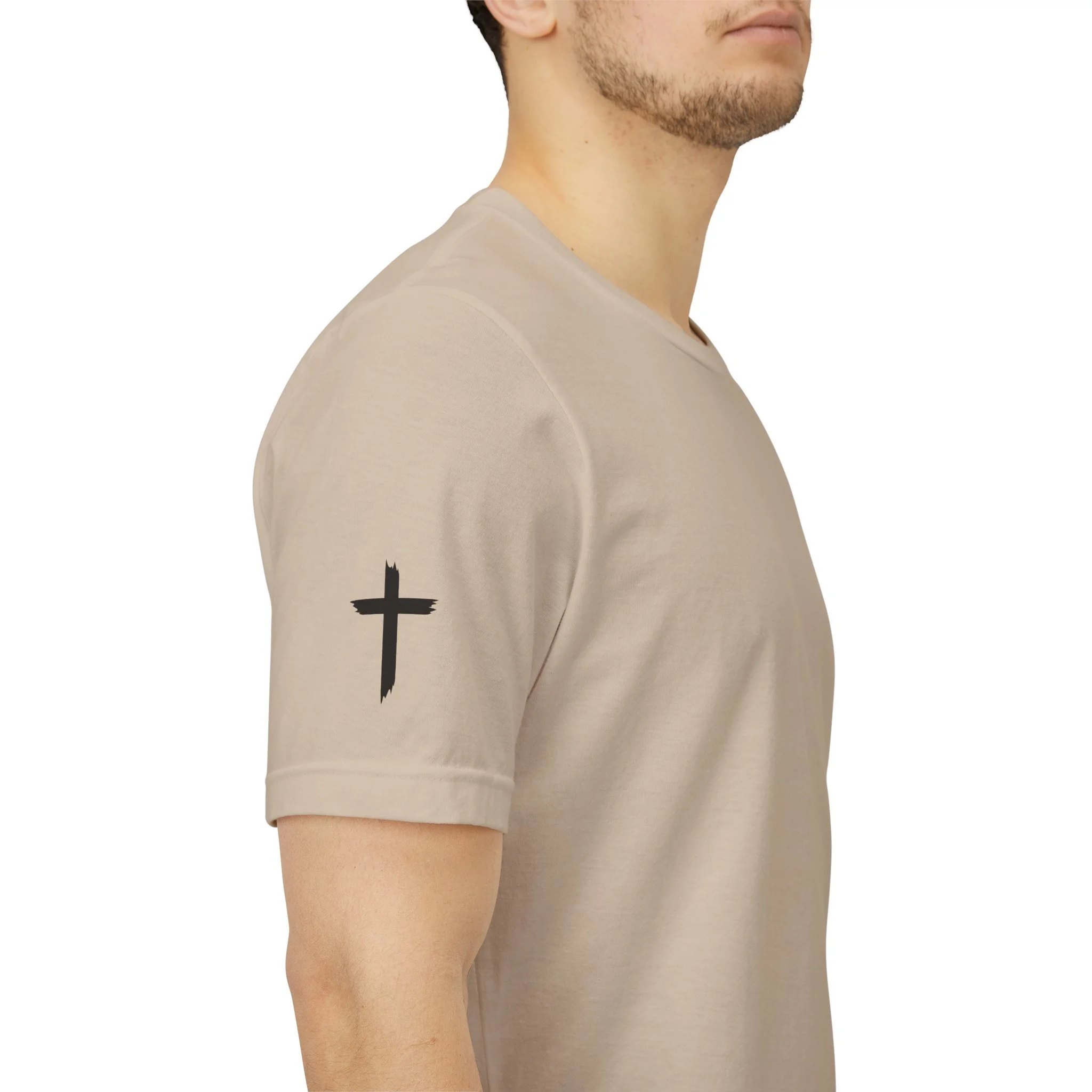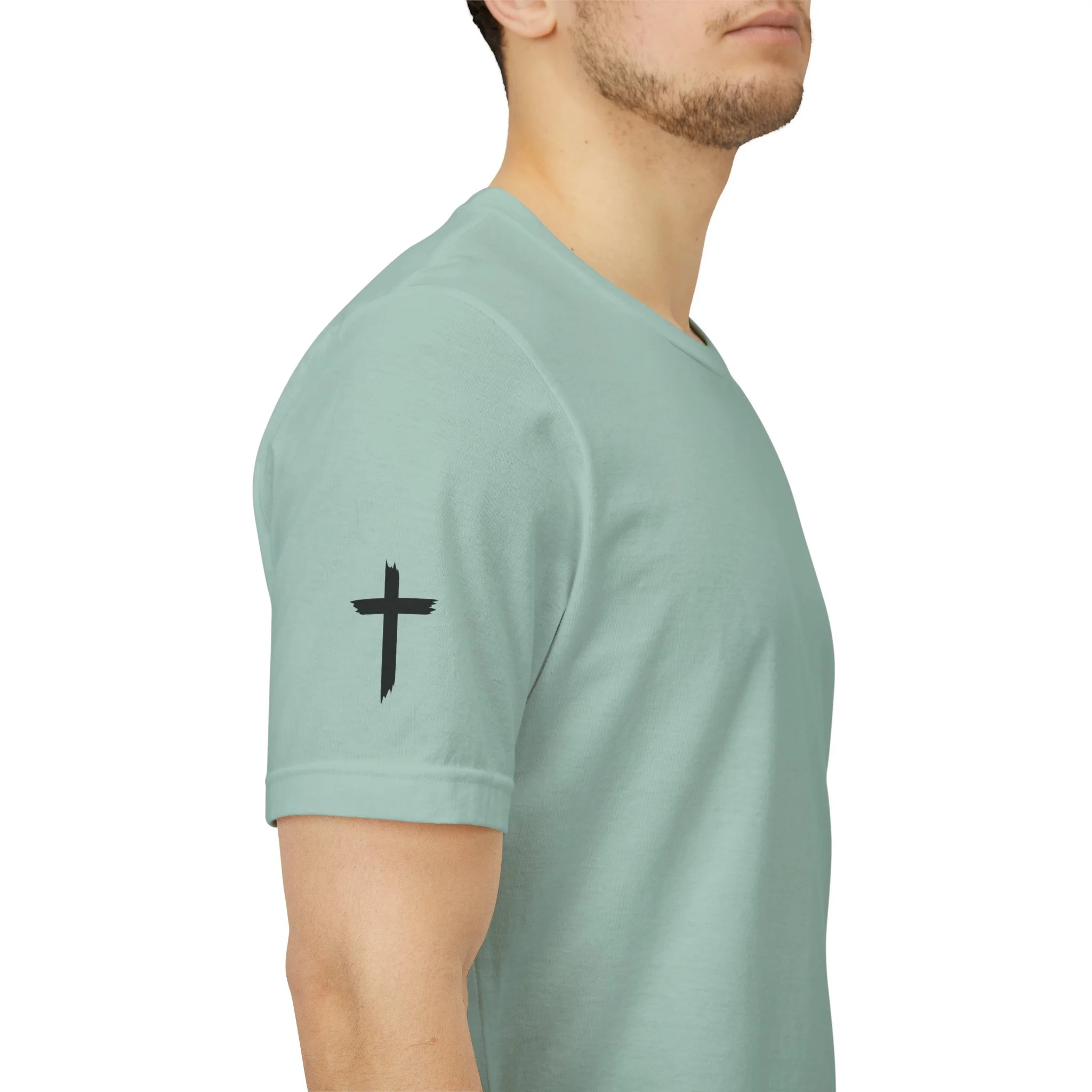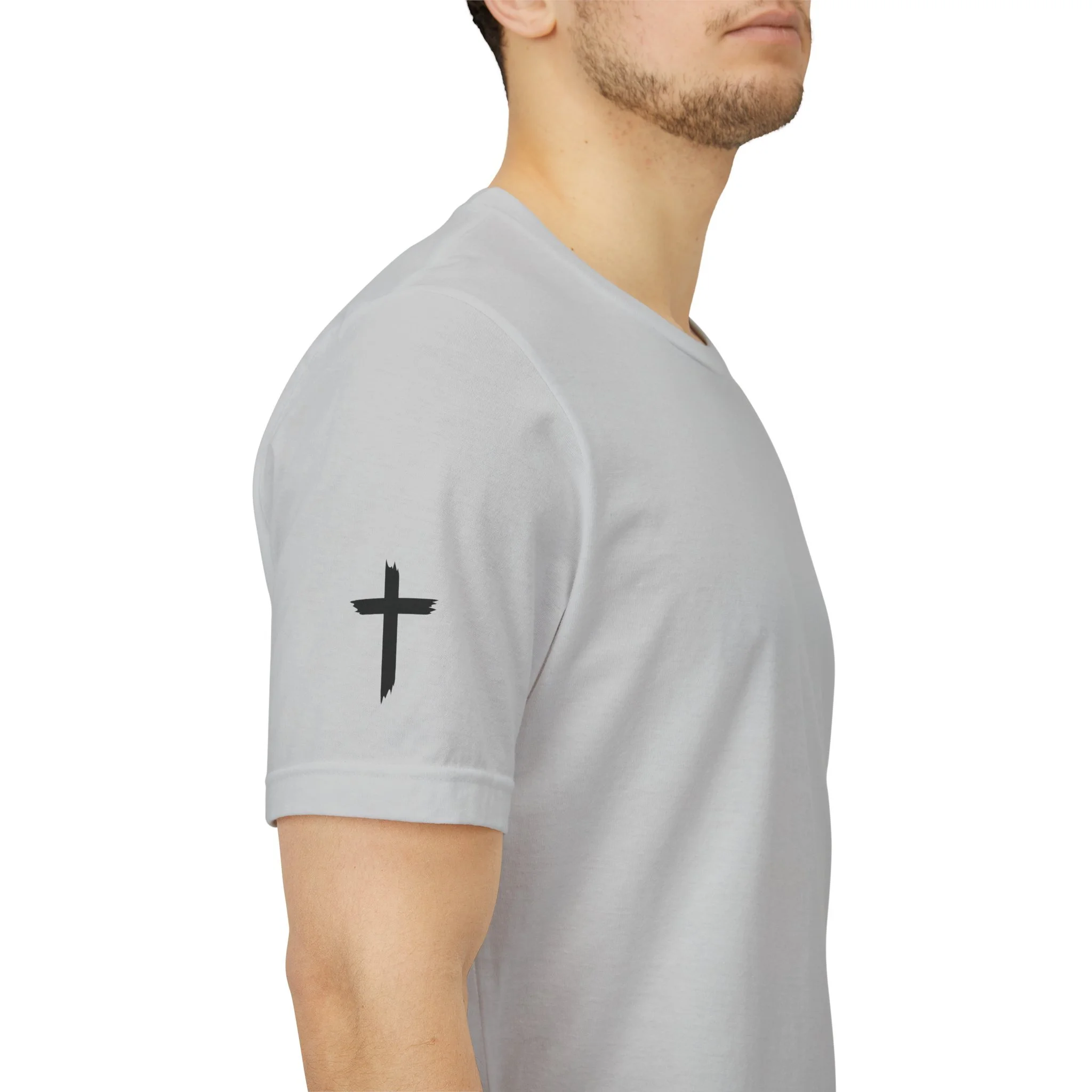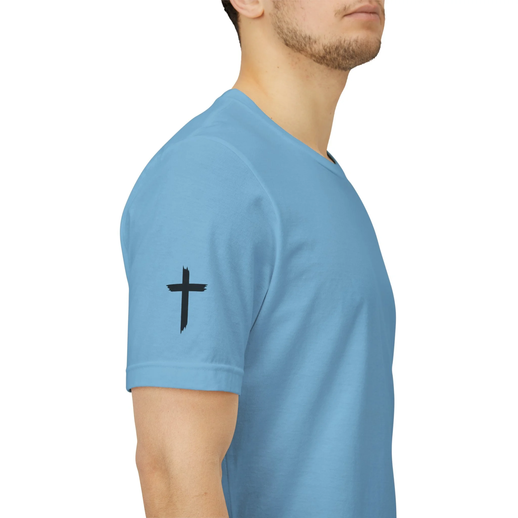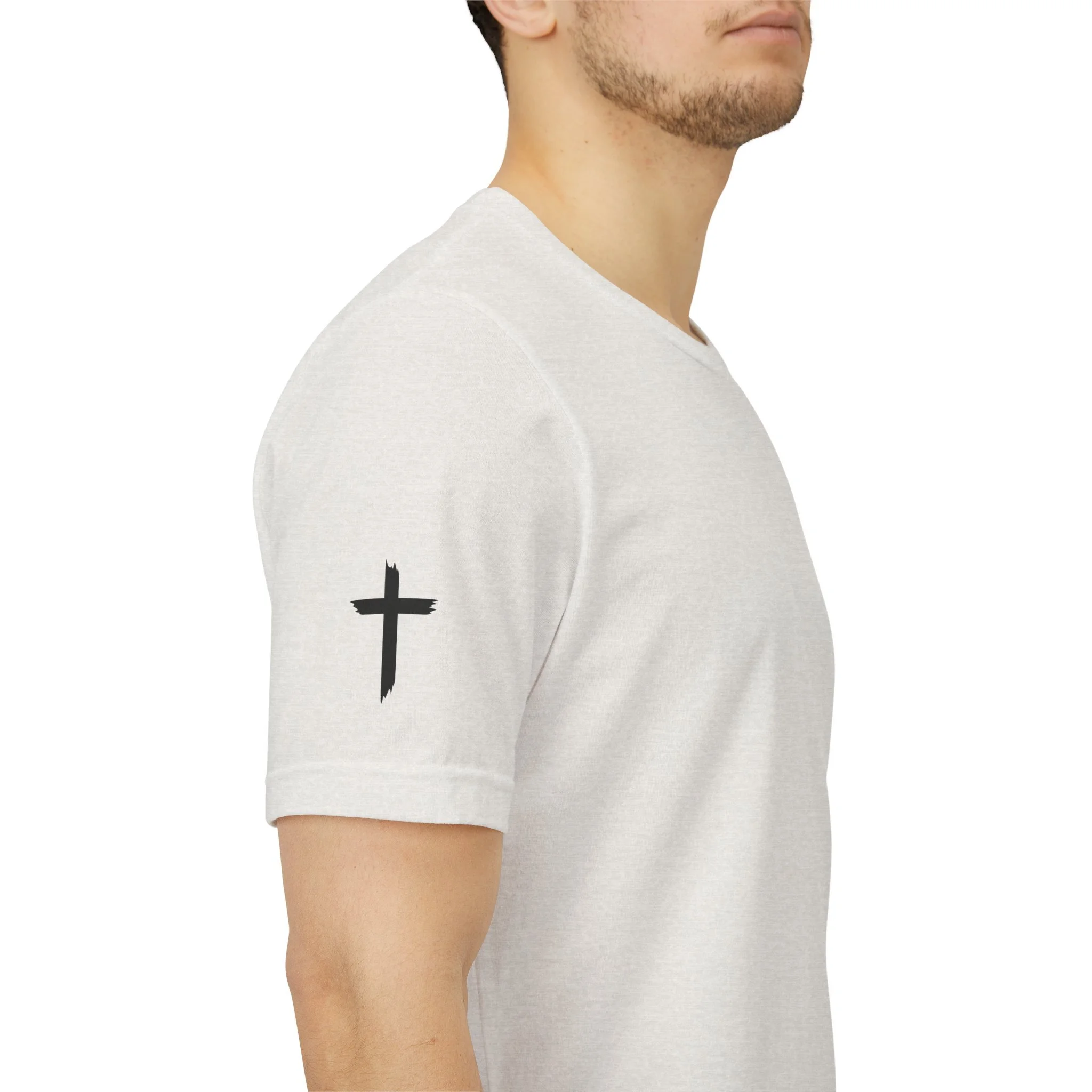 This lightweight crew-neck tee carries a quiet, confident faith-forward design made to be worn daily. Breathable Airlume combed cotton keeps you comfortable through service, volunteer shifts, or weekend errands. The front chest features a simple cross with “Team Jesus,” while the back shows a distressed flag and the phrase “He’s Got My Six,” a subtle statement of faith and camaraderie. Clean sleeve accents complete the look so it layers easily under jackets or wears alone for a straightforward, wearable witness.