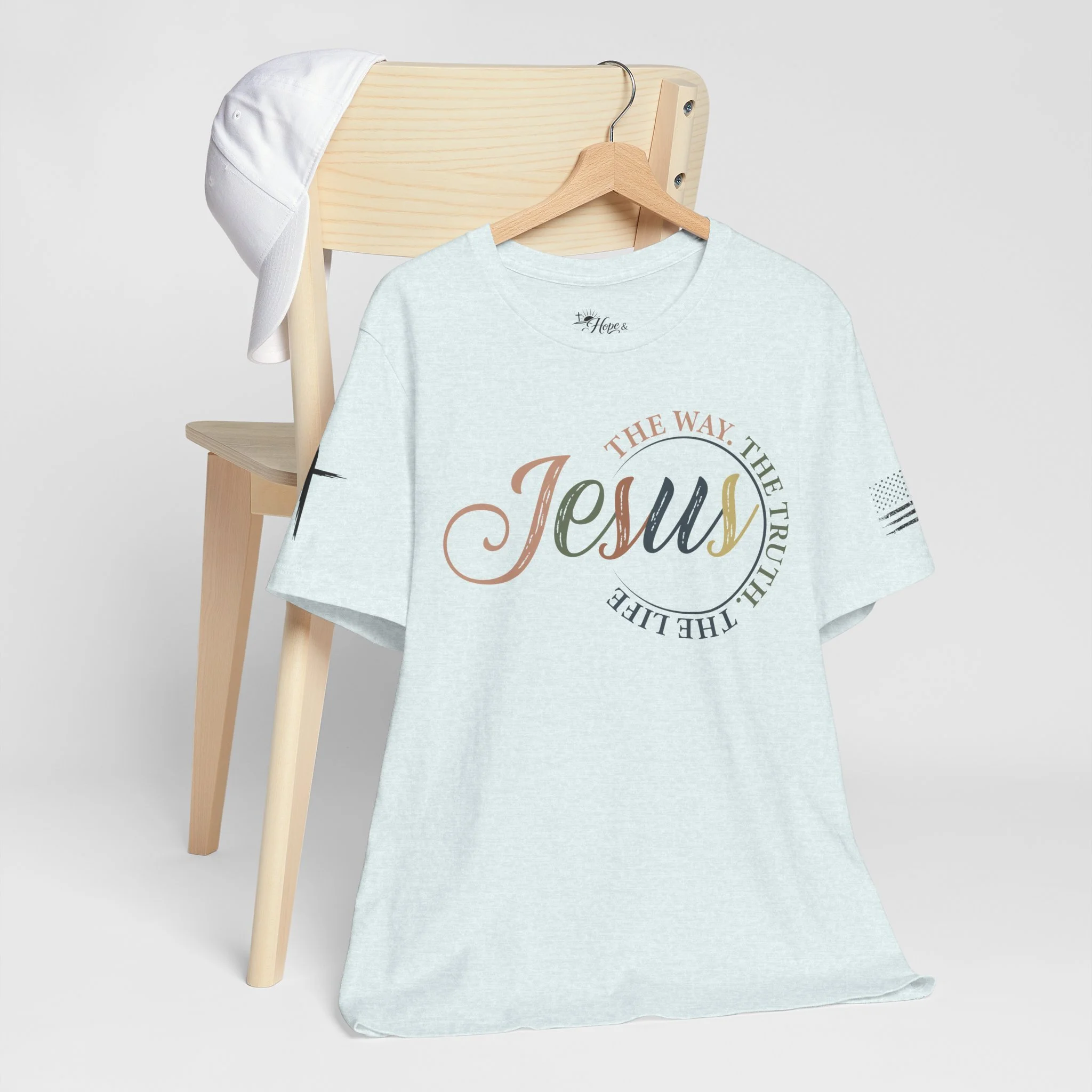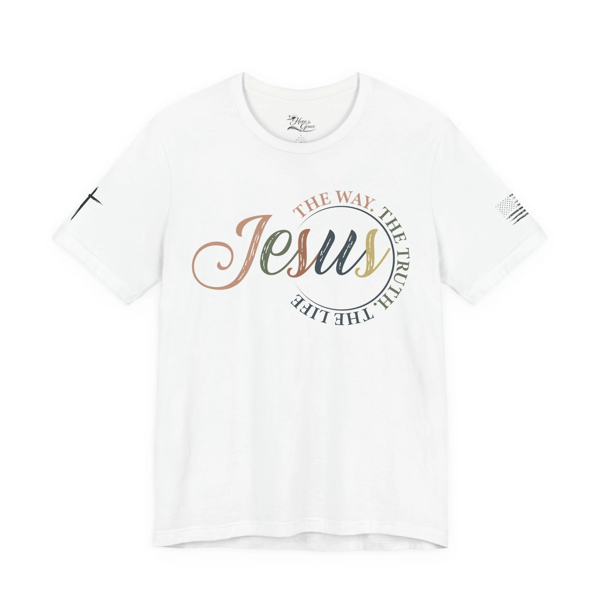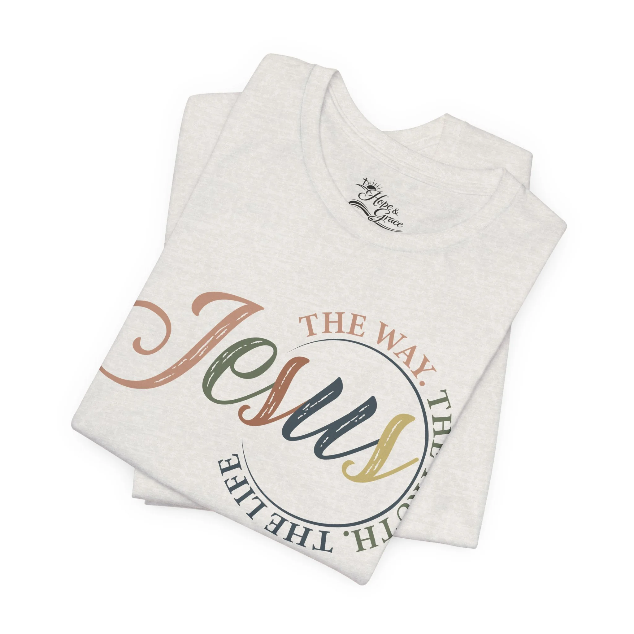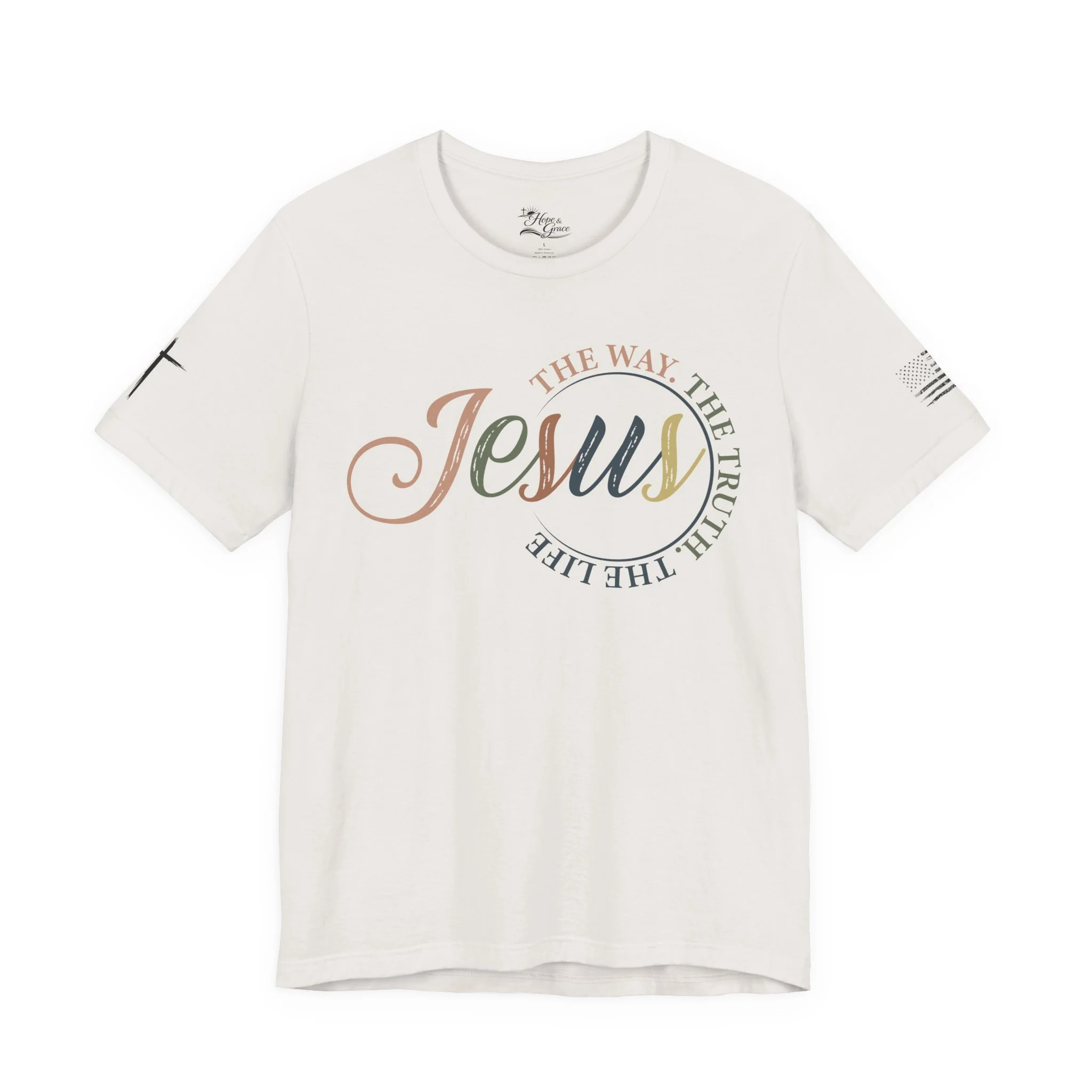 A soft, breathable tee that carries a quiet, confident faith forward. This lightweight crew neck shirt features a subtle, watercolor-style “Jesus” script across the chest with the words “The way, the truth, the life” curving around it — a gentle reminder you can wear. Clean crosses on the sleeves add an understated, modern devotional detail. The retail fit and ribbed collar keep the silhouette tidy whether you’re wearing it for Sunday service, a casual meet-up with friends, or everyday errands. Made from 100% Airlume combed and ring-spun cotton, it feels smooth against the skin and layers easily. Thoughtfully produced with shoulder tape and side seams for lasting shape, plus a tear-away label for comfort. REACH certified and sourced through ethical manufacturing, this tee blends faith-forward design with everyday wearability.