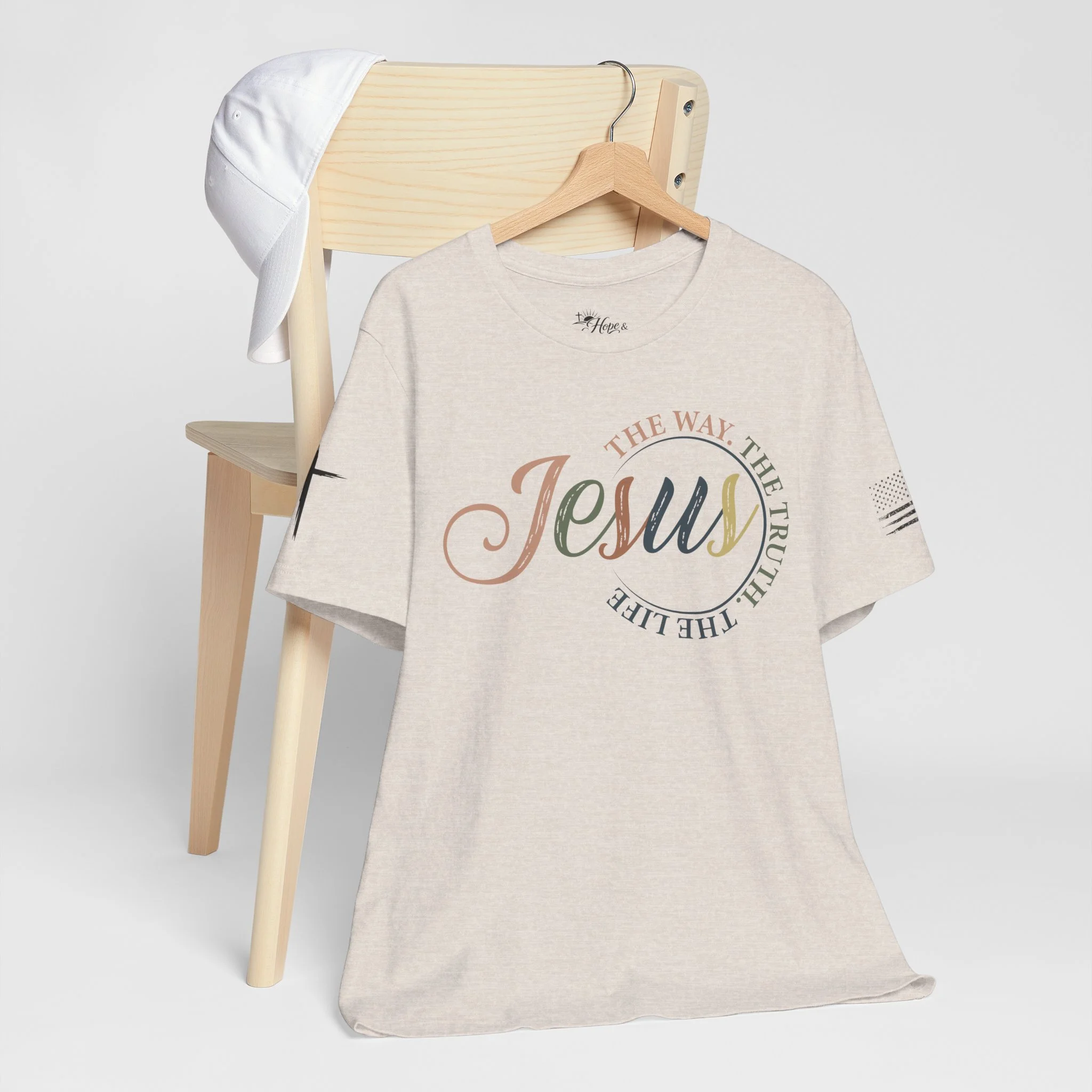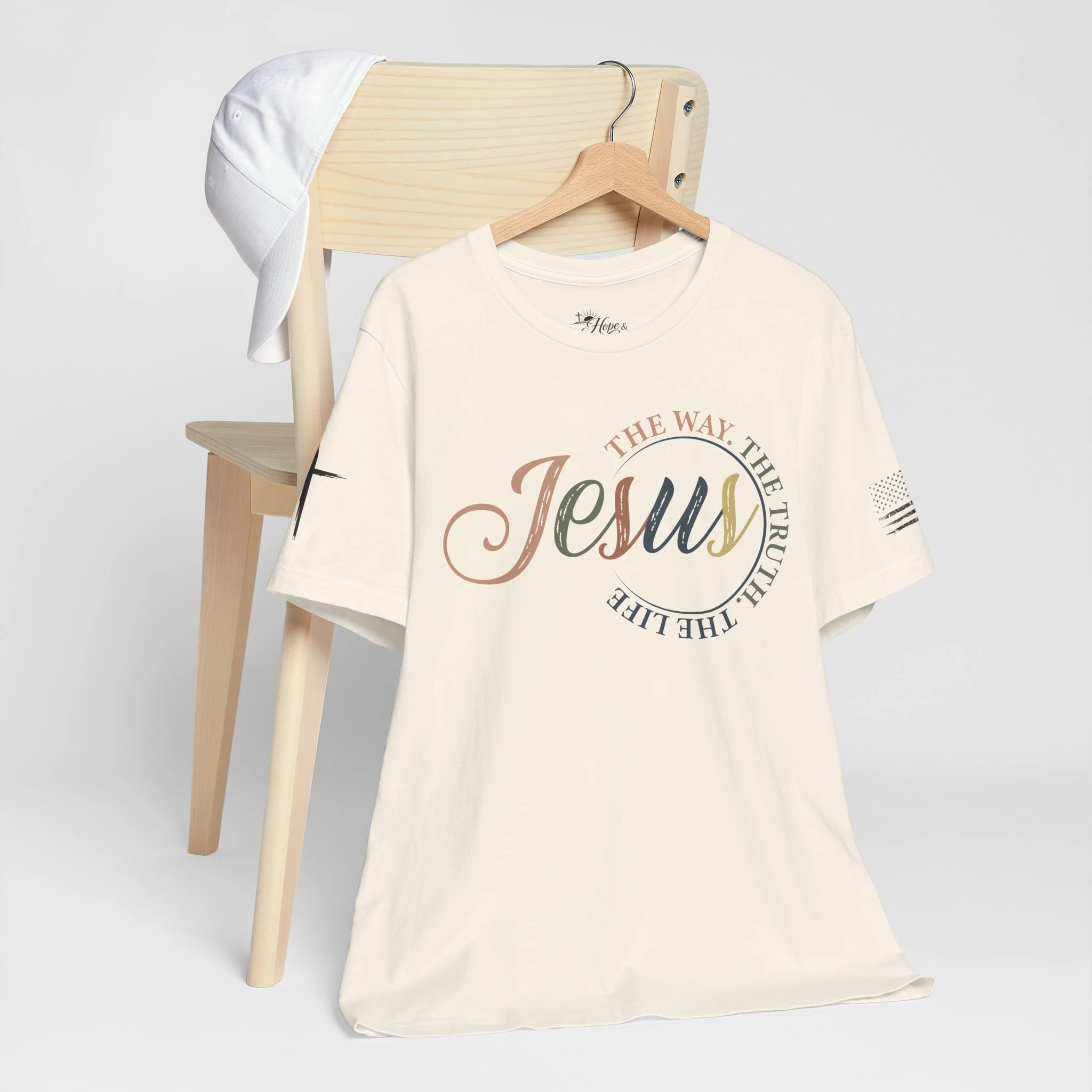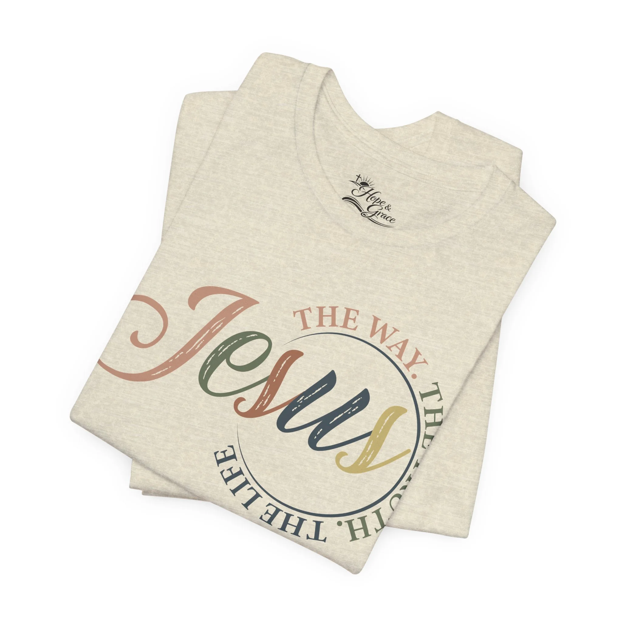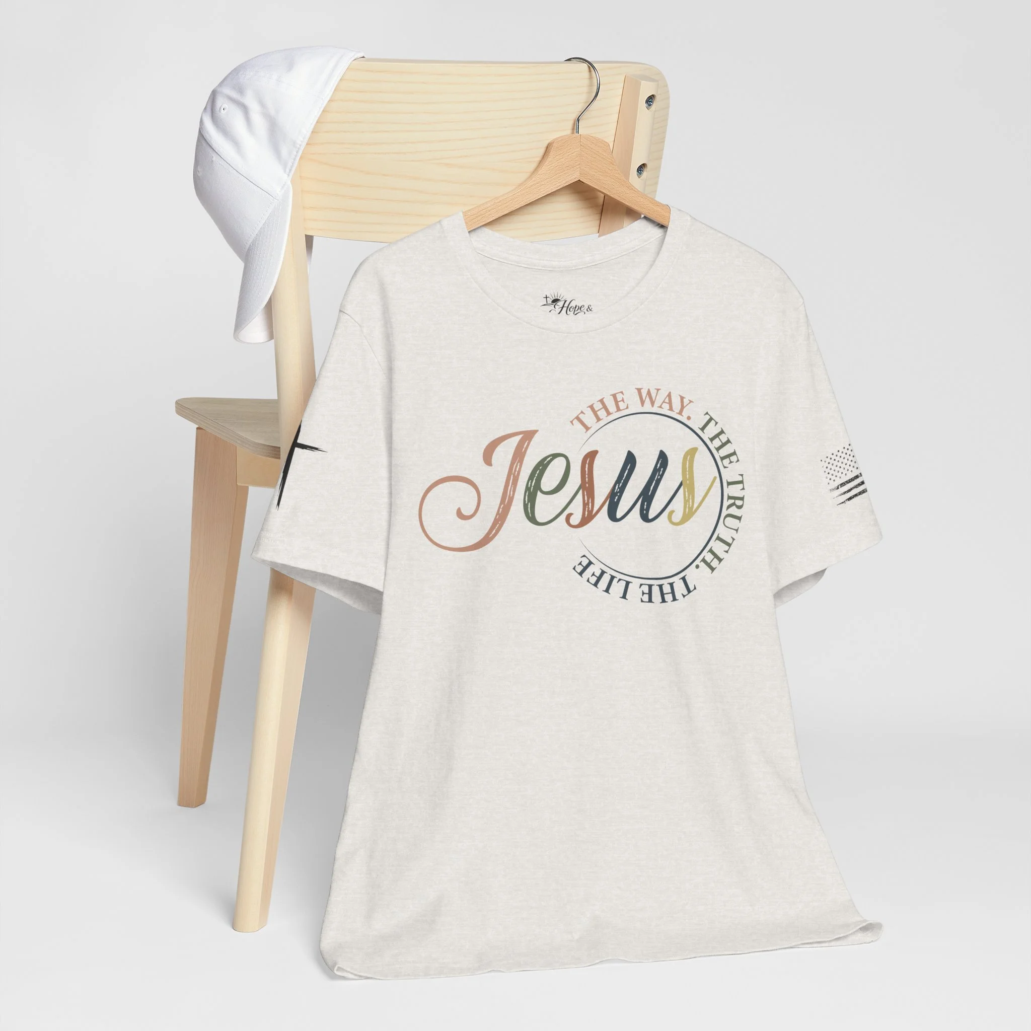 A soft, breathable tee that carries a quiet, confident faith forward. This lightweight crew neck shirt features a subtle, watercolor-style “Jesus” script across the chest with the words “The way, the truth, the life” curving around it — a gentle reminder you can wear. Clean crosses on the sleeves add an understated, modern devotional detail. The retail fit and ribbed collar keep the silhouette tidy whether you’re wearing it for Sunday service, a casual meet-up with friends, or everyday errands. Made from 100% Airlume combed and ring-spun cotton, it feels smooth against the skin and layers easily. Thoughtfully produced with shoulder tape and side seams for lasting shape, plus a tear-away label for comfort. REACH certified and sourced through ethical manufacturing, this tee blends faith-forward design with everyday wearability.