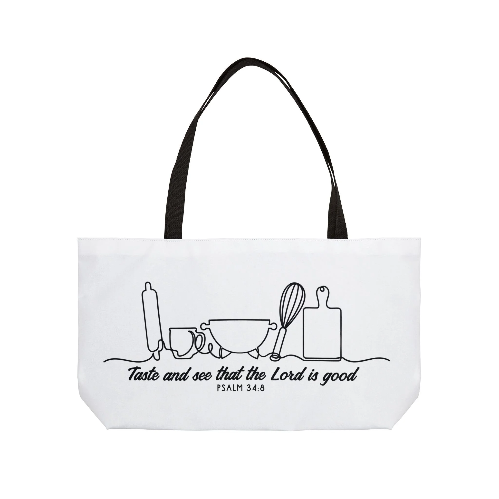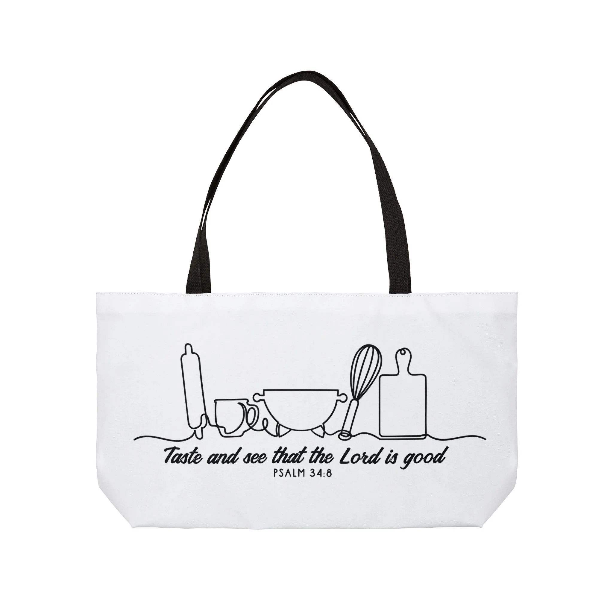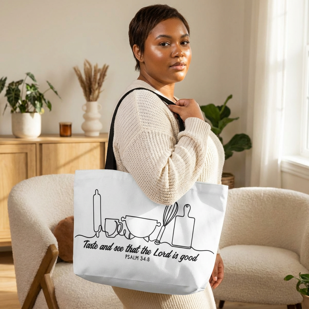 Light, bright, and quietly faithful — this Weekender tote brings calm kitchen charm to days when you carry more than groceries. A single-line illustration of bowls, a whisk, rolling pin and cutting board flows across the front, anchored by the gentle reminder from Psalm 34:8: “Taste and see that the Lord is good.” The roomy T-bottom silhouette holds baking projects, farmer’s market finds, or a weekend’s worth of linens, while the black woven handles and lining keep the look grounded and easy to pair with everyday outfits. Designed to travel from pantry to pew to porch, it’s for those who find peace in simple rhythms and like to share warmth through food and fellowship.