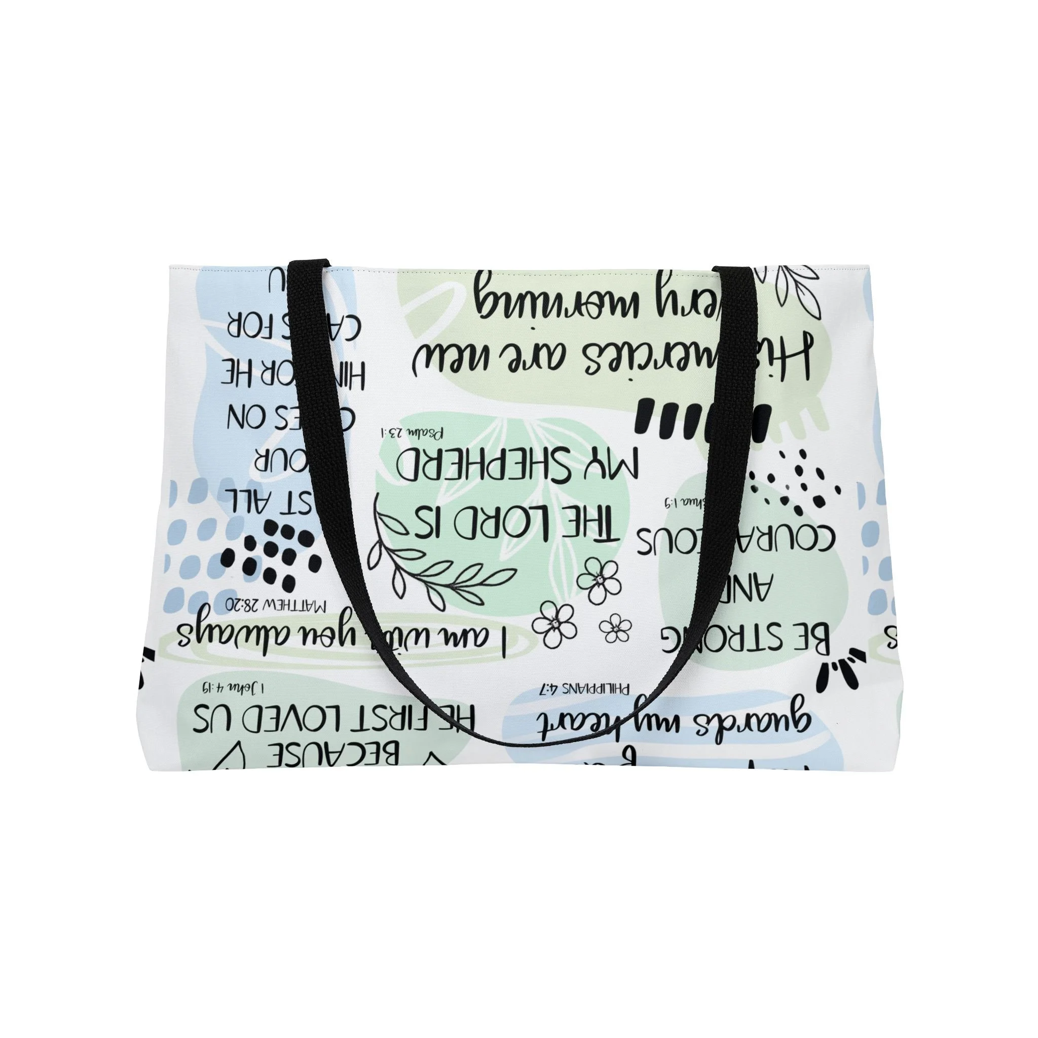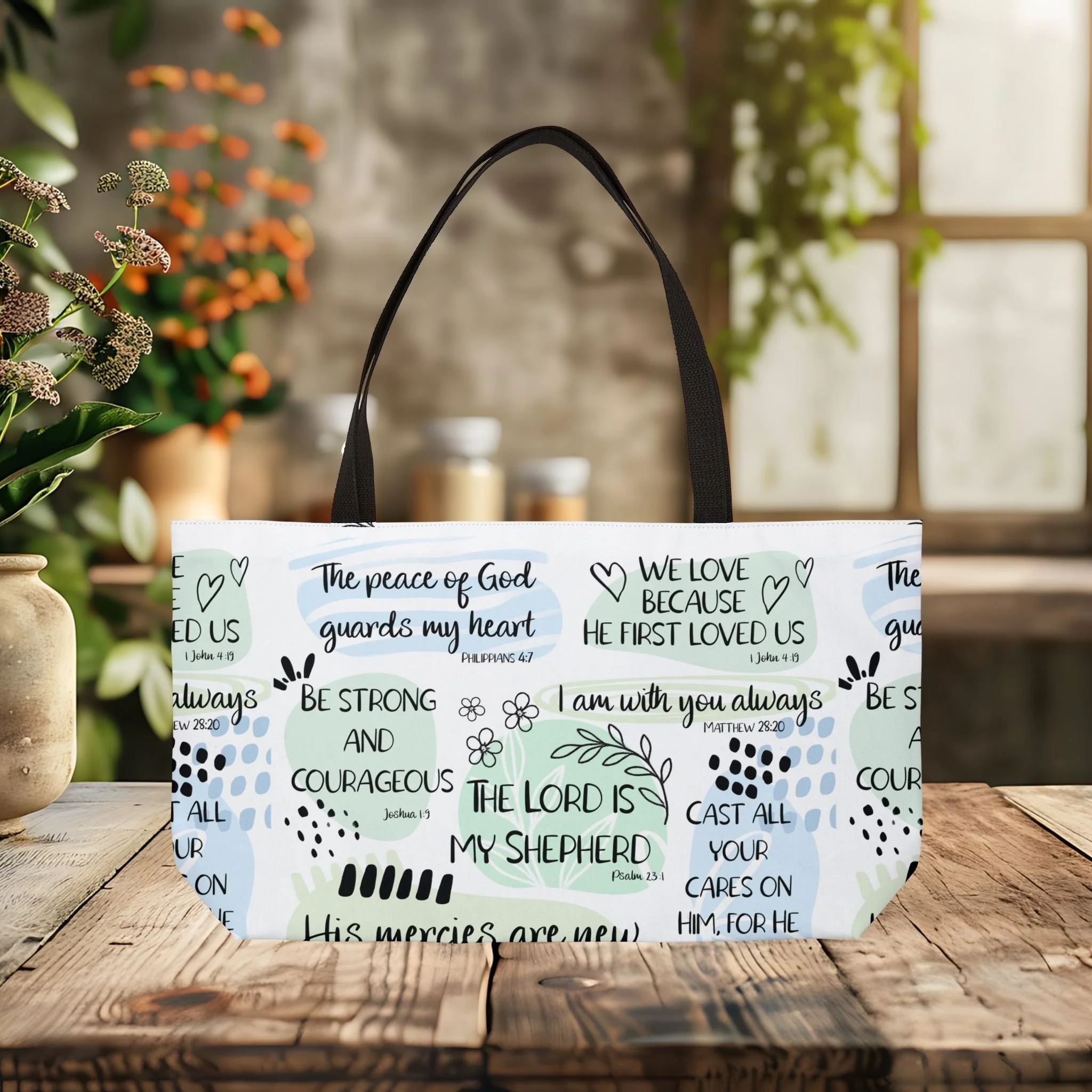 Light, bright, and quietly uplifting — this roomy weekender tote carries more than belongings. The soft watercolor washes and hand-lettered affirmations create a calm, hopeful palette that settles the mind. Carry it to morning gatherings, church socials, or long grocery runs: the structured T-bottom keeps jars upright while the black woven straps sit comfortably on your shoulder. It’s the kind of bag that holds a Bible, a journal, a scarf, snacks, and the small rituals that make a day feel steadier.