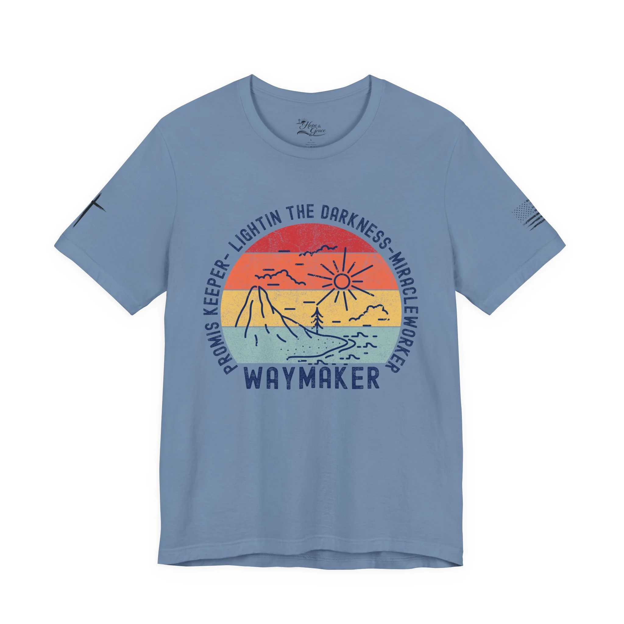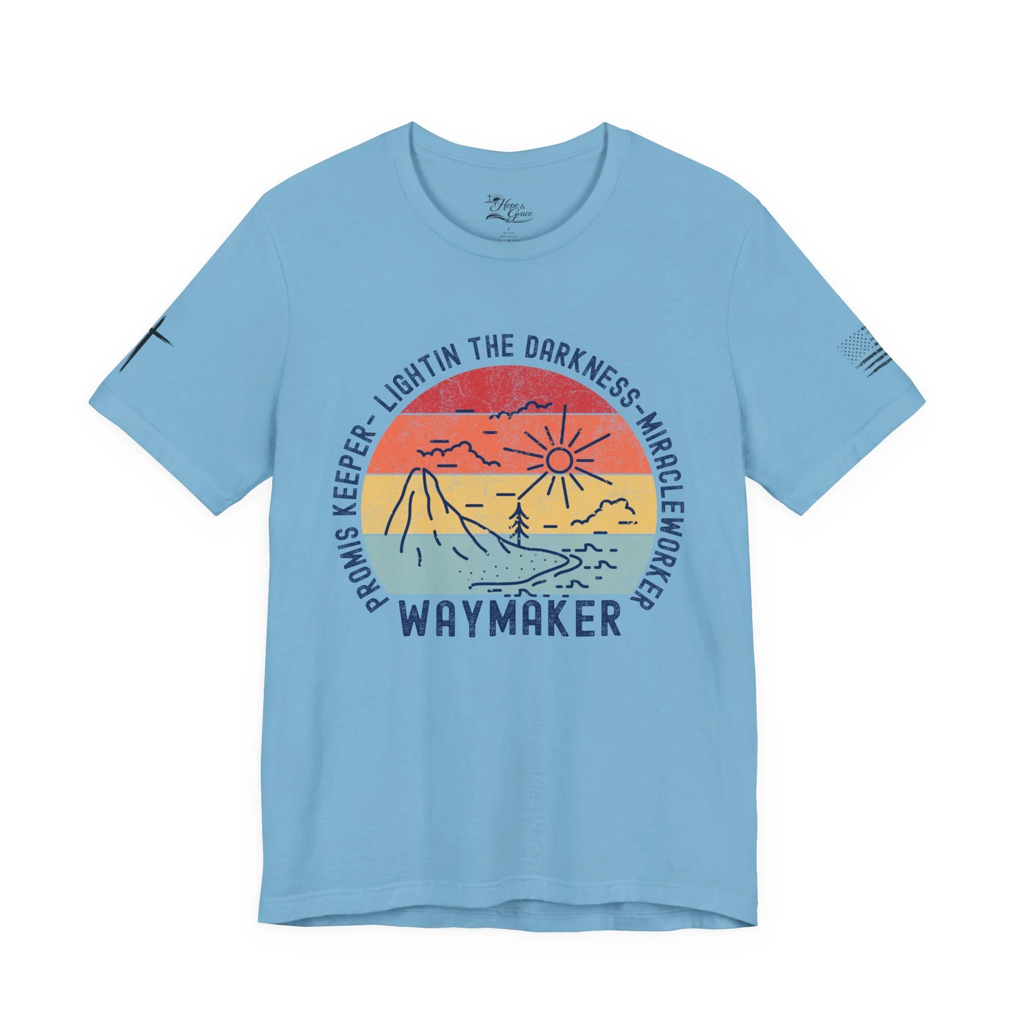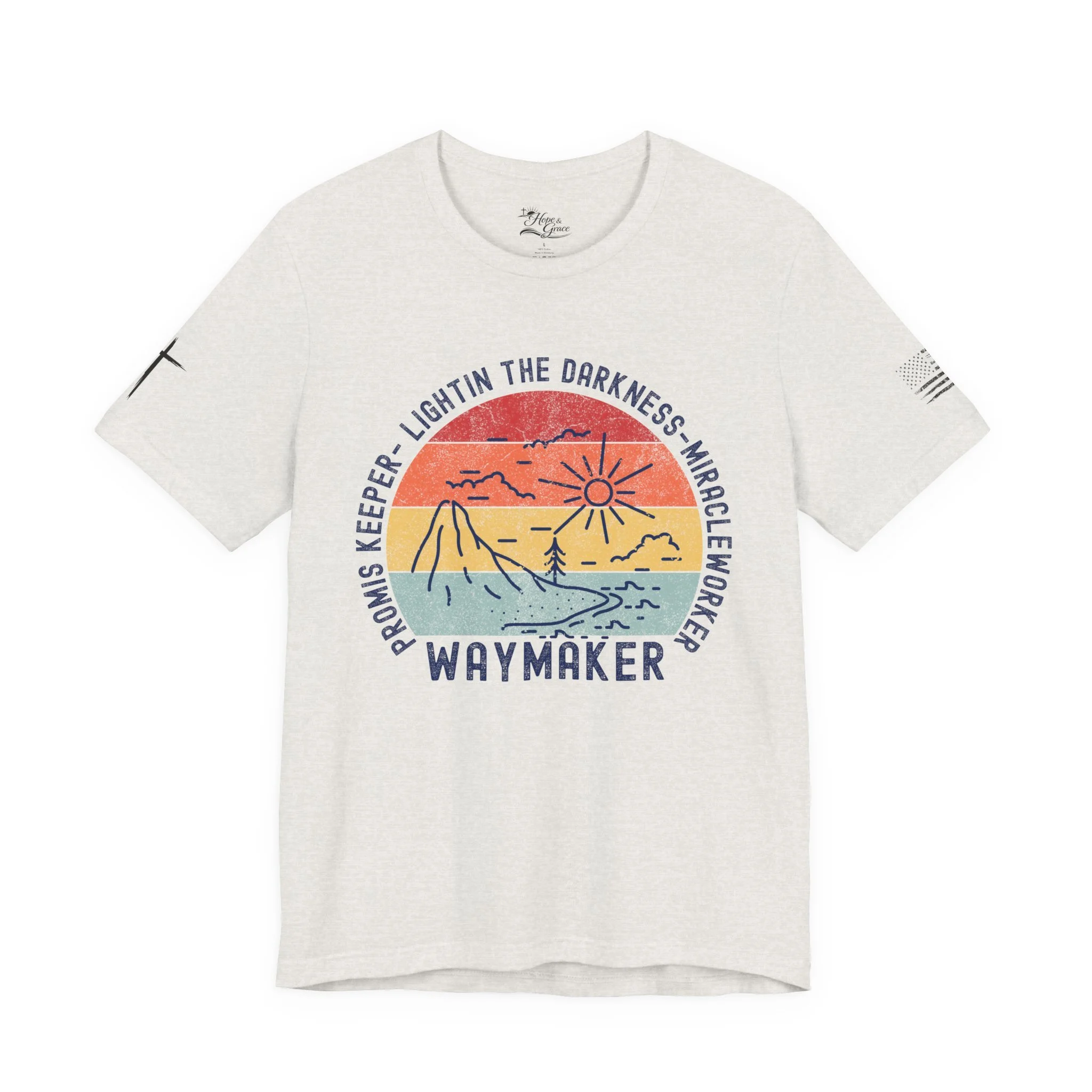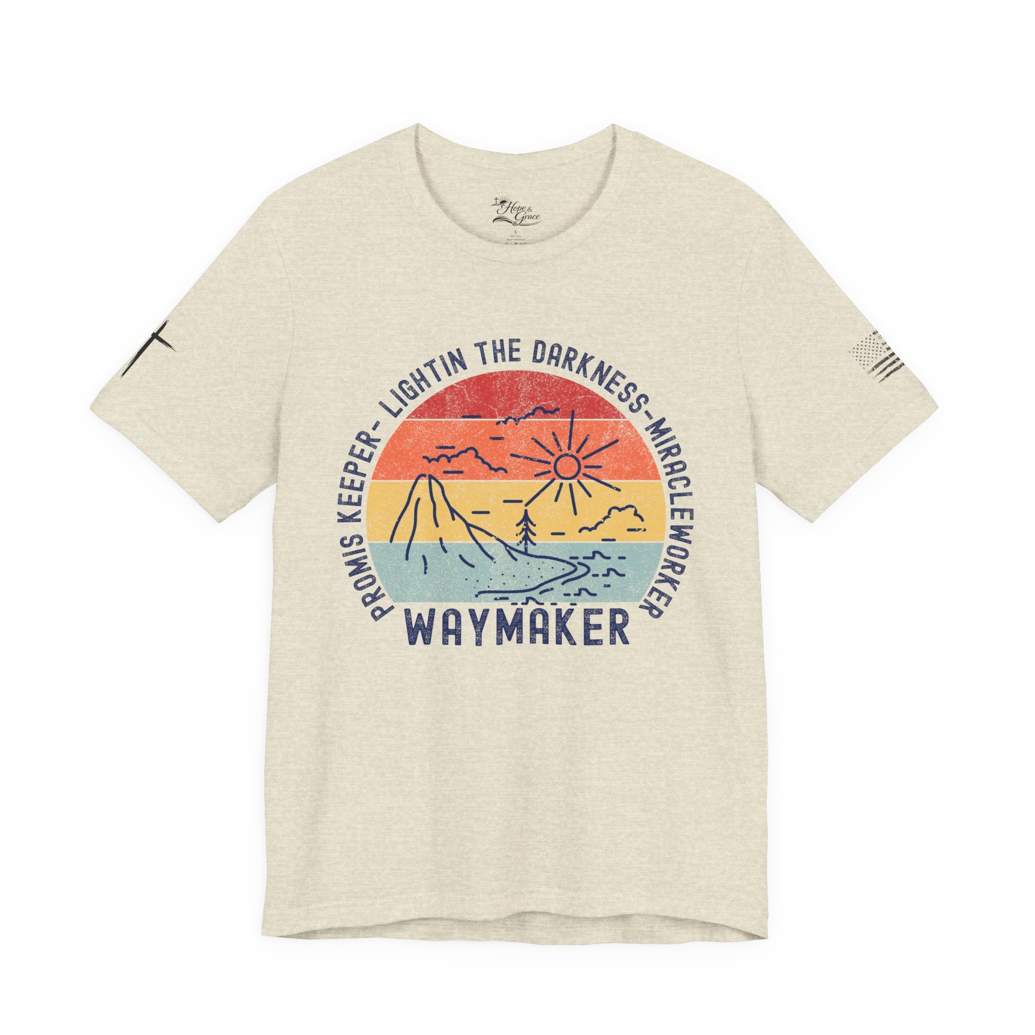 Lightweight and soft, this crew-neck tee carries a quiet, hopeful voice. The front shows a weathered sun-over-seascape badge with gentle, sunset hues and the word “WAYMAKER,” framed by phrases that read like a promise — light in the dark, steady guide, anchor in the waves. Small, subtle sleeve marks and a cross accent give it a handcrafted, lived-in vibe. Wear it on early morning walks, church volunteer days, or relaxed evenings with friends — it slips easily into routines where comfort meets meaning. The fit hugs the shoulders then falls casually through the body so layering a flannel or cardigan feels natural. Breathable Airlume combed cotton keeps you comfortable from warm afternoons to cool nights, while the tear-away label and reinforced neck and shoulder details keep it feeling soft against skin wear after wear.
