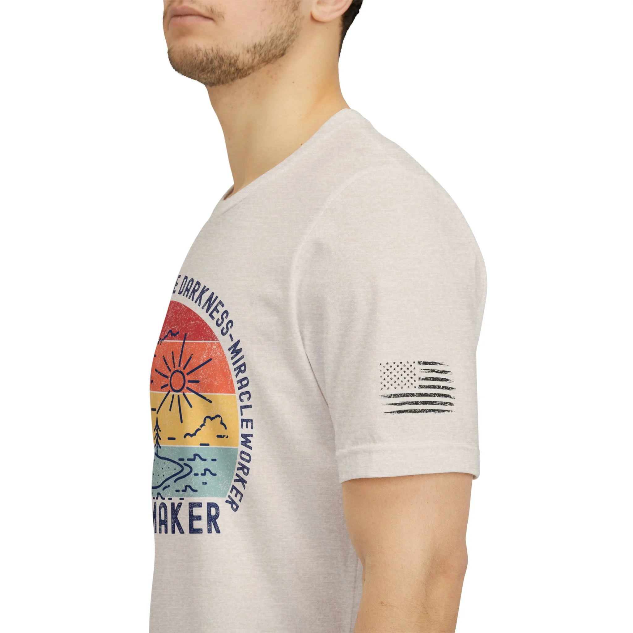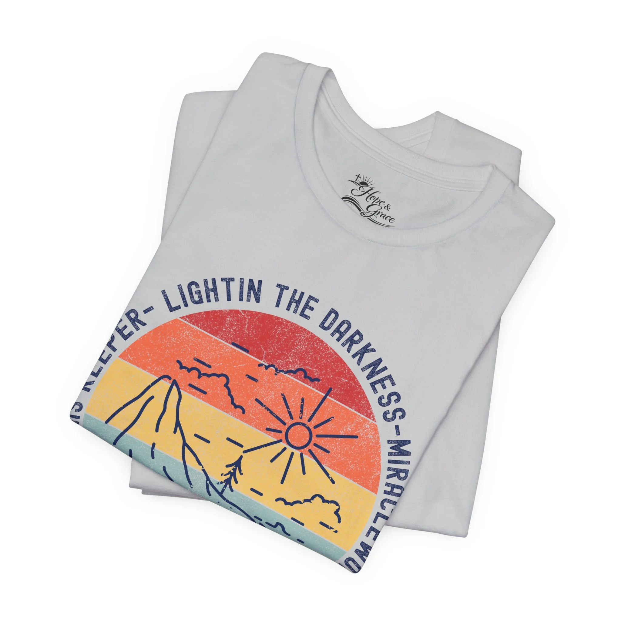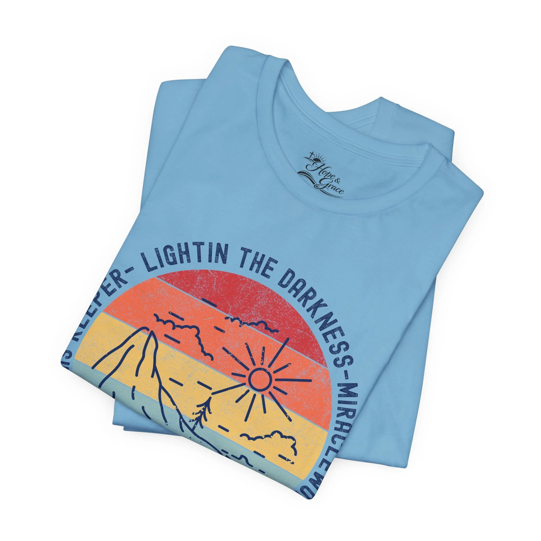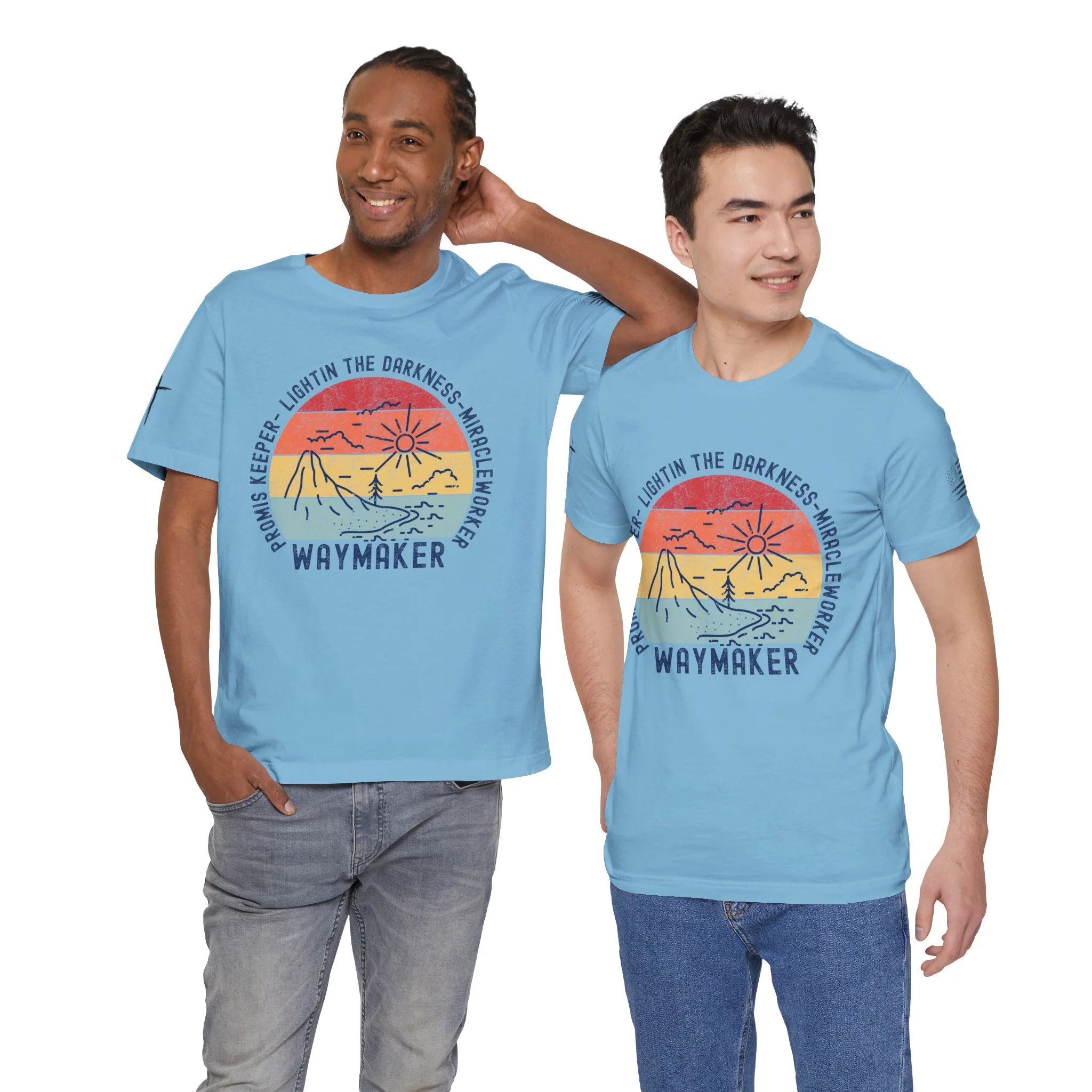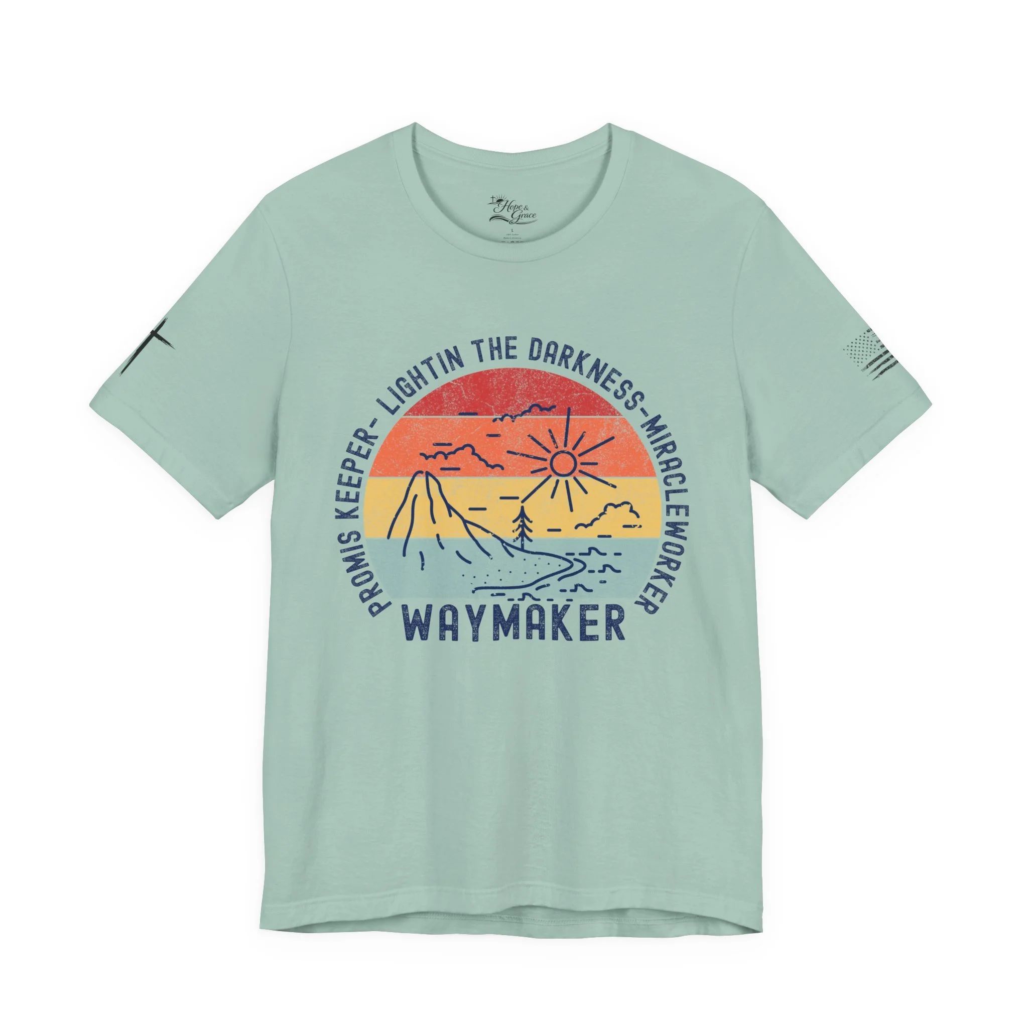 Lightweight and soft, this crew-neck tee carries a quiet, hopeful voice. The front shows a weathered sun-over-seascape badge with gentle, sunset hues and the word “WAYMAKER,” framed by phrases that read like a promise — light in the dark, steady guide, anchor in the waves. Small, subtle sleeve marks and a cross accent give it a handcrafted, lived-in vibe. Wear it on early morning walks, church volunteer days, or relaxed evenings with friends — it slips easily into routines where comfort meets meaning. The fit hugs the shoulders then falls casually through the body so layering a flannel or cardigan feels natural. Breathable Airlume combed cotton keeps you comfortable from warm afternoons to cool nights, while the tear-away label and reinforced neck and shoulder details keep it feeling soft against skin wear after wear.