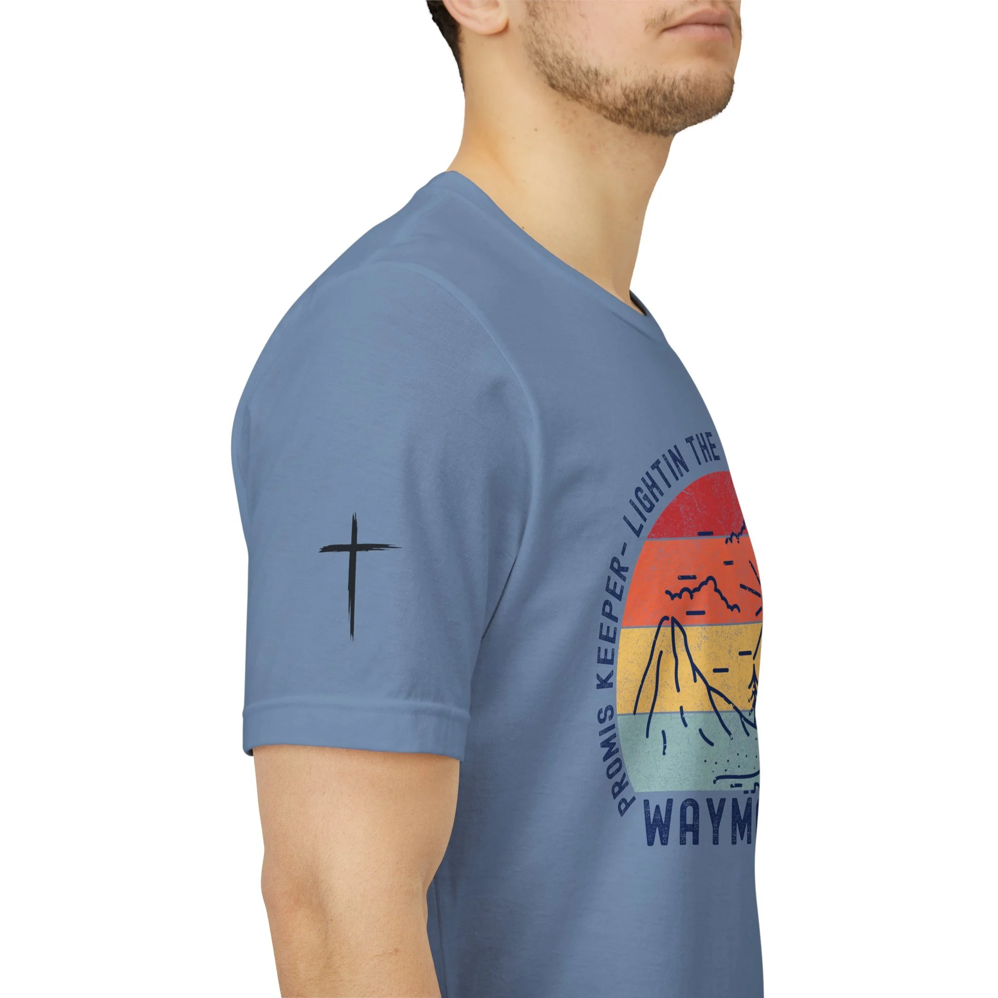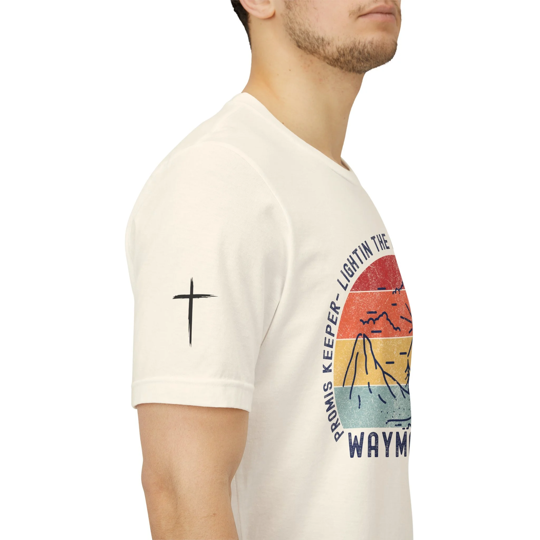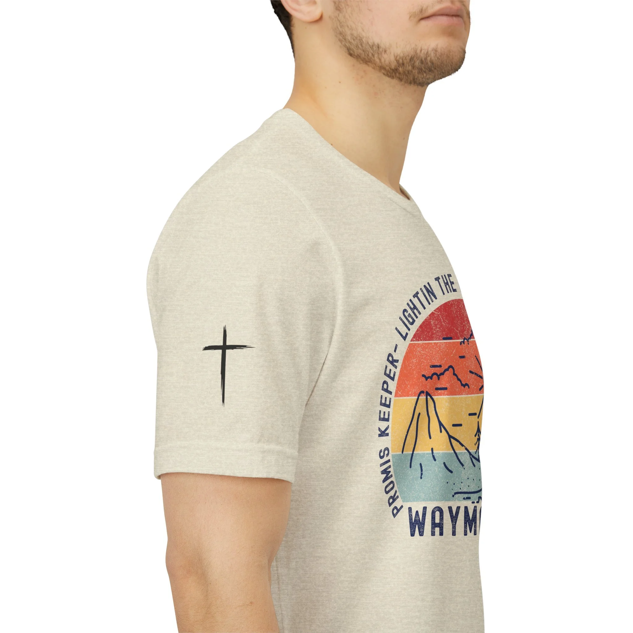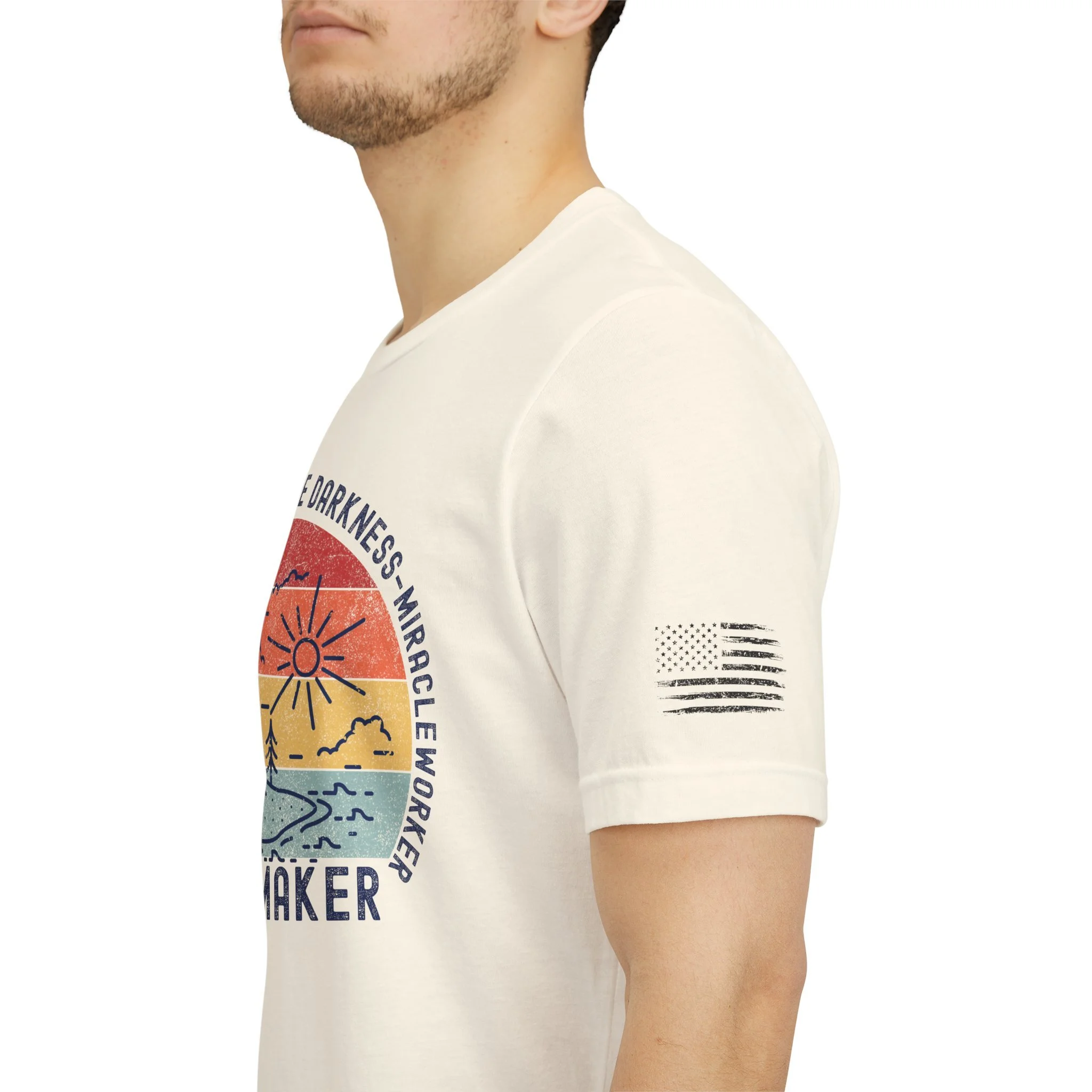 Lightweight and soft, this crew-neck tee carries a quiet, hopeful voice. The front shows a weathered sun-over-seascape badge with gentle, sunset hues and the word “WAYMAKER,” framed by phrases that read like a promise — light in the dark, steady guide, anchor in the waves. Small, subtle sleeve marks and a cross accent give it a handcrafted, lived-in vibe. Wear it on early morning walks, church volunteer days, or relaxed evenings with friends — it slips easily into routines where comfort meets meaning. The fit hugs the shoulders then falls casually through the body so layering a flannel or cardigan feels natural. Breathable Airlume combed cotton keeps you comfortable from warm afternoons to cool nights, while the tear-away label and reinforced neck and shoulder details keep it feeling soft against skin wear after wear.