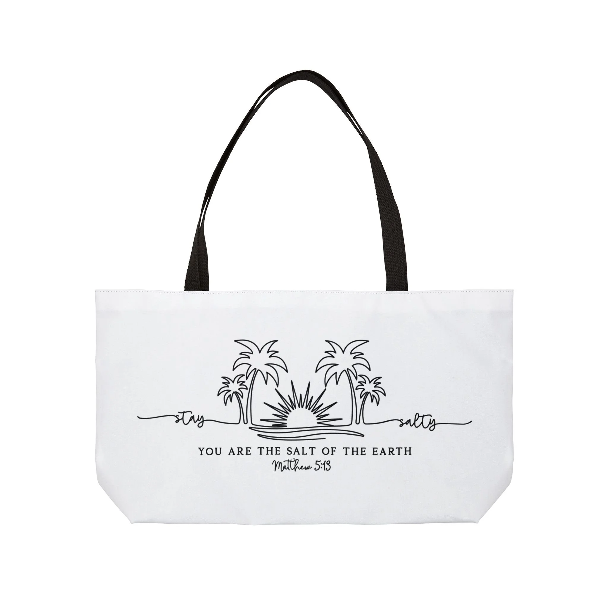 Bring a quiet, sunlit moment wherever you go with this roomy Weekender Tote Bag. The minimalist line-drawn palms and rising sun carry a gentle message—“You are the salt of the earth”—in clean black on a crisp white canvas. Foldable yet structured, the T-bottom gives the bag a stable base for groceries, beach gear, or a stack of market finds. The black woven handles sit comfortably on the shoulder while the black-lined interior hides scuffs and keeps contents looking neat. Lightweight, colorfast, and made to travel, this tote slips into weekend routines and intentional outings alike.