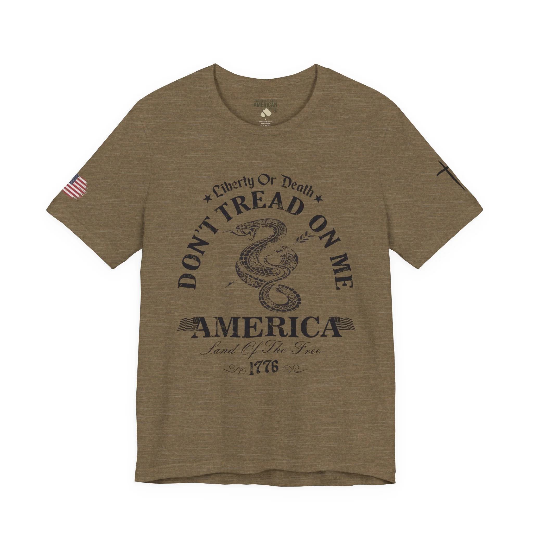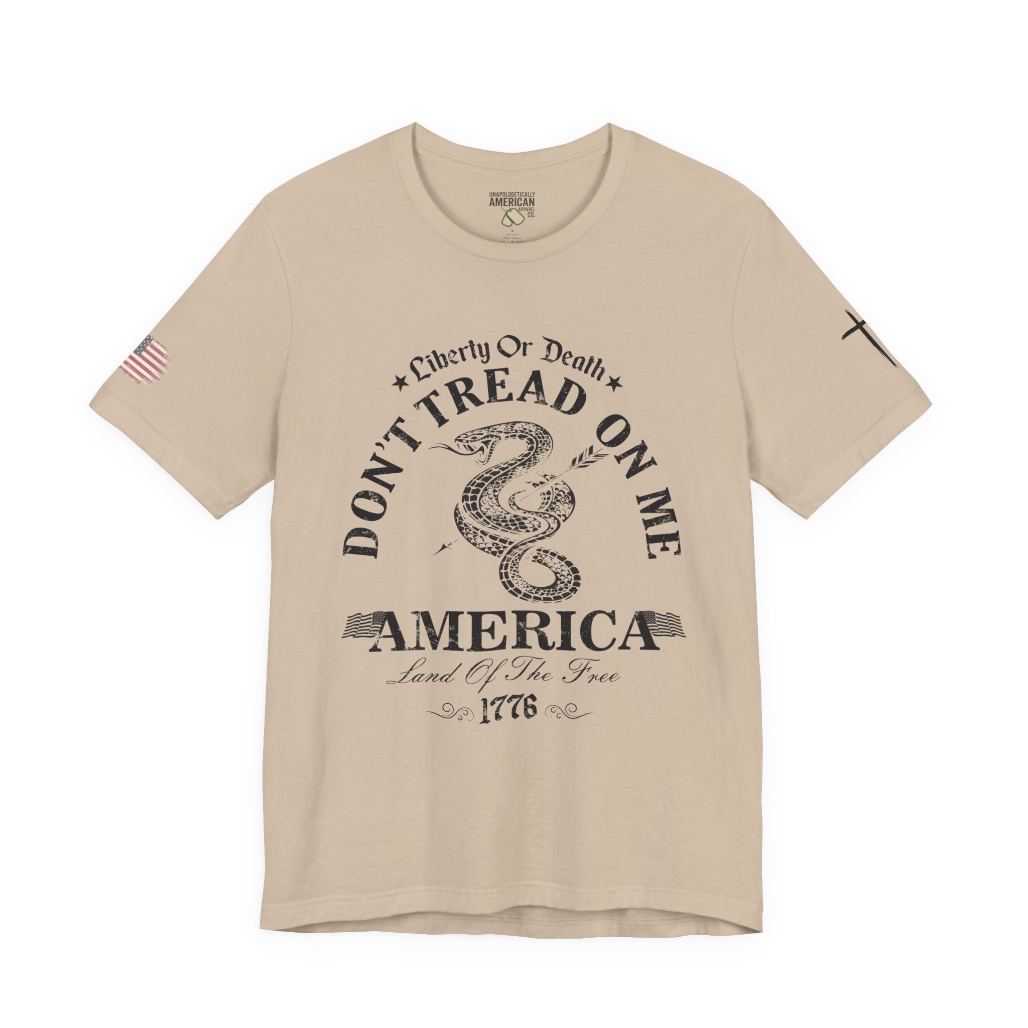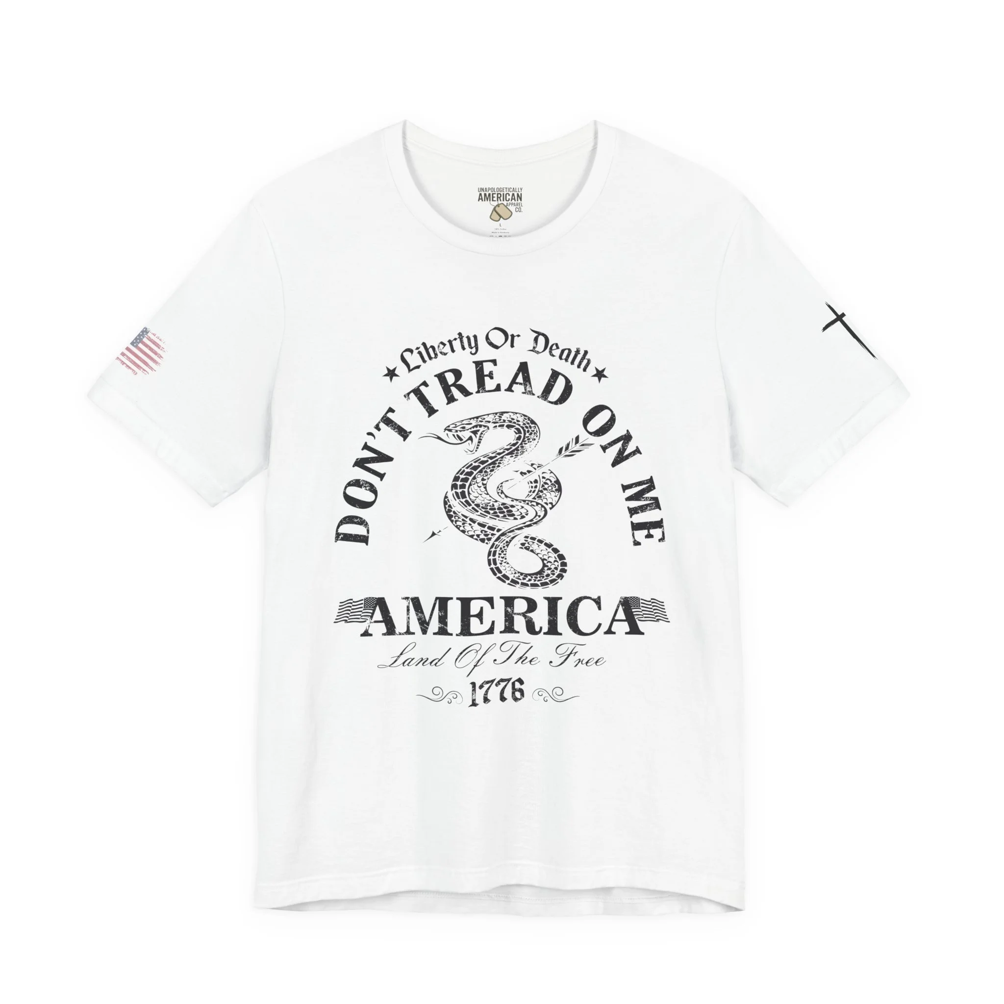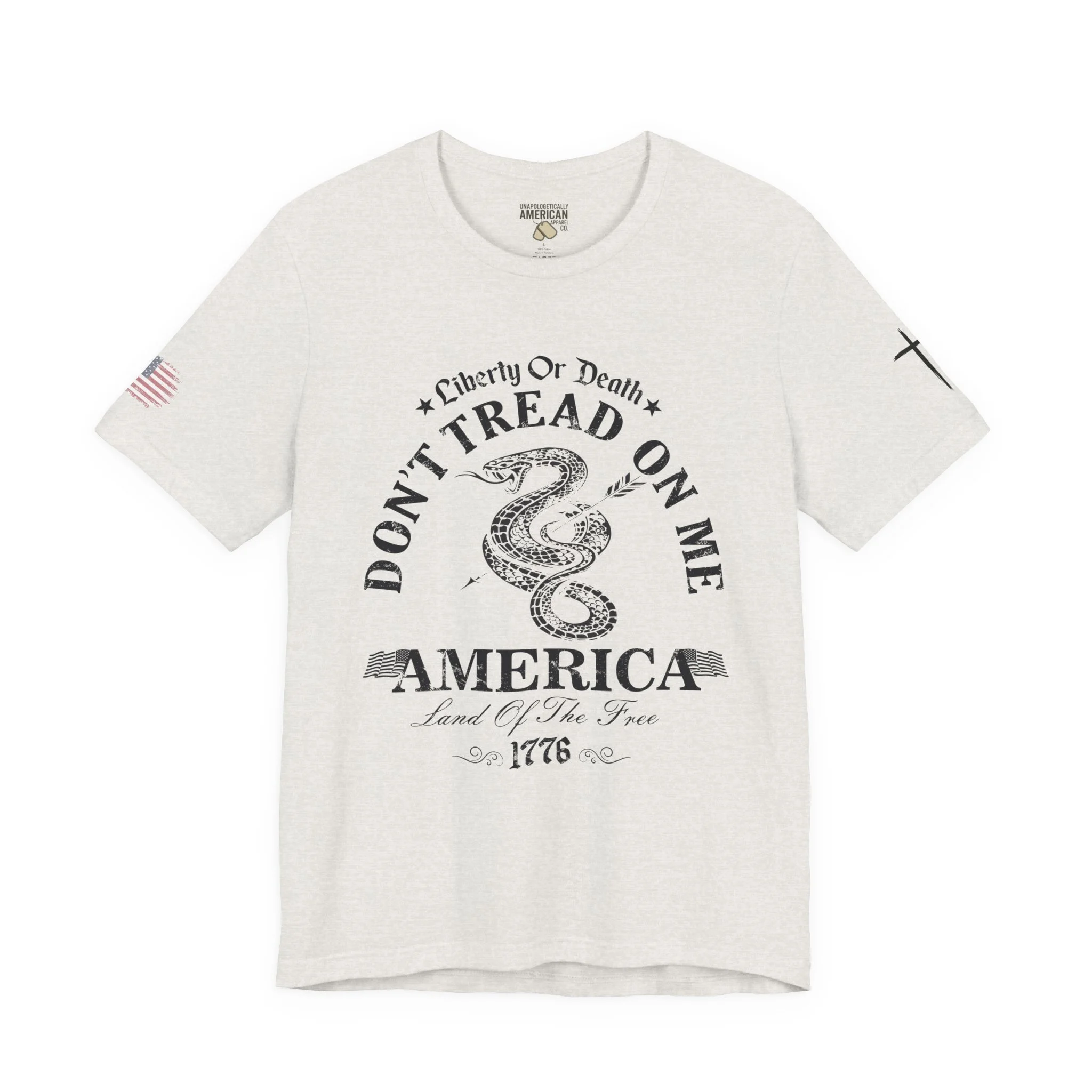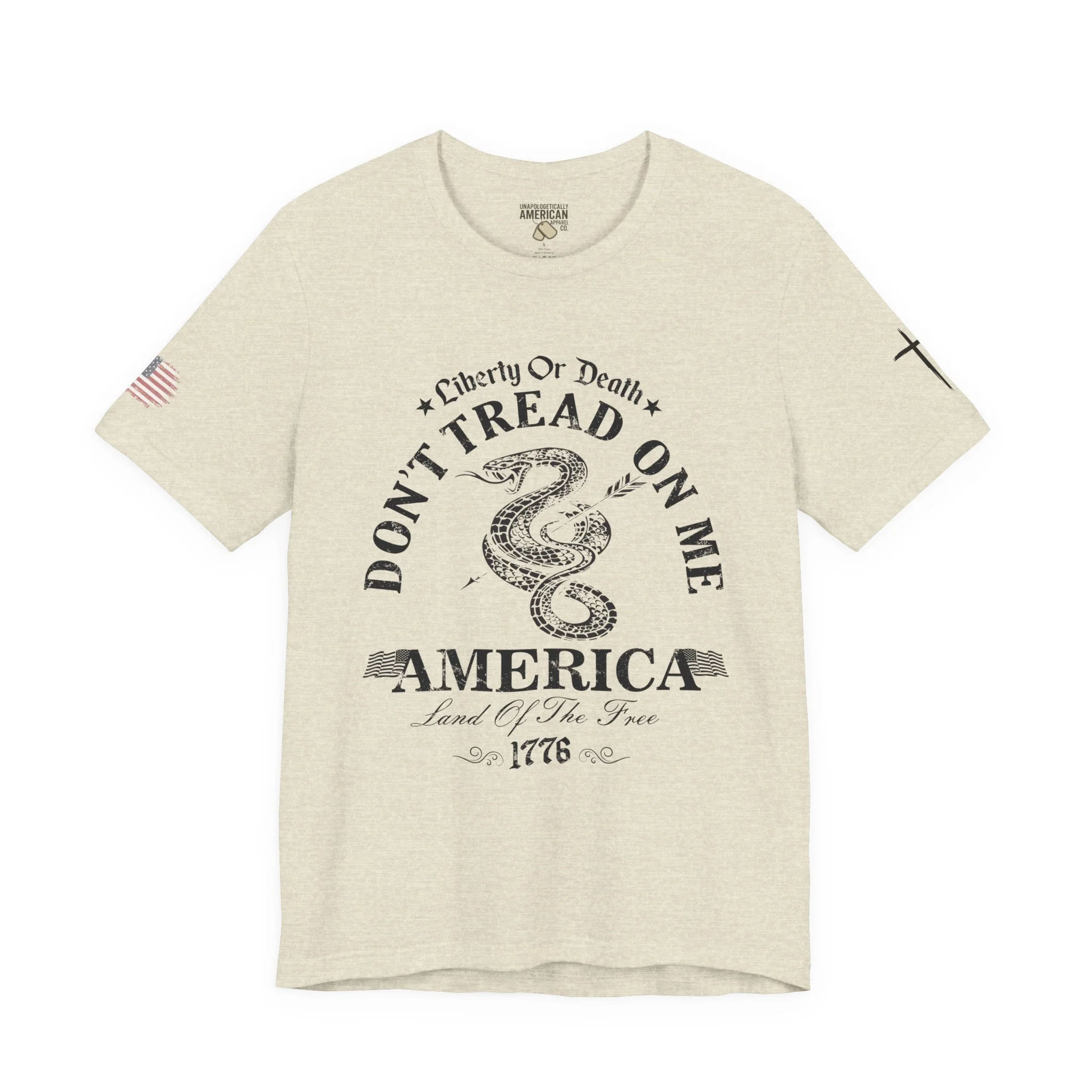 A lightweight, vintage-style tee that channels classic American rebellion with a worn-in graphic and clean crew neckline. The soft Airlume combed cotton feels breathable against the skin, while side seams and shoulder tape keep the silhouette crisp across everyday wear. Distressed print details — a coiled rattlesnake, “Don’t Tread On Me,” and Americana text — give it a lived-in, rally-ready look that layers easily under jackets or wears alone for casual statements. Subtle sleeve prints (flag and cross) add quiet, intentional accents without overpowering the chest image. Sized in a retail fit with a tear-away label for comfort, this shirt balances heritage style with modern comfort and responsible manufacturing.
