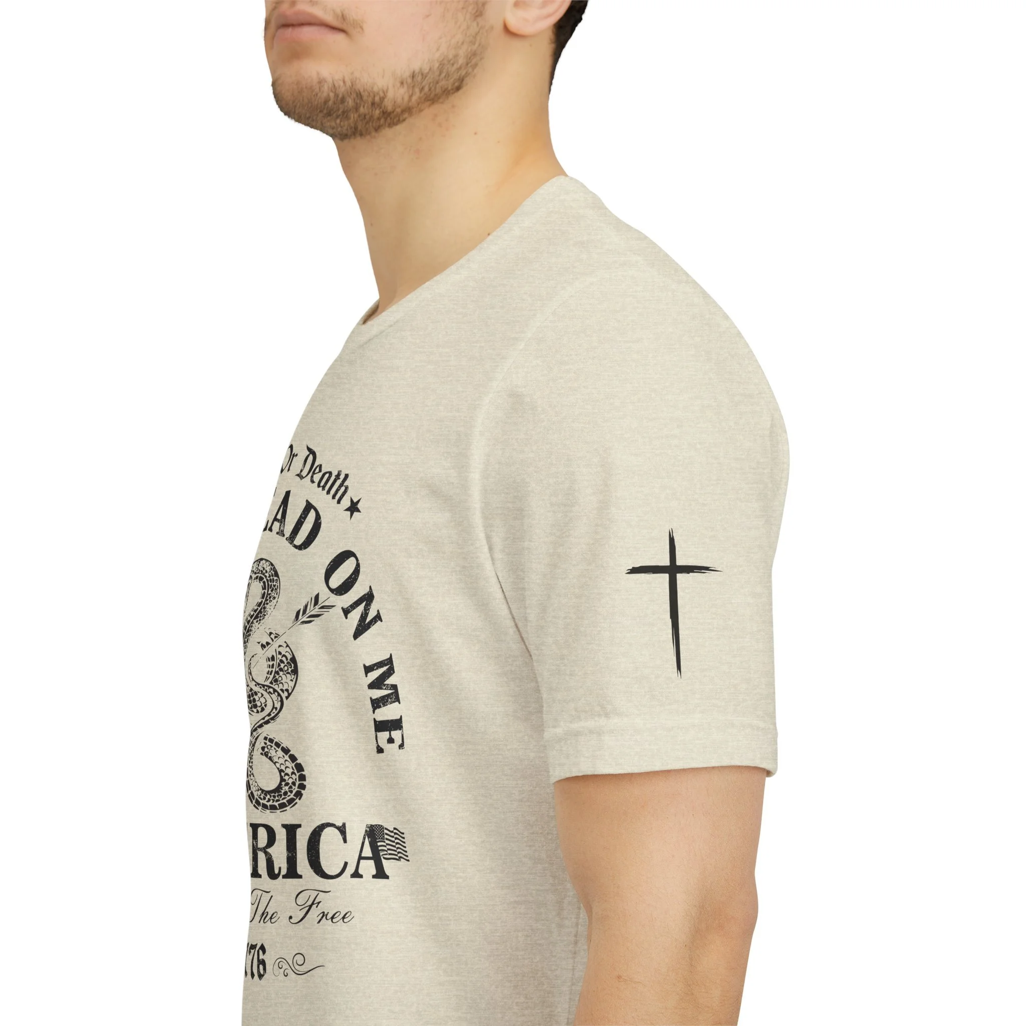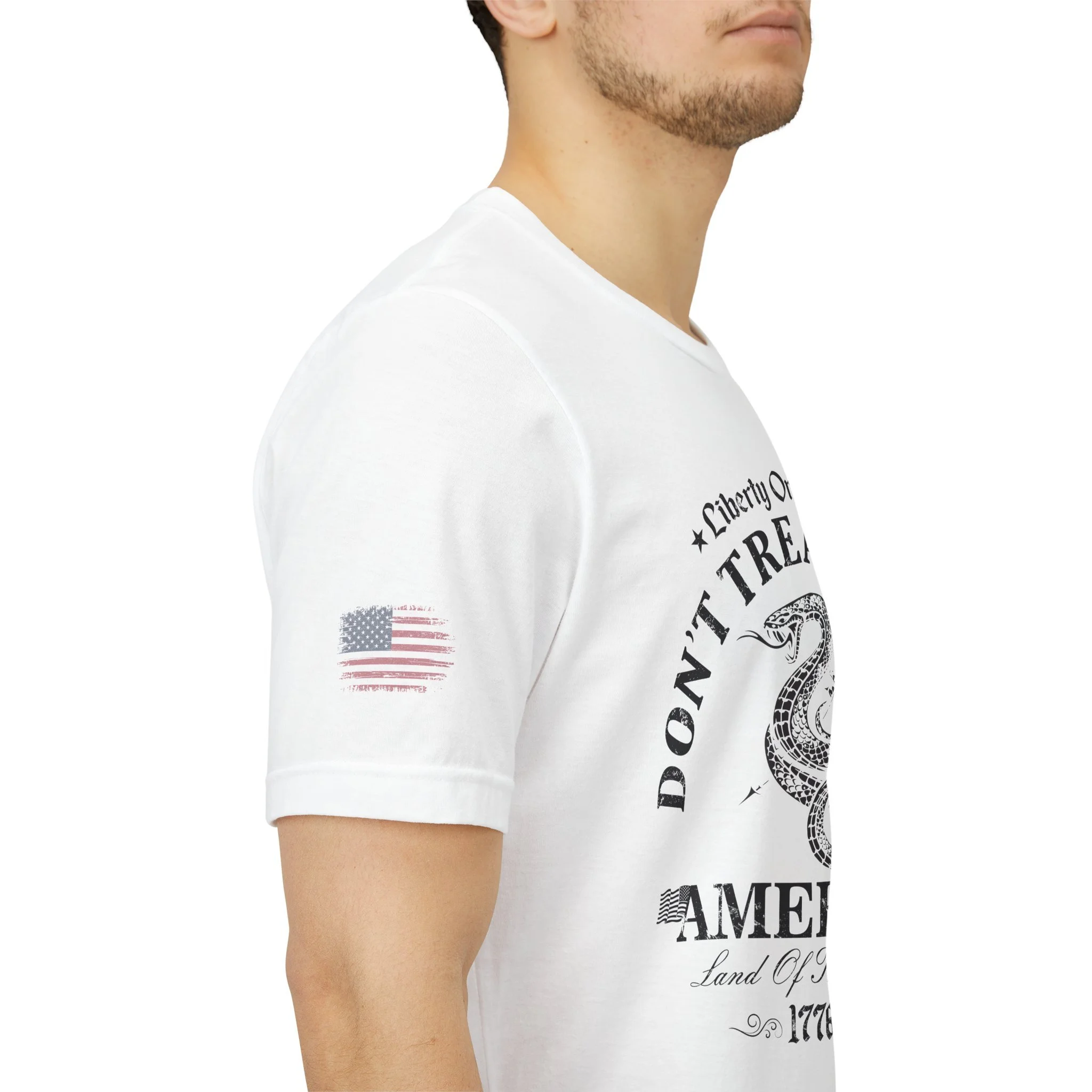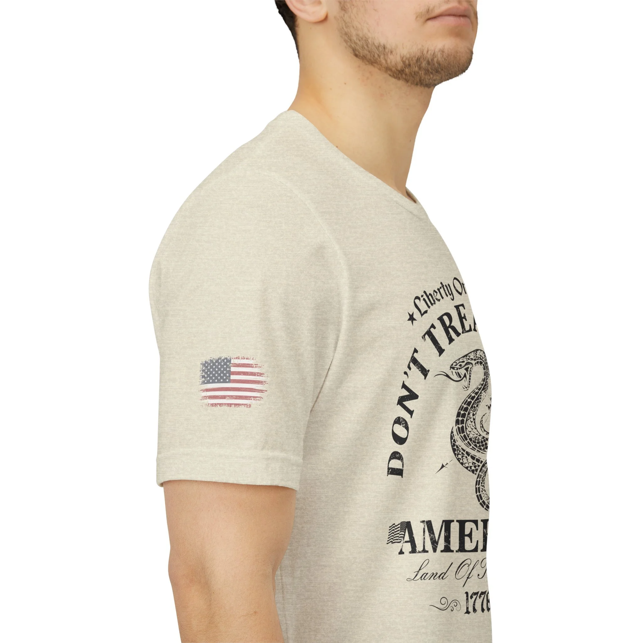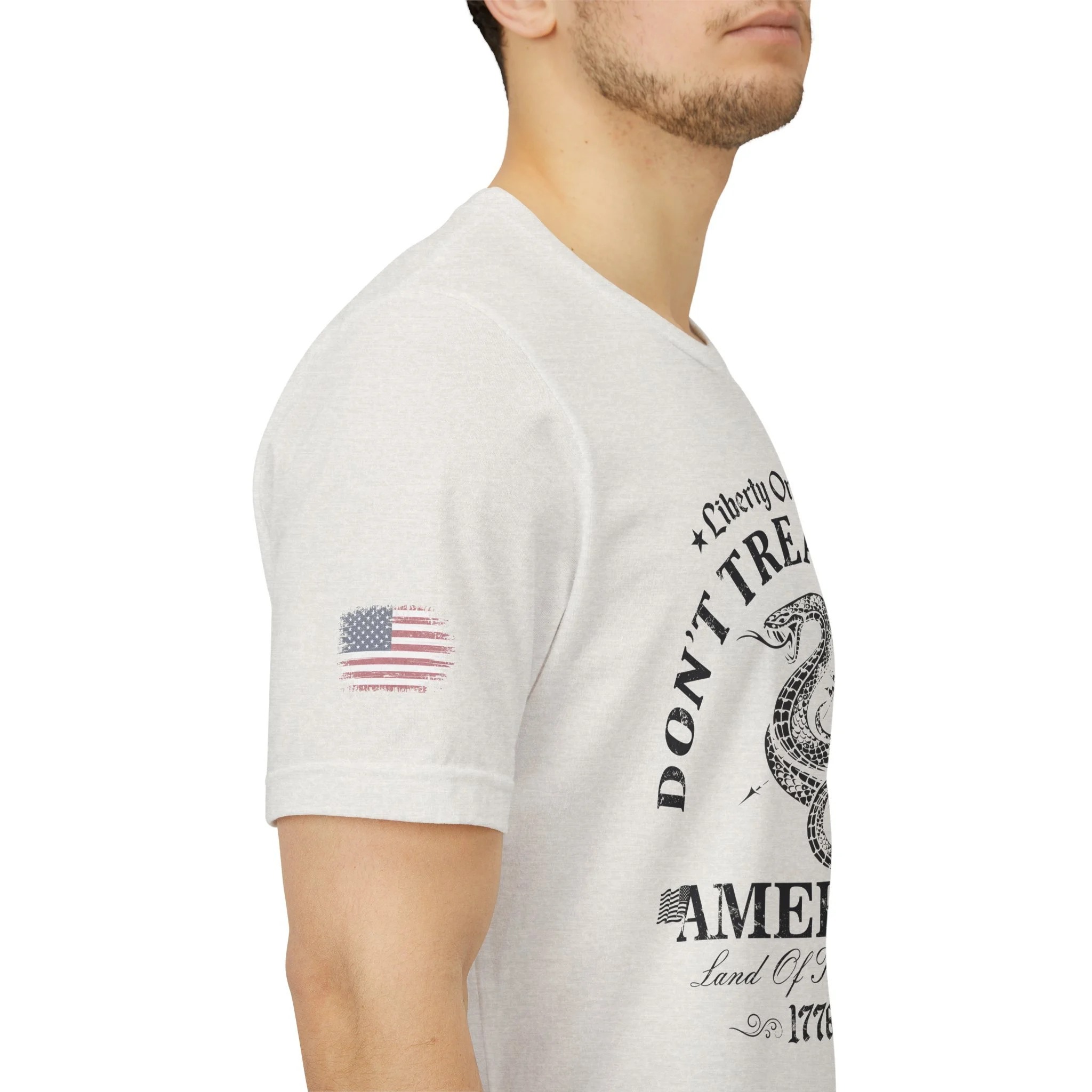 A lightweight, vintage-style tee that channels classic American rebellion with a worn-in graphic and clean crew neckline. The soft Airlume combed cotton feels breathable against the skin, while side seams and shoulder tape keep the silhouette crisp across everyday wear. Distressed print details — a coiled rattlesnake, “Don’t Tread On Me,” and Americana text — give it a lived-in, rally-ready look that layers easily under jackets or wears alone for casual statements. Subtle sleeve prints (flag and cross) add quiet, intentional accents without overpowering the chest image. Sized in a retail fit with a tear-away label for comfort, this shirt balances heritage style with modern comfort and responsible manufacturing.