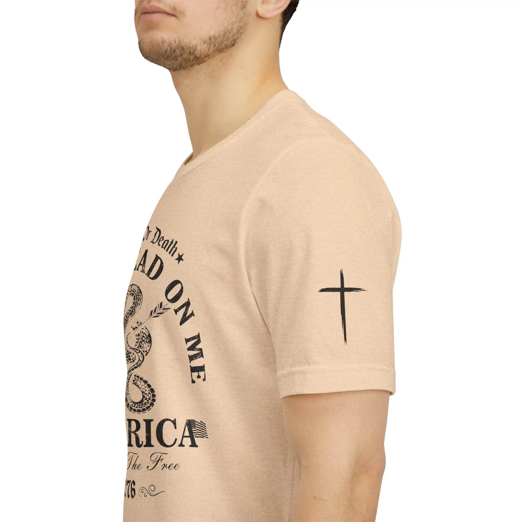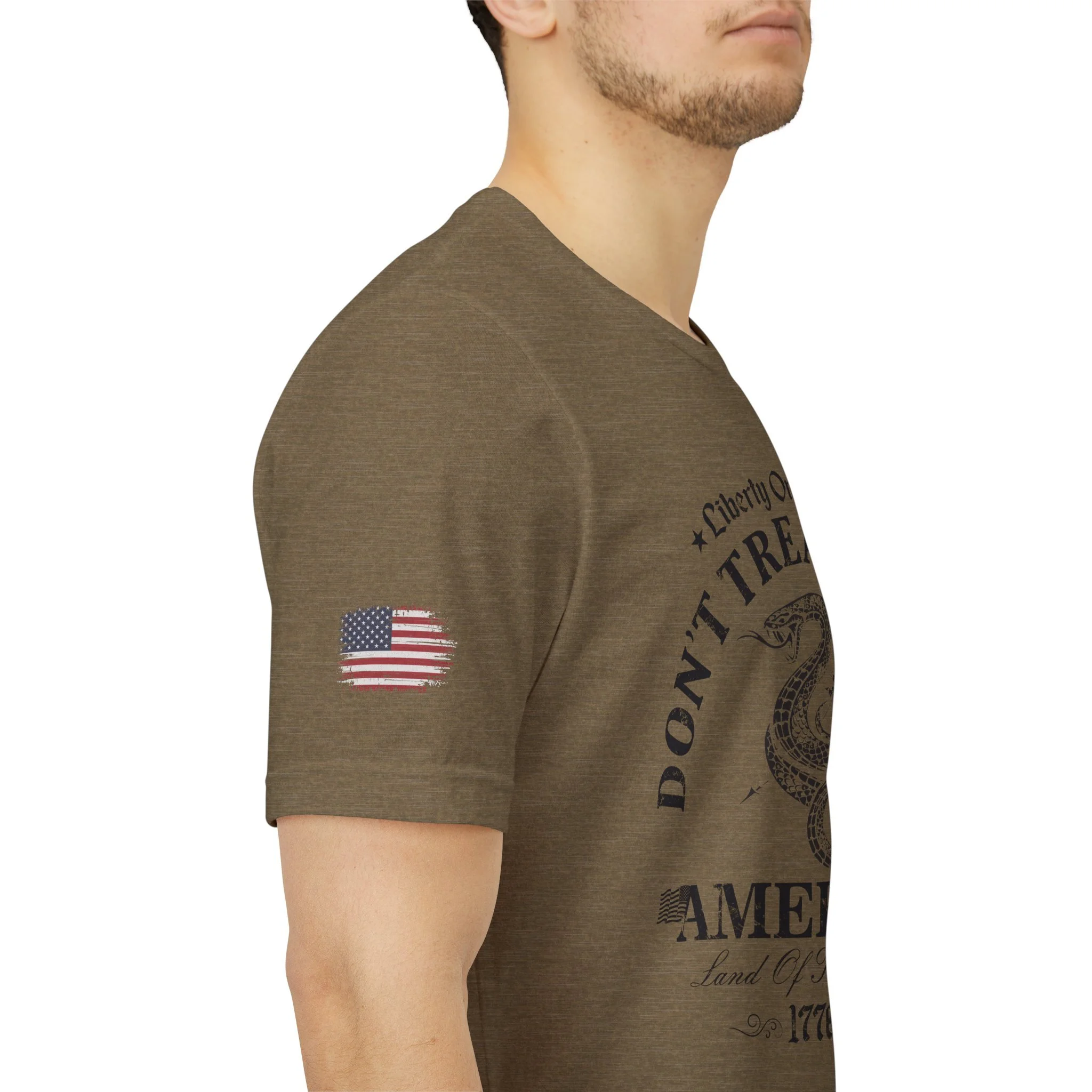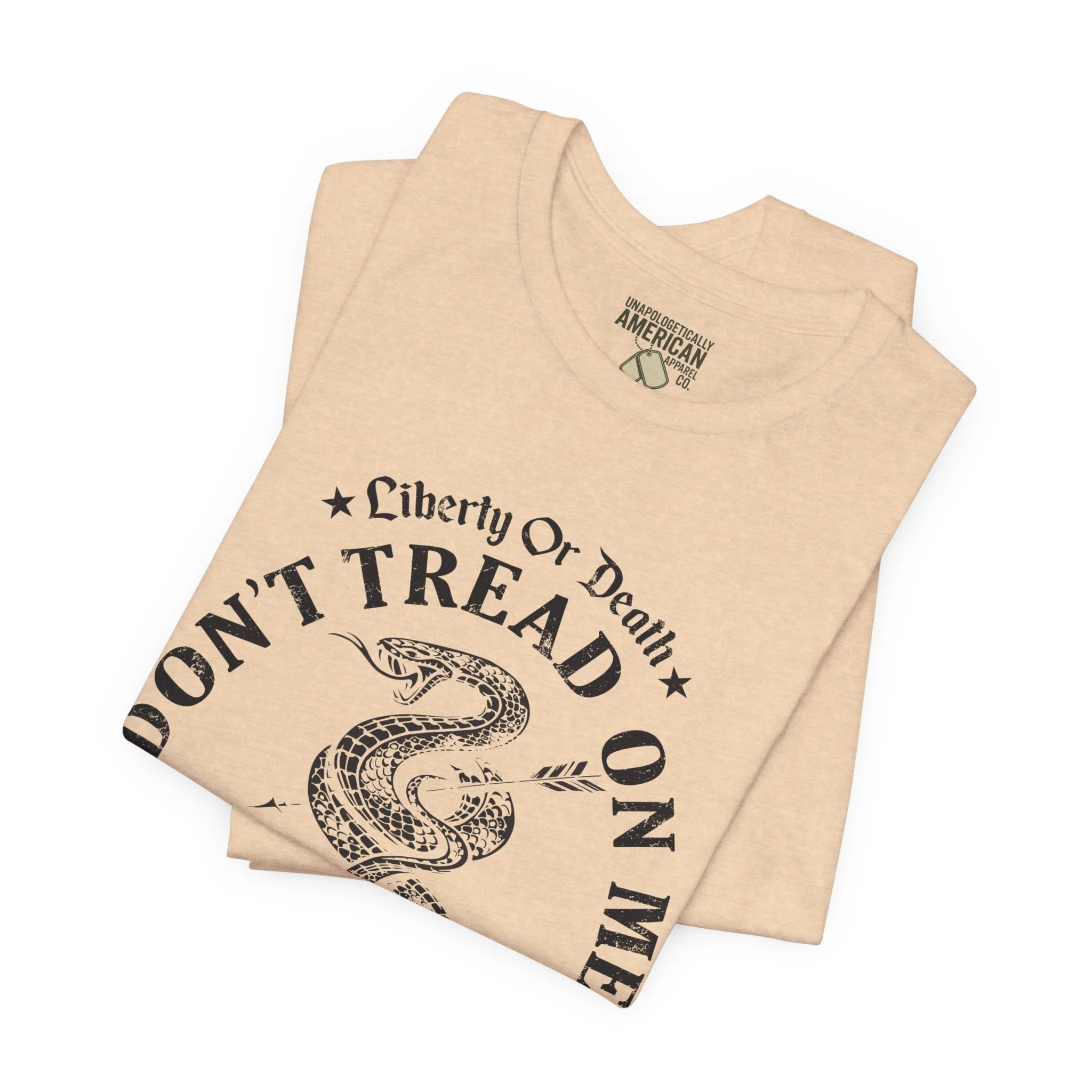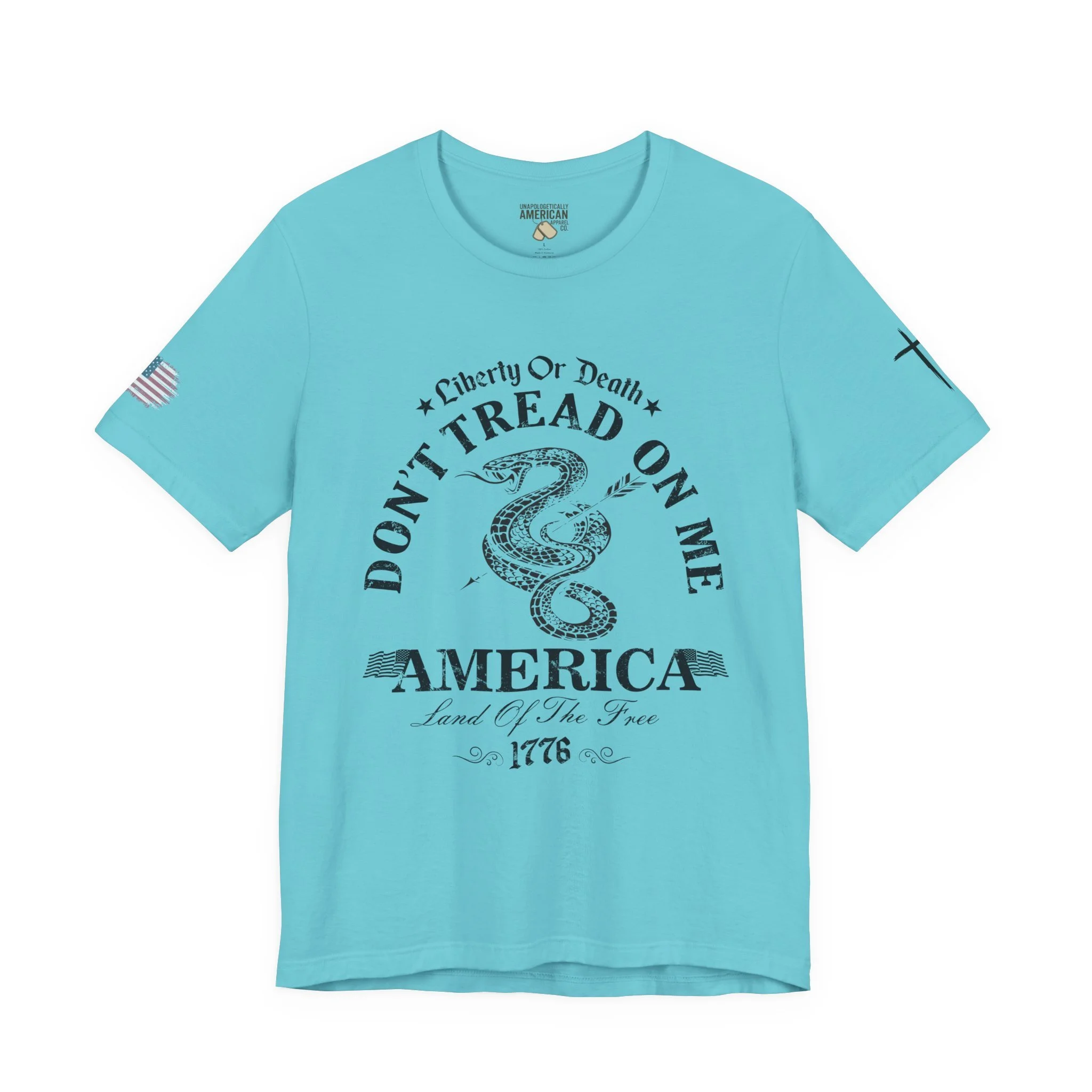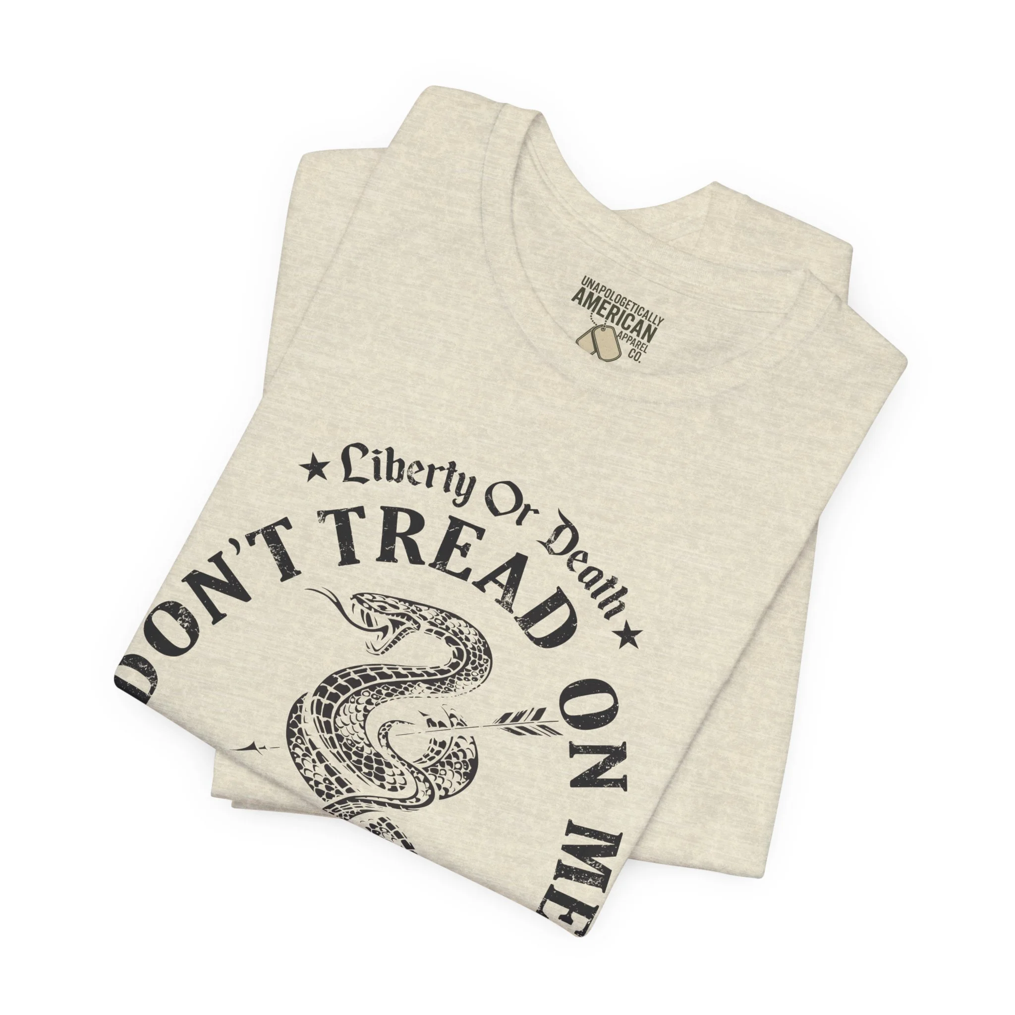 A lightweight, vintage-style tee that channels classic American rebellion with a worn-in graphic and clean crew neckline. The soft Airlume combed cotton feels breathable against the skin, while side seams and shoulder tape keep the silhouette crisp across everyday wear. Distressed print details — a coiled rattlesnake, “Don’t Tread On Me,” and Americana text — give it a lived-in, rally-ready look that layers easily under jackets or wears alone for casual statements. Subtle sleeve prints (flag and cross) add quiet, intentional accents without overpowering the chest image. Sized in a retail fit with a tear-away label for comfort, this shirt balances heritage style with modern comfort and responsible manufacturing.