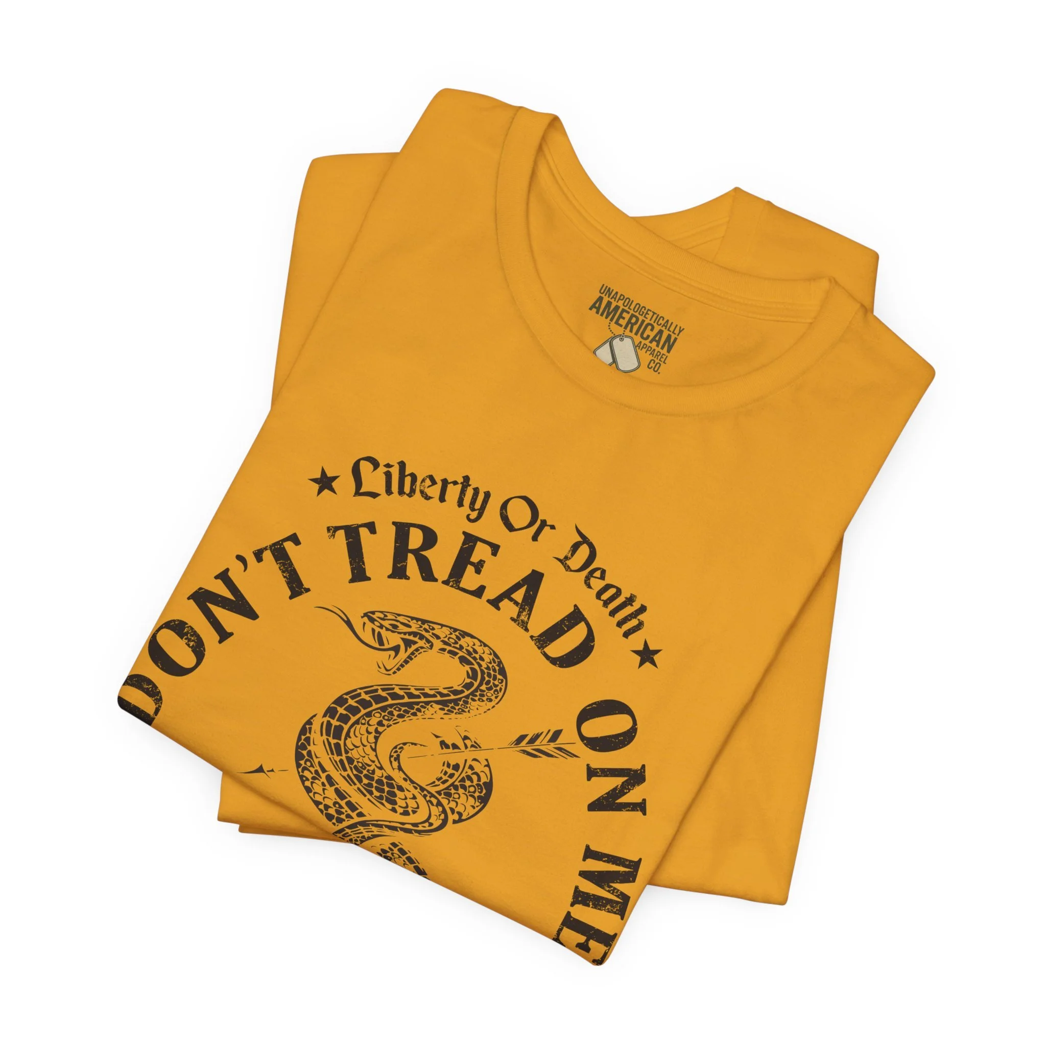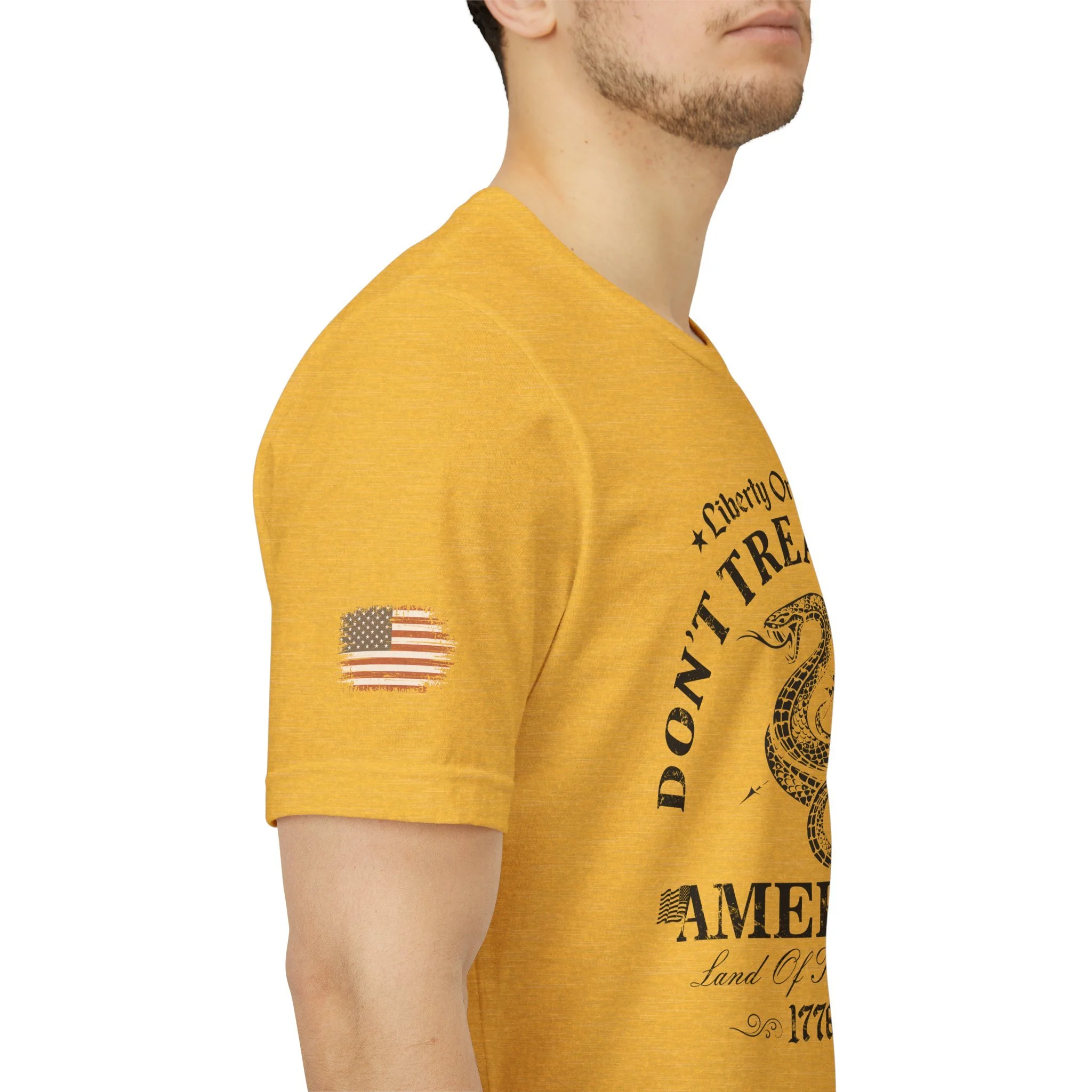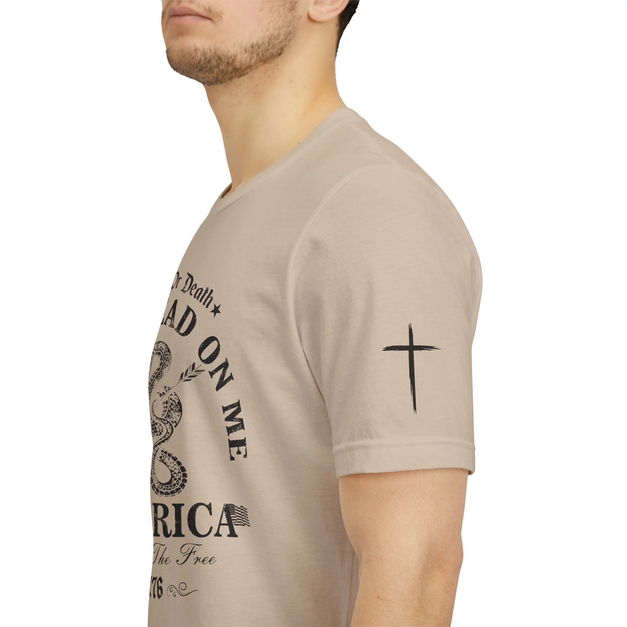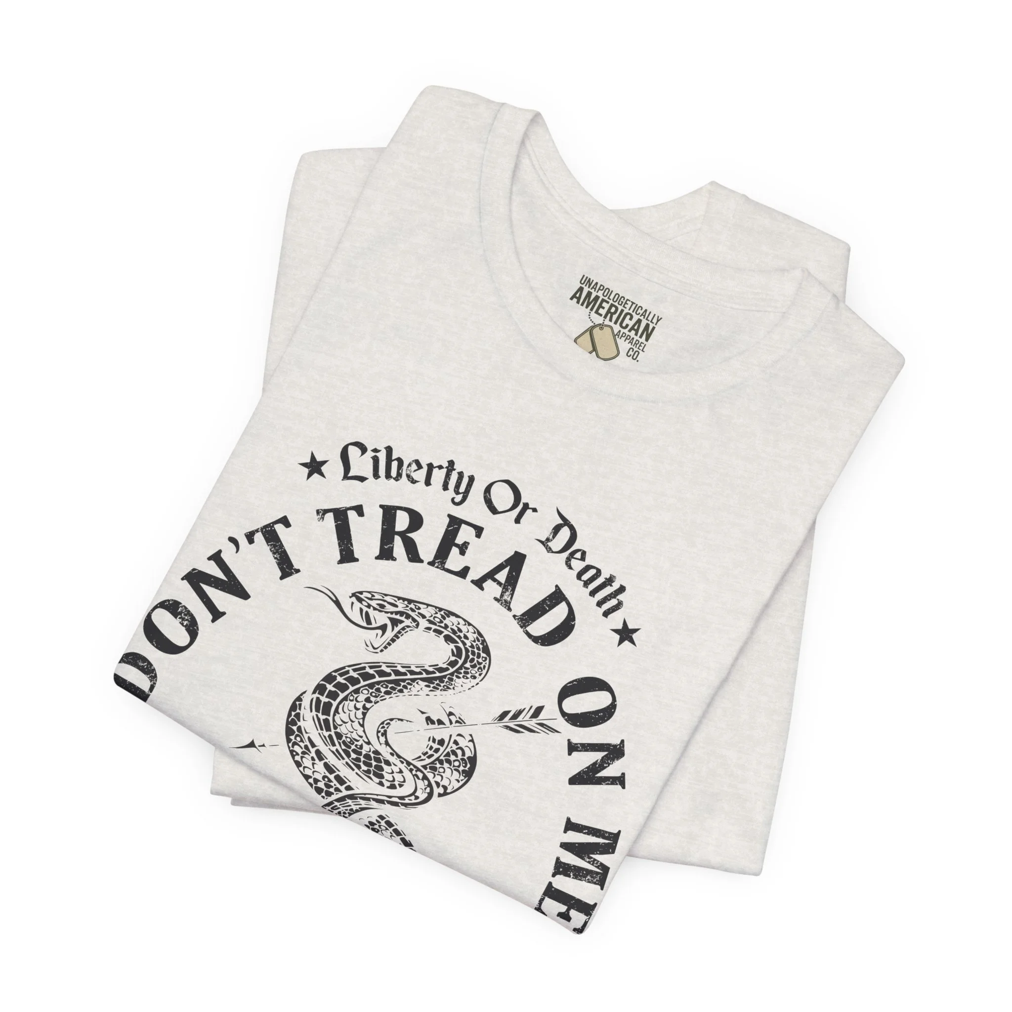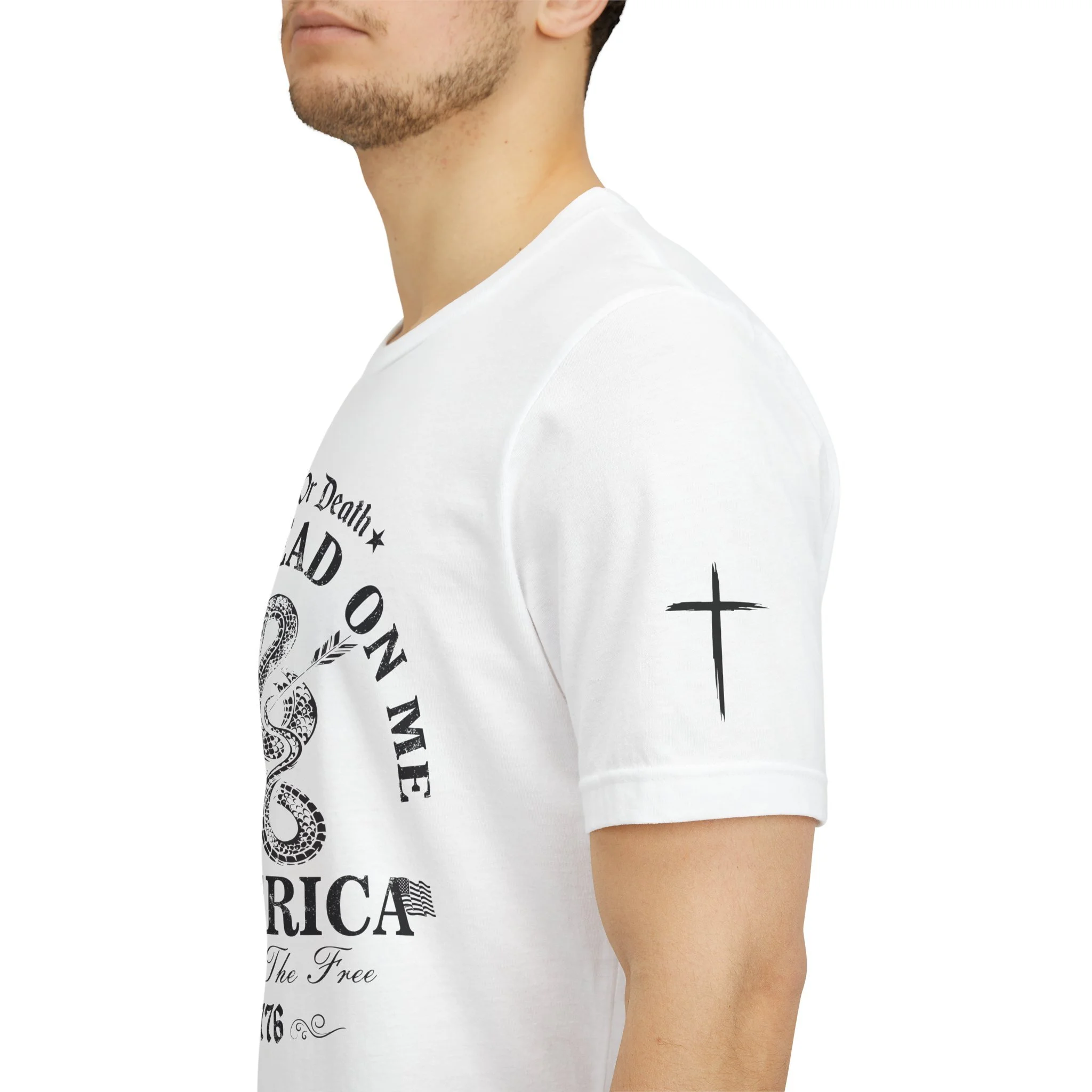 A lightweight, vintage-style tee that channels classic American rebellion with a worn-in graphic and clean crew neckline. The soft Airlume combed cotton feels breathable against the skin, while side seams and shoulder tape keep the silhouette crisp across everyday wear. Distressed print details — a coiled rattlesnake, “Don’t Tread On Me,” and Americana text — give it a lived-in, rally-ready look that layers easily under jackets or wears alone for casual statements. Subtle sleeve prints (flag and cross) add quiet, intentional accents without overpowering the chest image. Sized in a retail fit with a tear-away label for comfort, this shirt balances heritage style with modern comfort and responsible manufacturing.