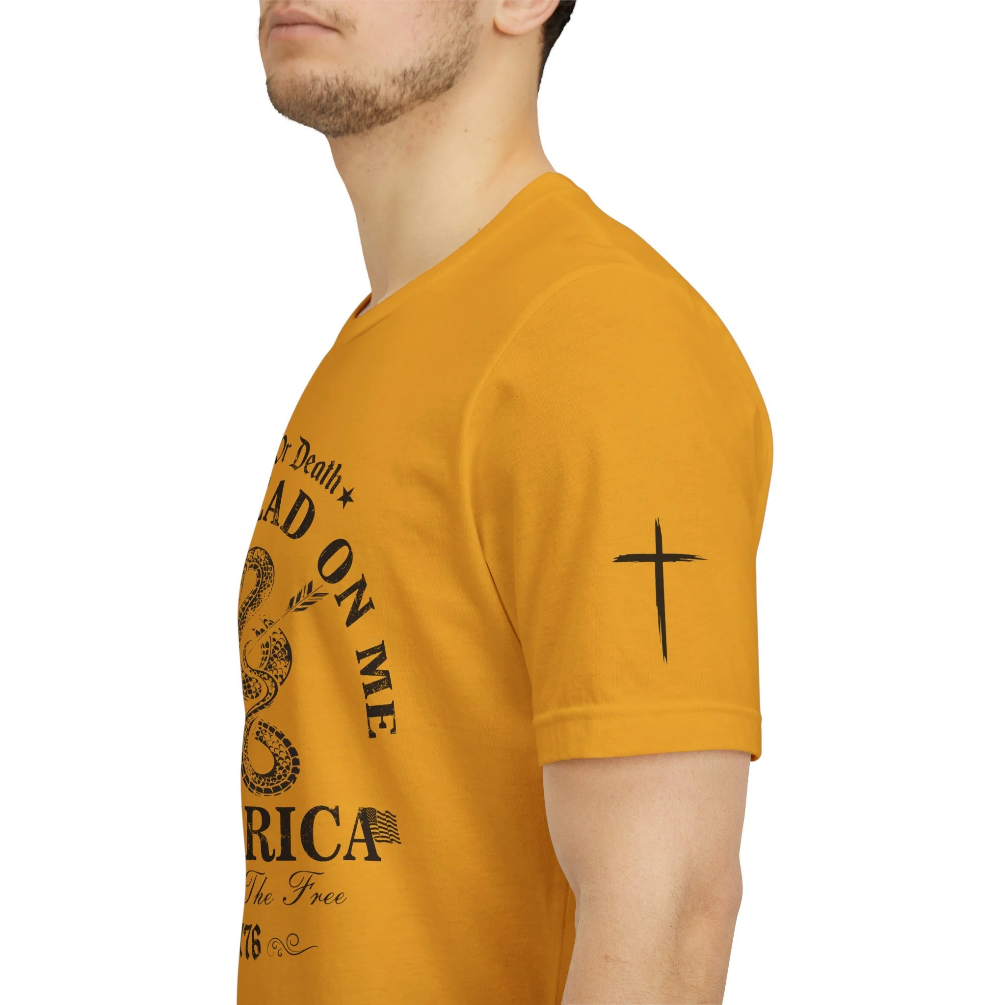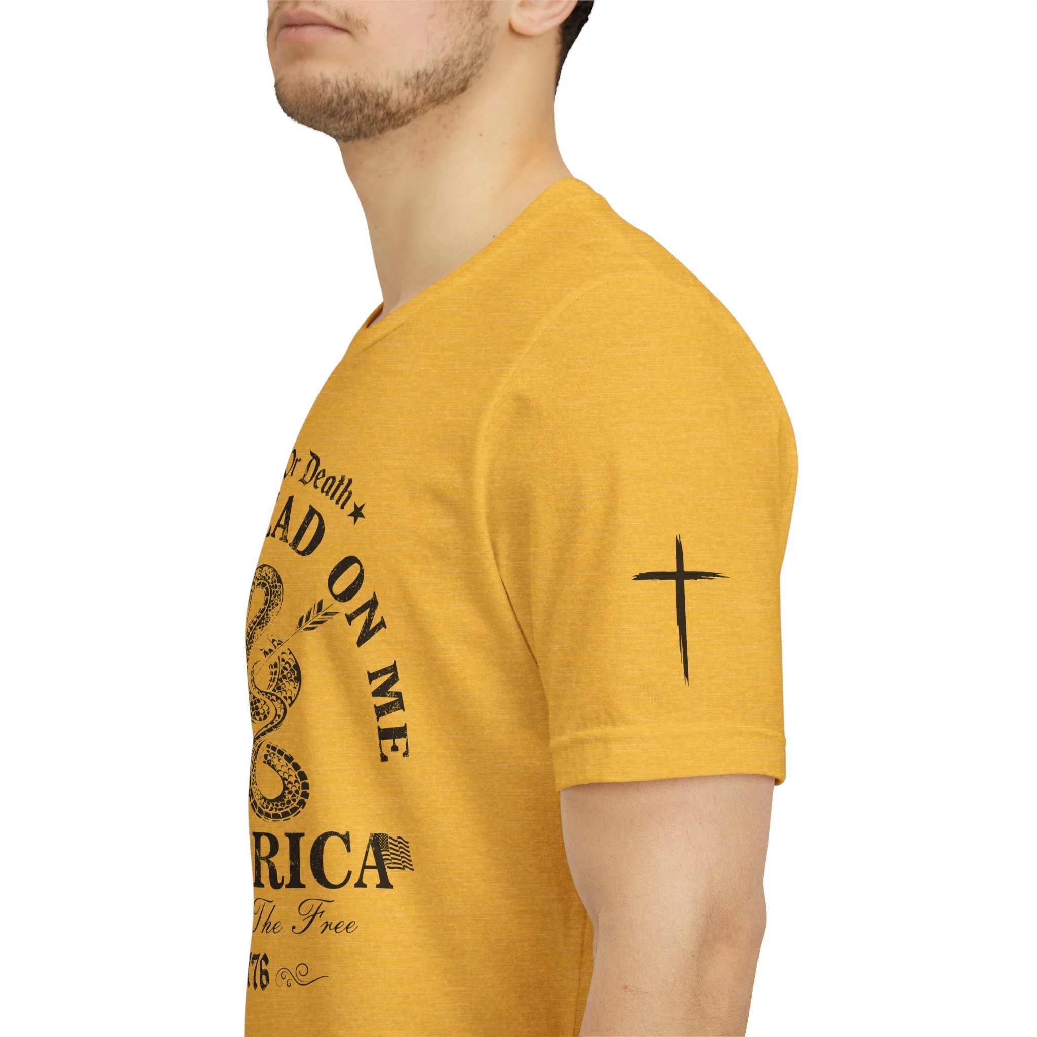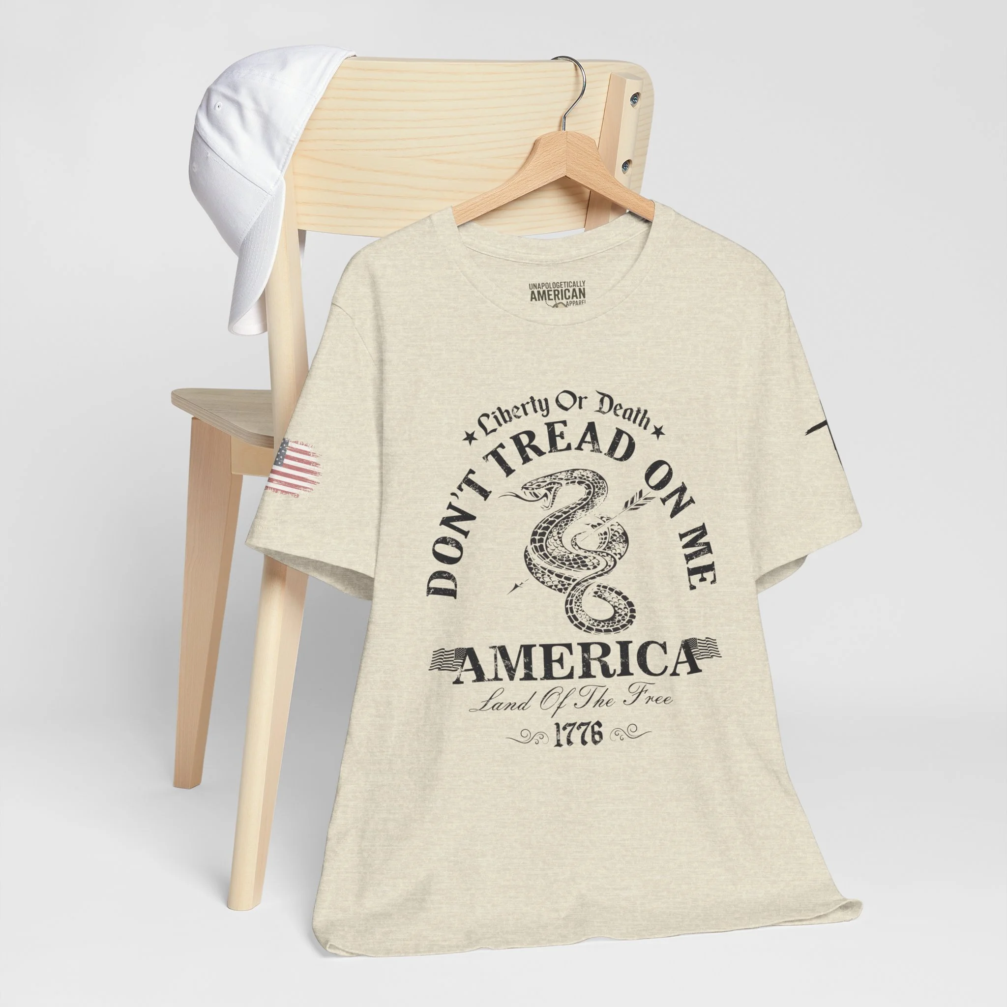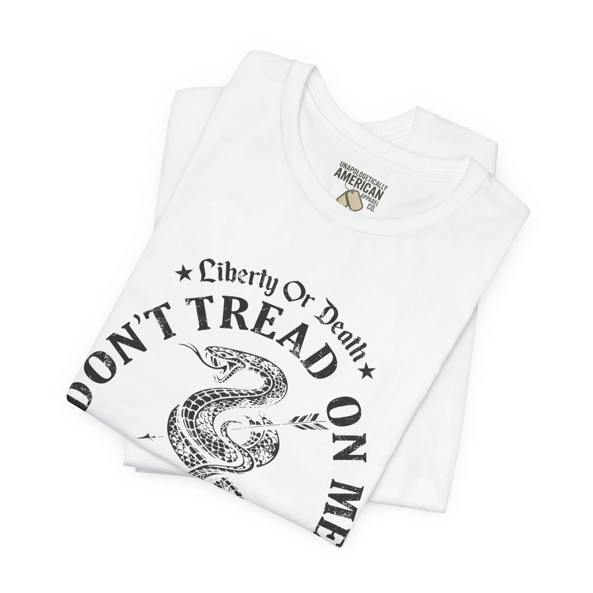A lightweight, vintage-style tee that channels classic American rebellion with a worn-in graphic and clean crew neckline. The soft Airlume combed cotton feels breathable against the skin, while side seams and shoulder tape keep the silhouette crisp across everyday wear. Distressed print details — a coiled rattlesnake, “Don’t Tread On Me,” and Americana text — give it a lived-in, rally-ready look that layers easily under jackets or wears alone for casual statements. Subtle sleeve prints (flag and cross) add quiet, intentional accents without overpowering the chest image. Sized in a retail fit with a tear-away label for comfort, this shirt balances heritage style with modern comfort and responsible manufacturing.