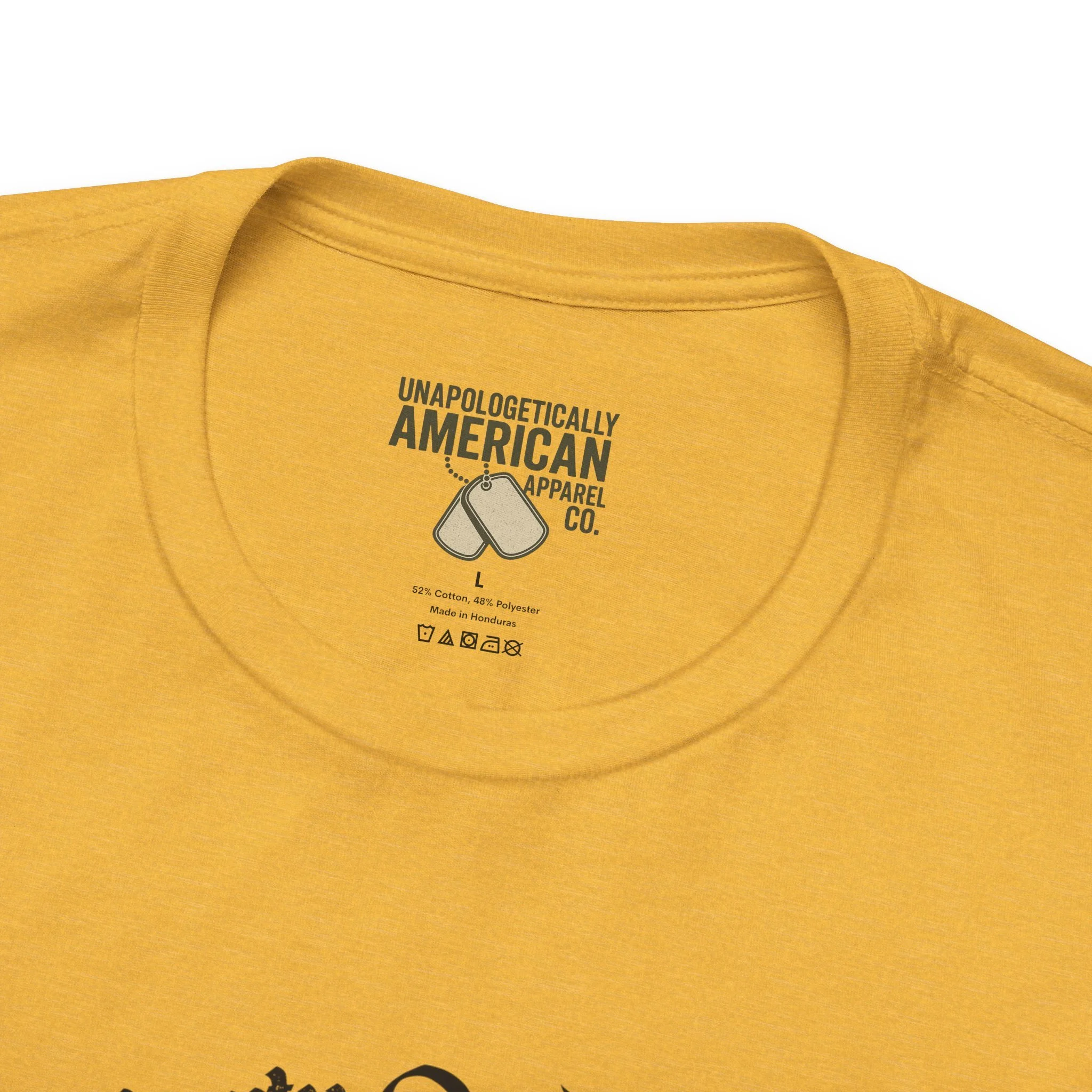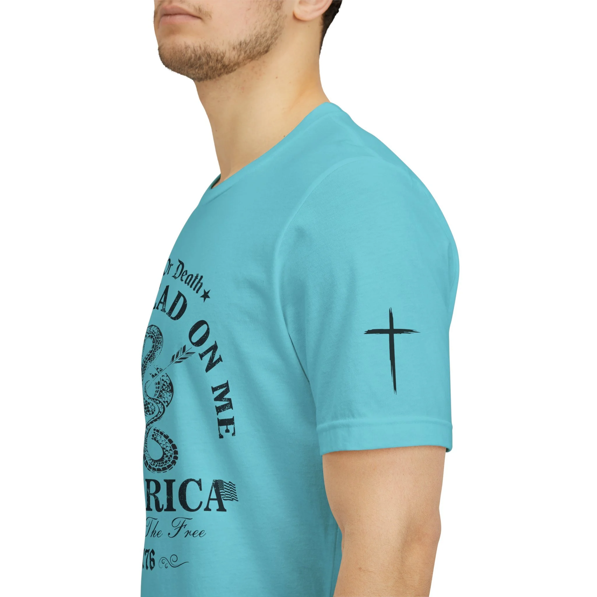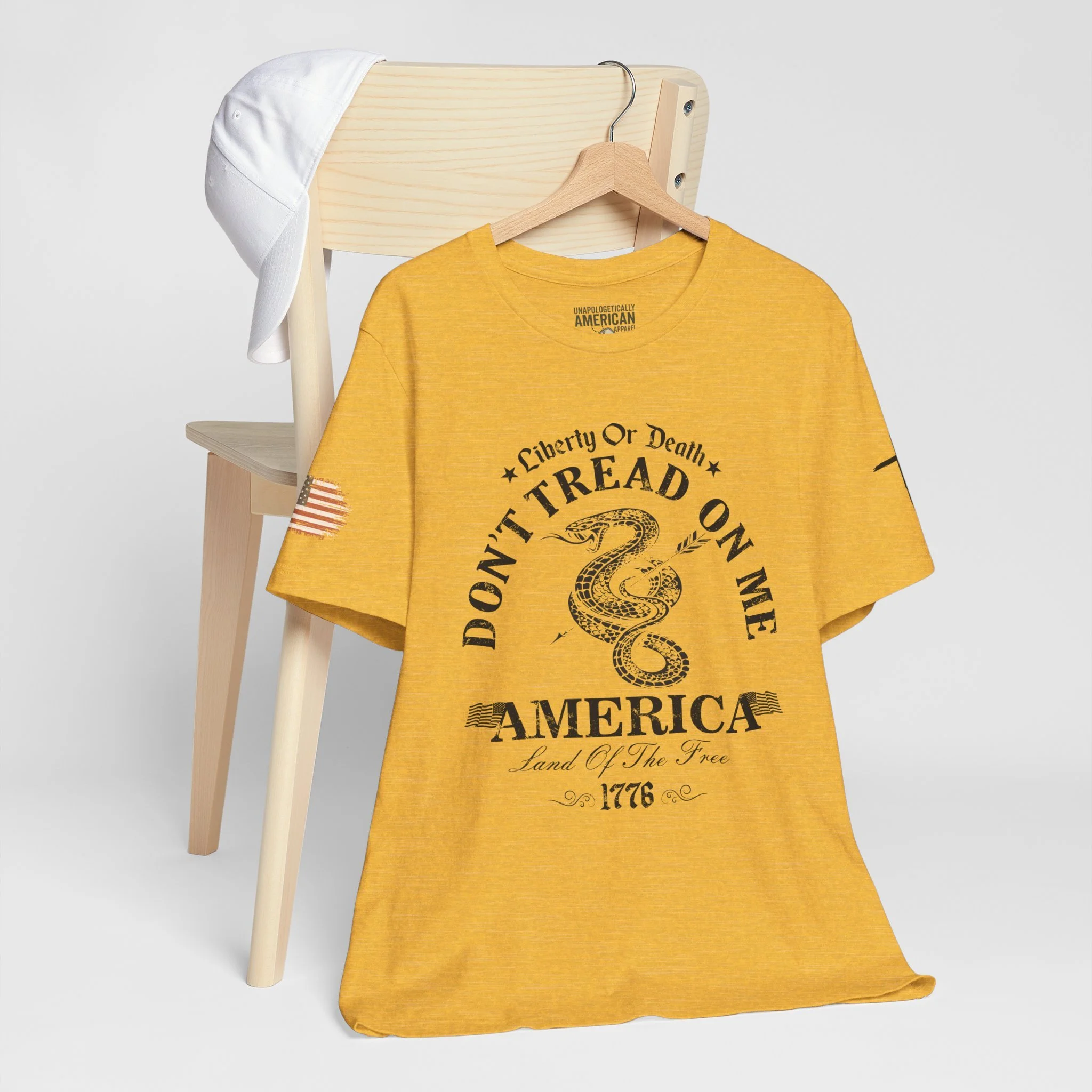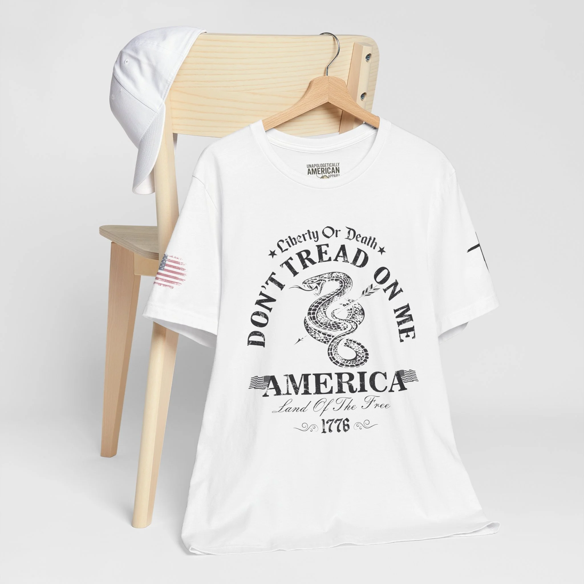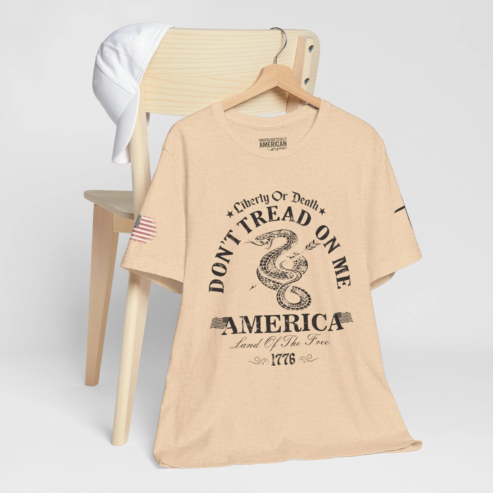 A lightweight, vintage-style tee that channels classic American rebellion with a worn-in graphic and clean crew neckline. The soft Airlume combed cotton feels breathable against the skin, while side seams and shoulder tape keep the silhouette crisp across everyday wear. Distressed print details — a coiled rattlesnake, “Don’t Tread On Me,” and Americana text — give it a lived-in, rally-ready look that layers easily under jackets or wears alone for casual statements. Subtle sleeve prints (flag and cross) add quiet, intentional accents without overpowering the chest image. Sized in a retail fit with a tear-away label for comfort, this shirt balances heritage style with modern comfort and responsible manufacturing.