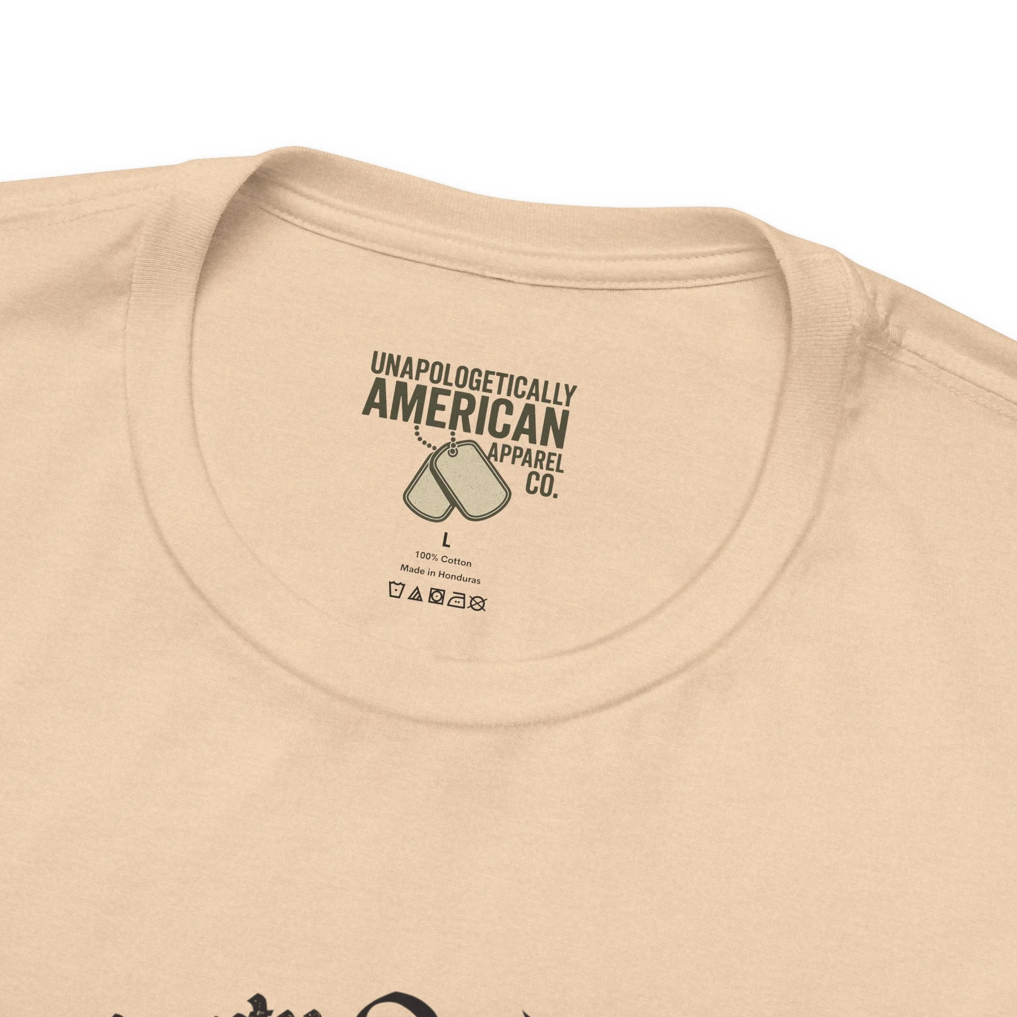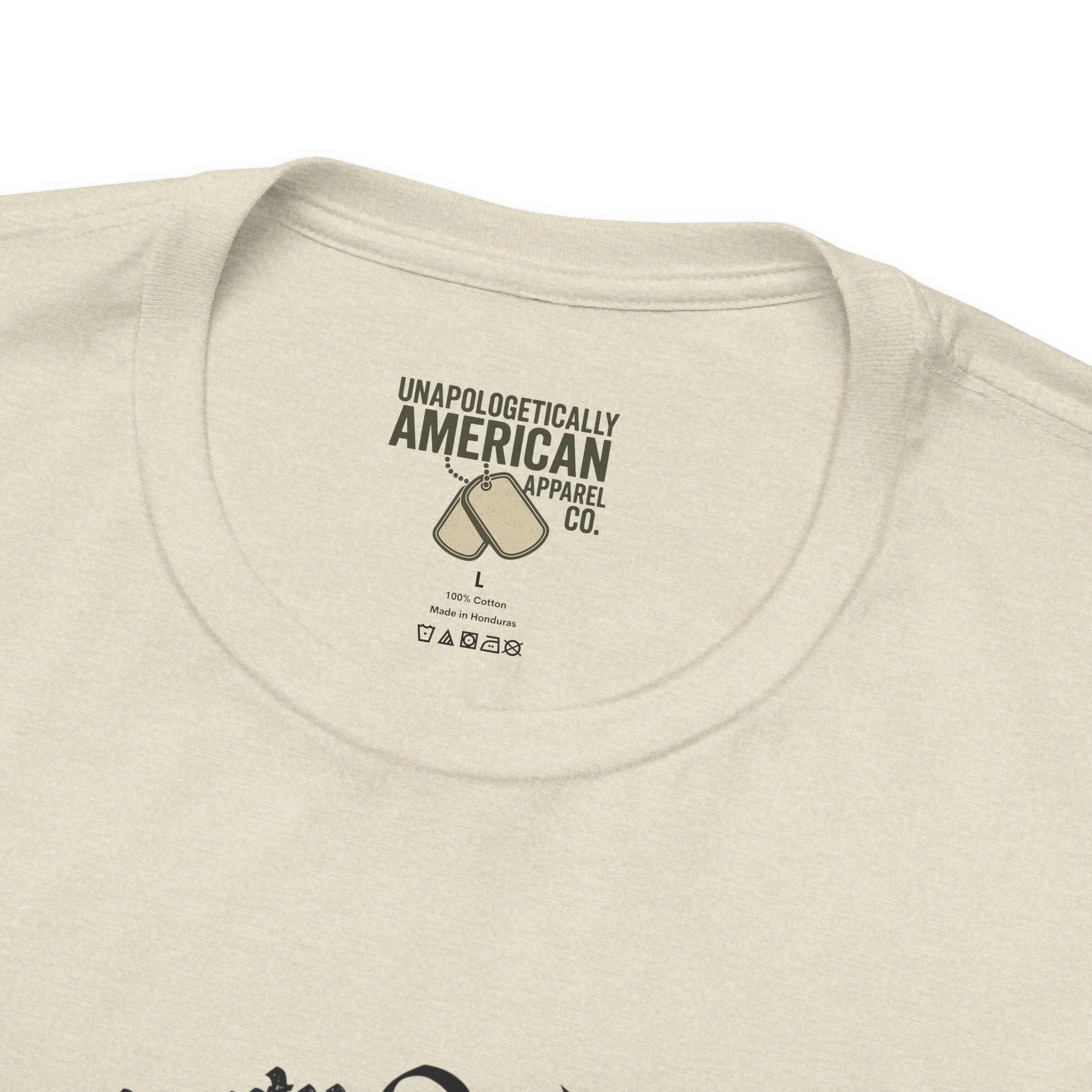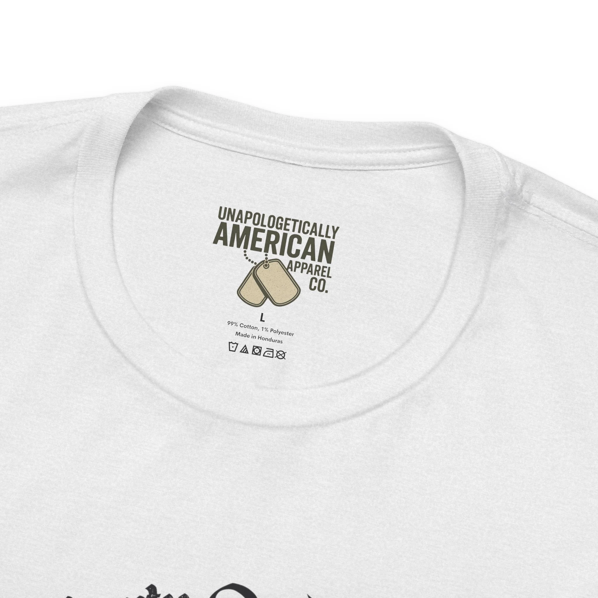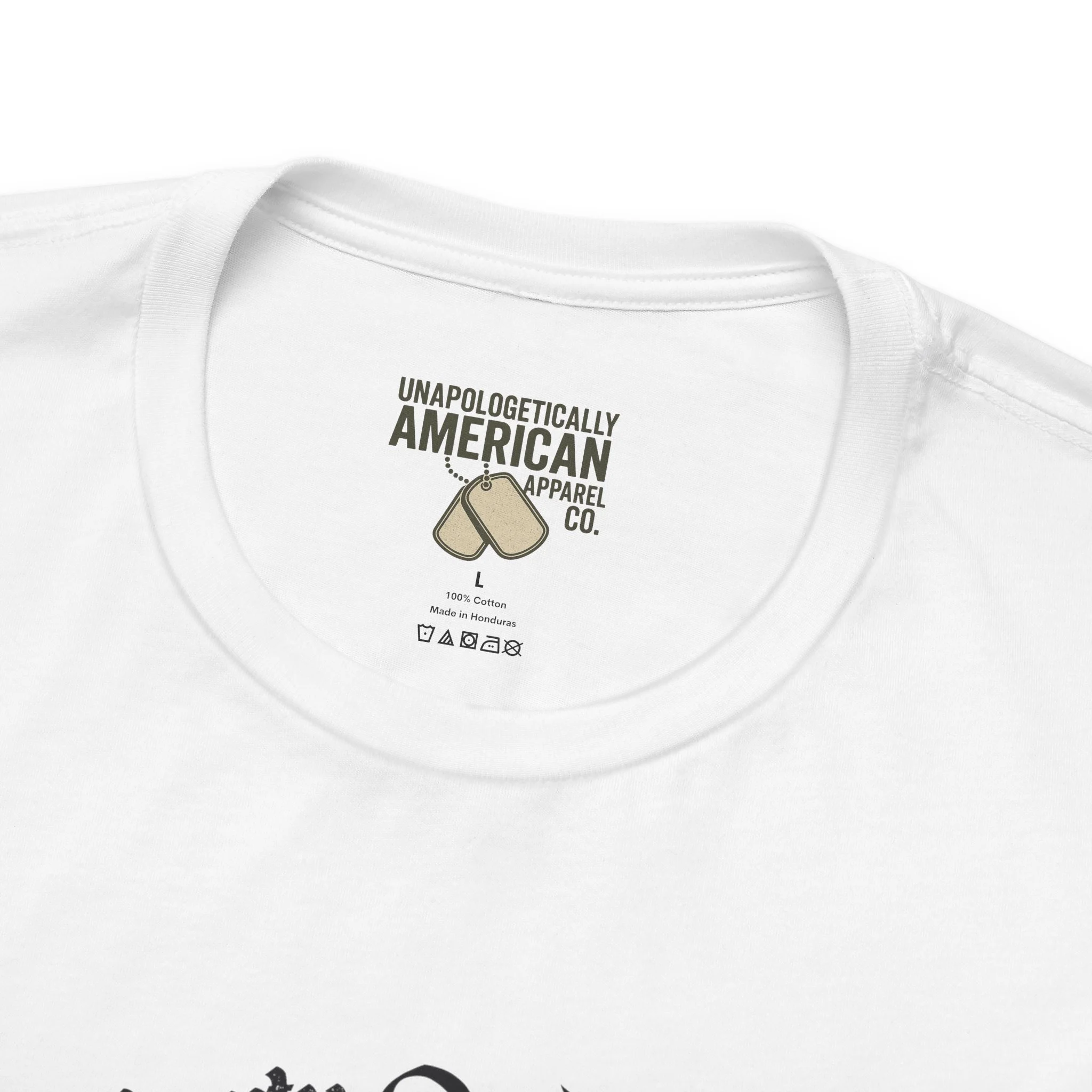 - Distressed front graphic and subtle sleeve prints (flag on one sleeve, cross on the other)