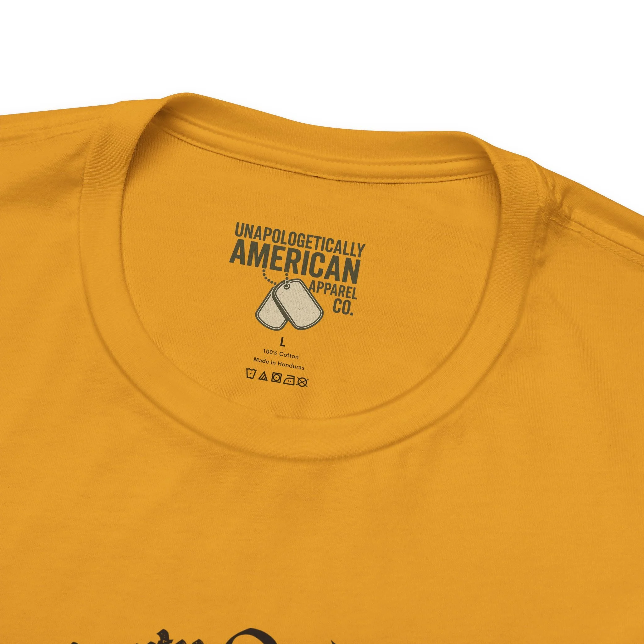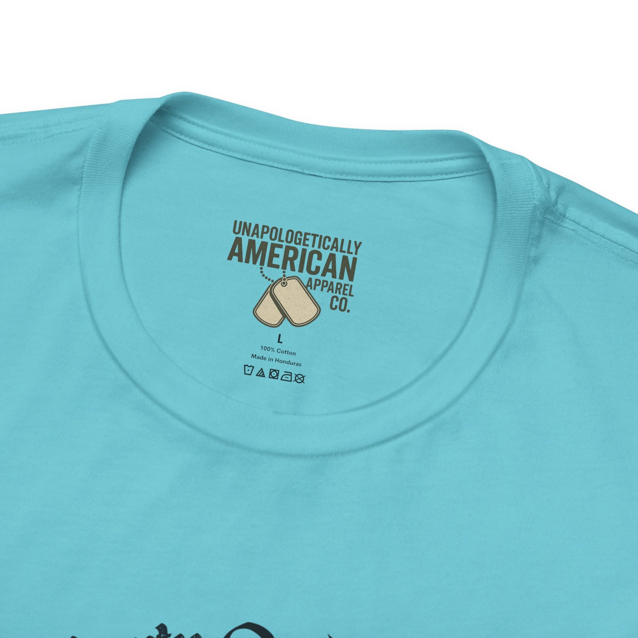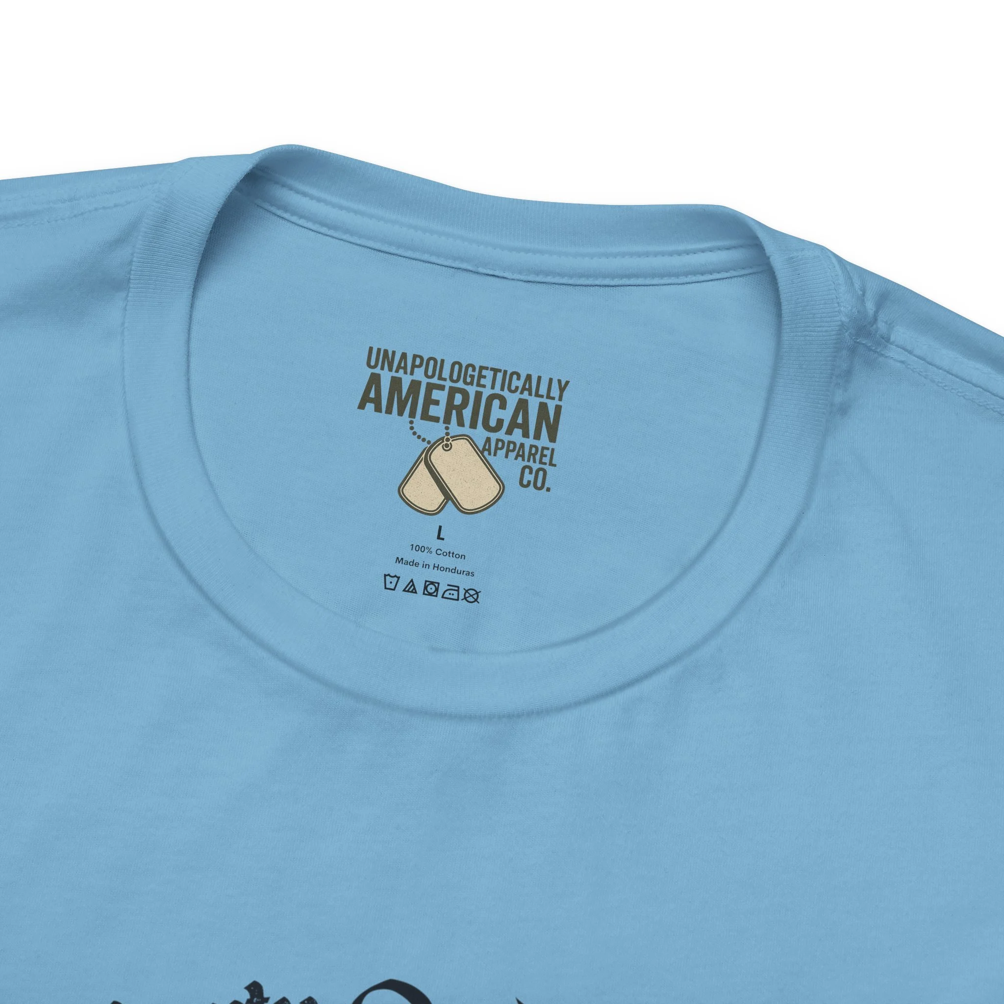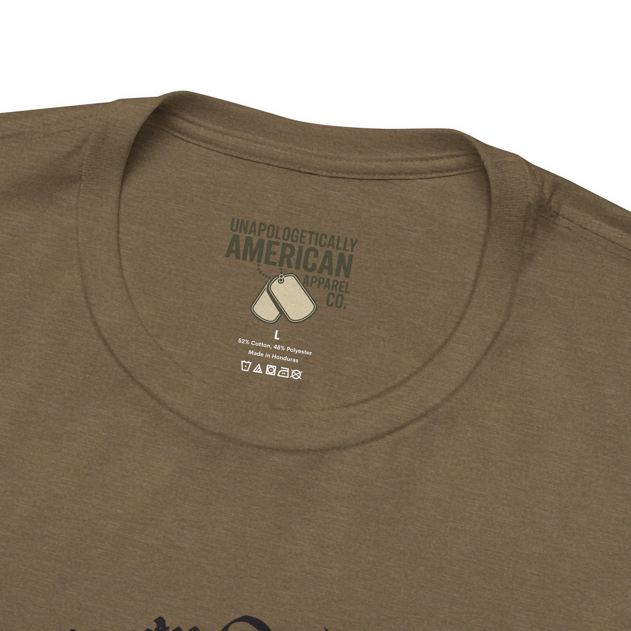 - Distressed front graphic and subtle sleeve prints (flag on one sleeve, cross on the other)