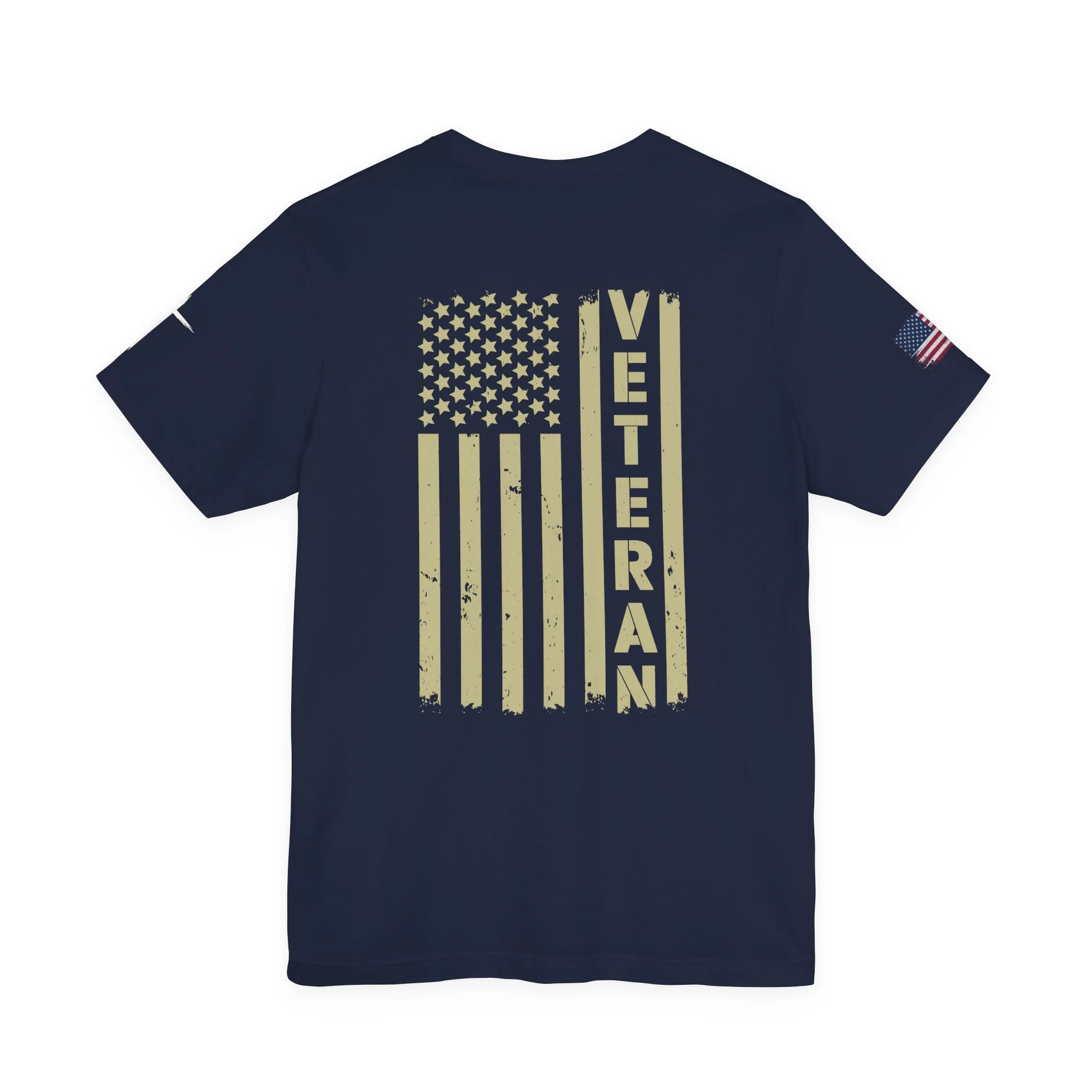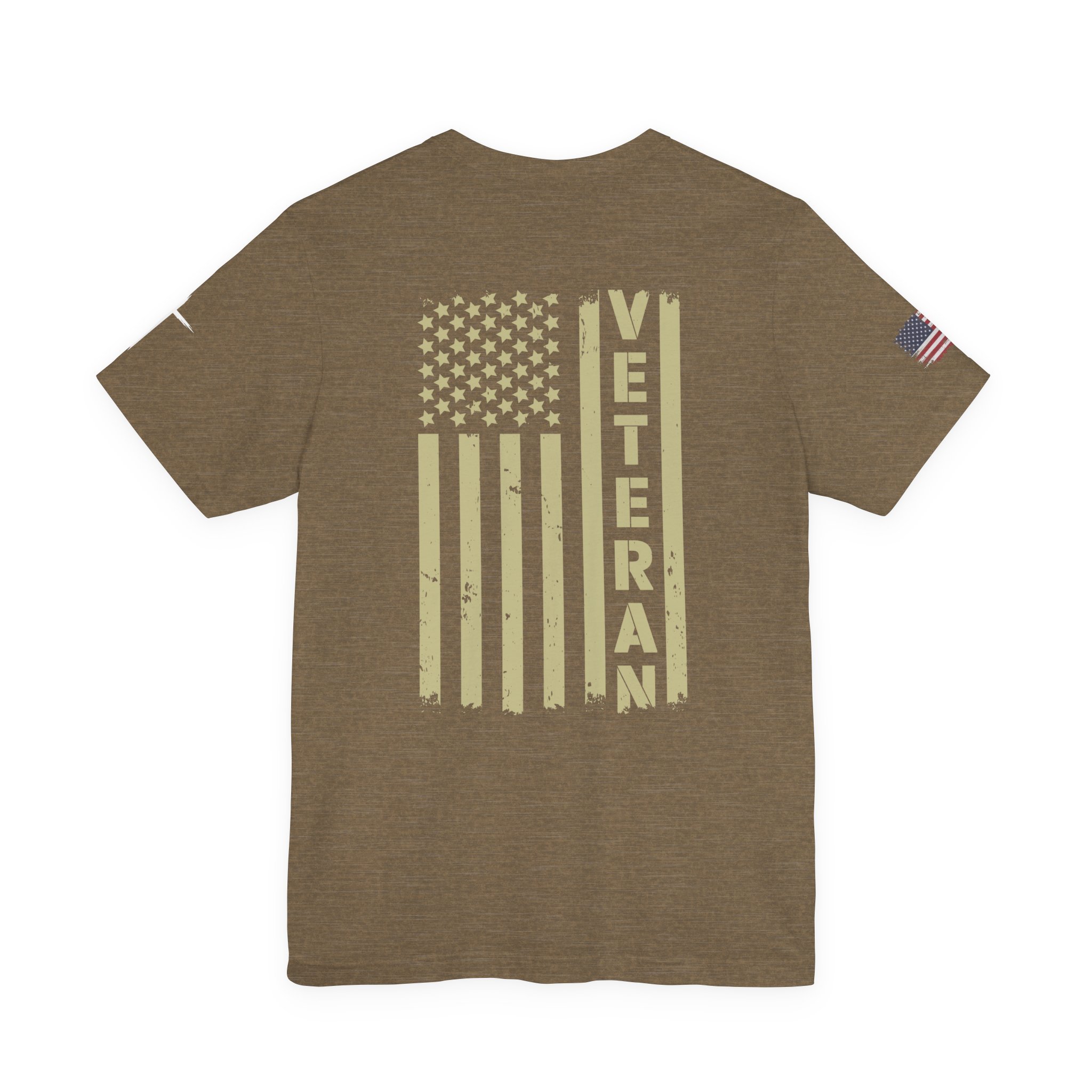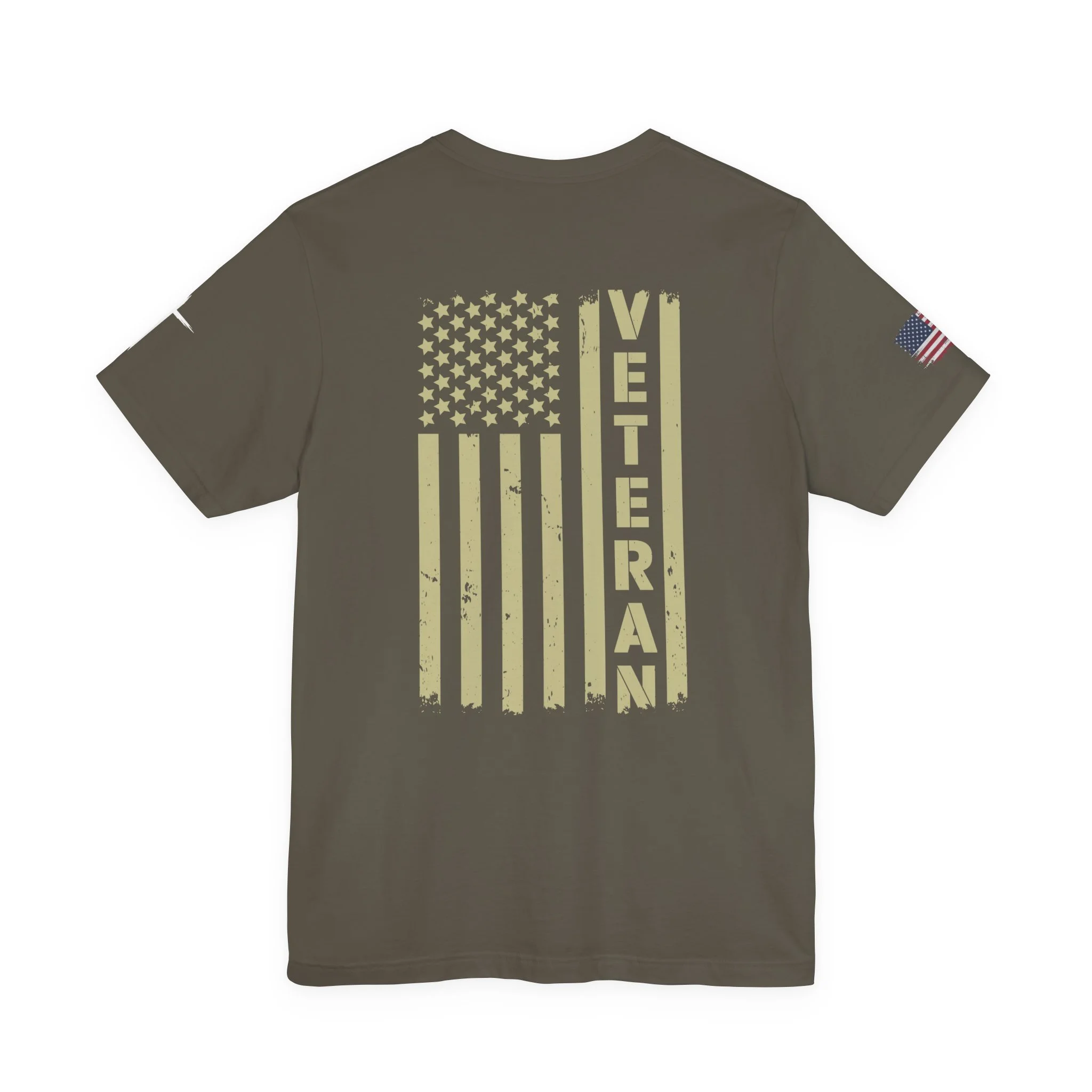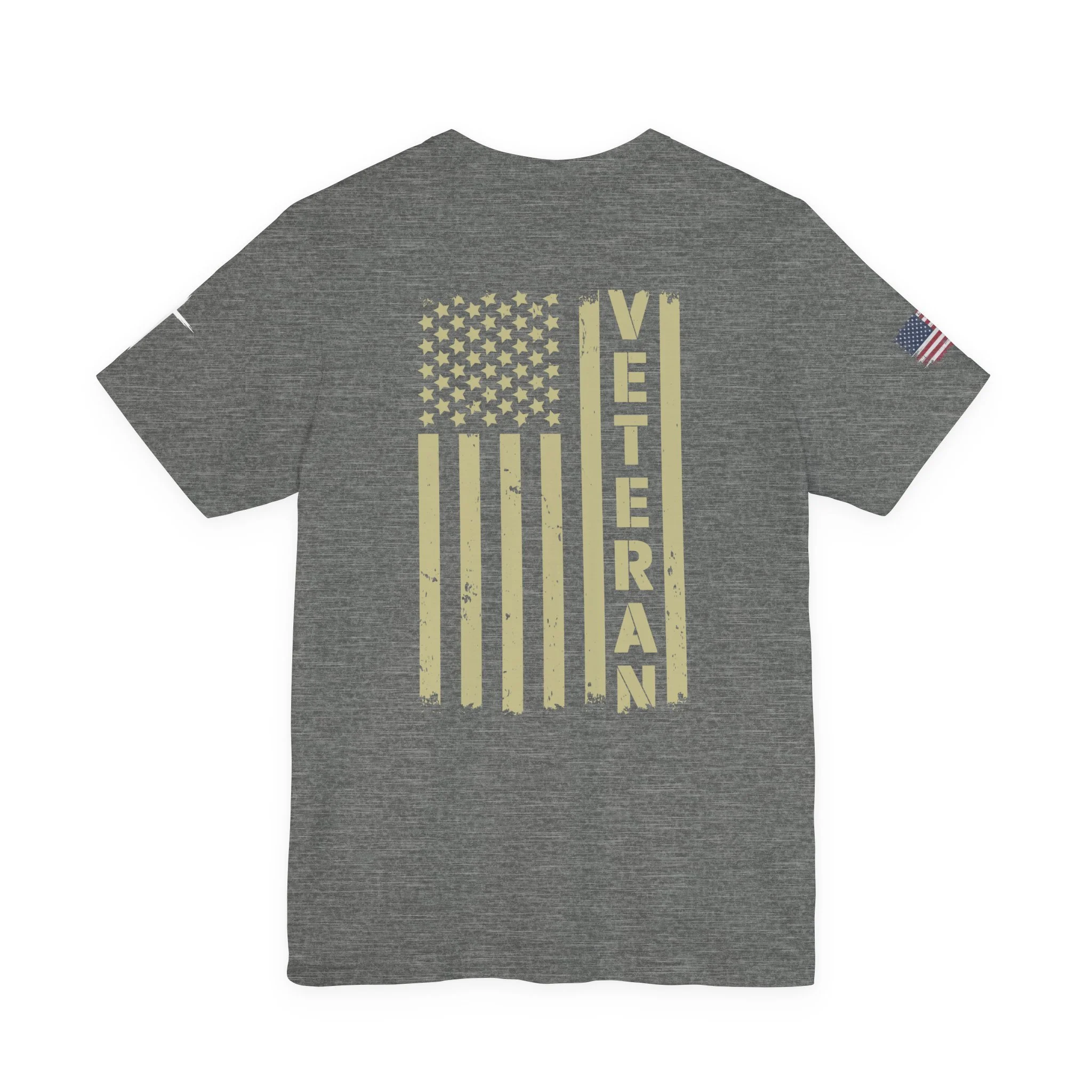 - Distressed chest flag graphic with vertical “VETERAN” text; small American flag print on sleeve