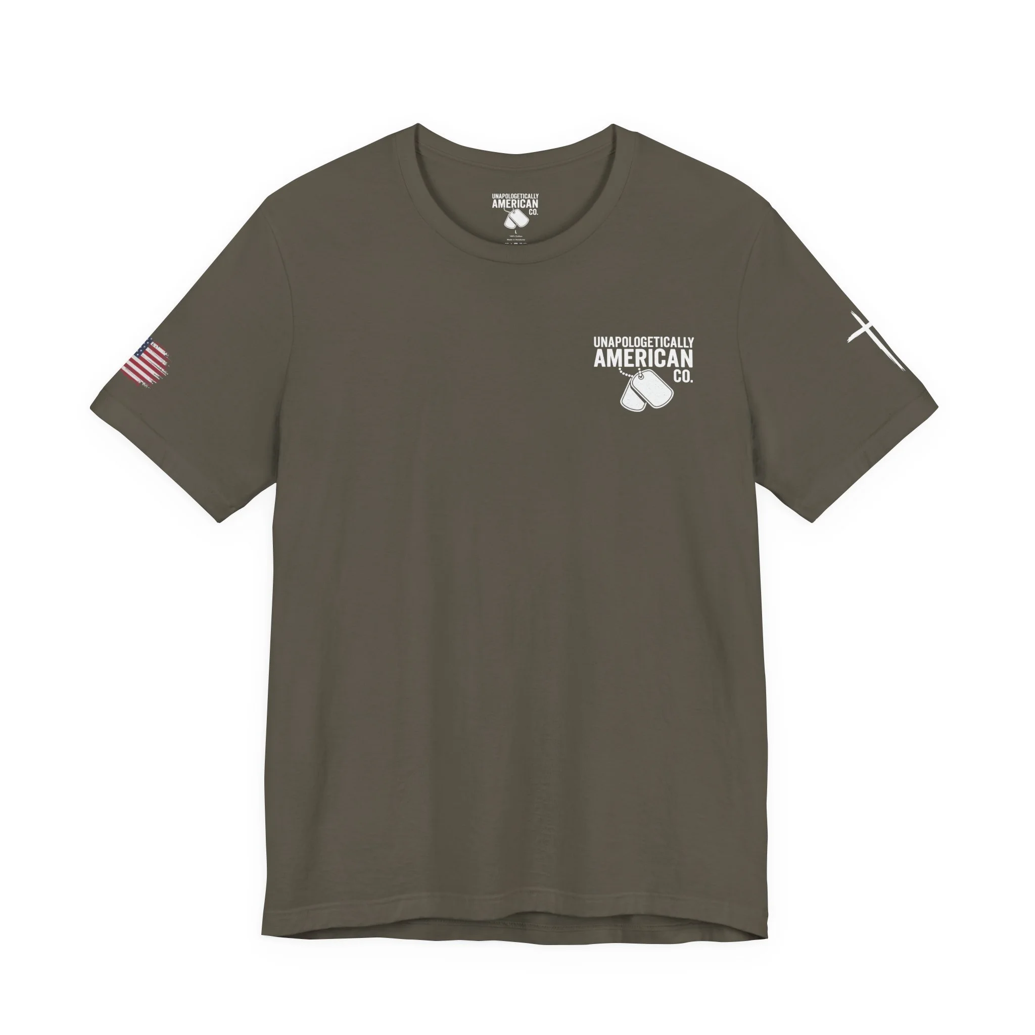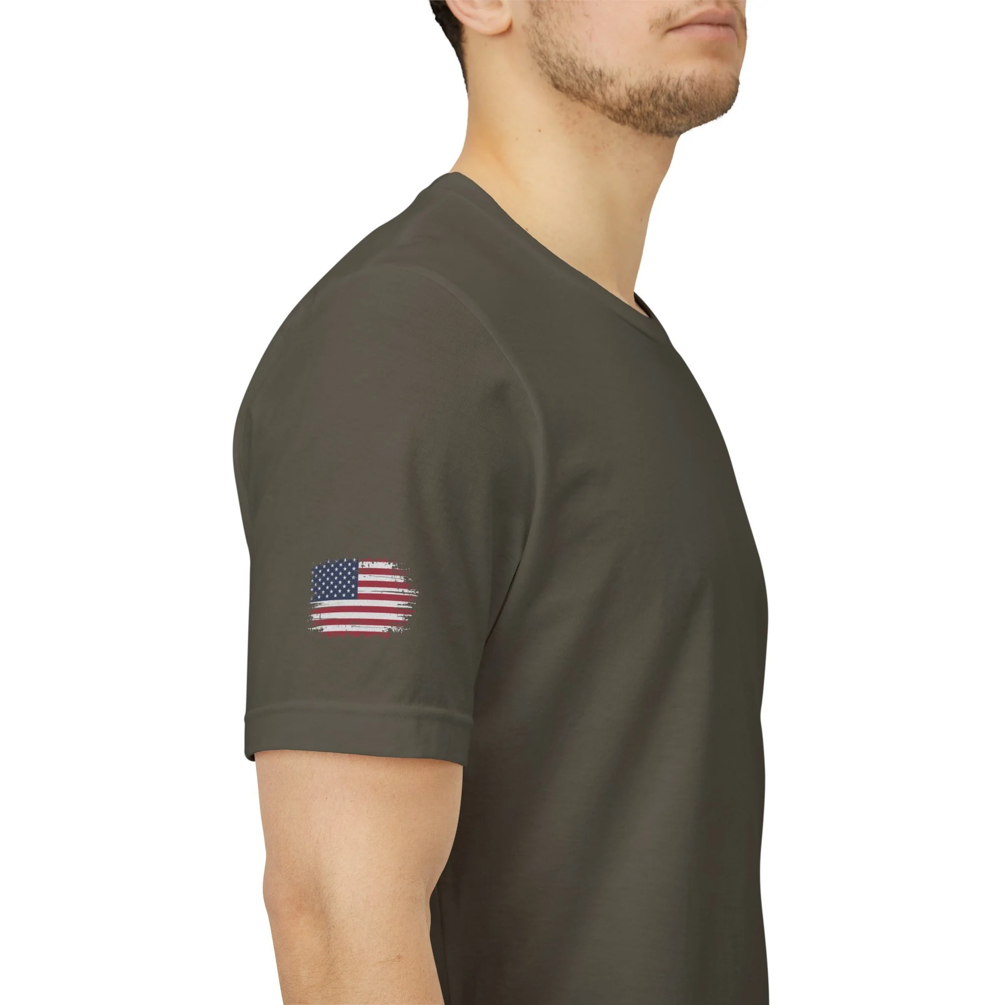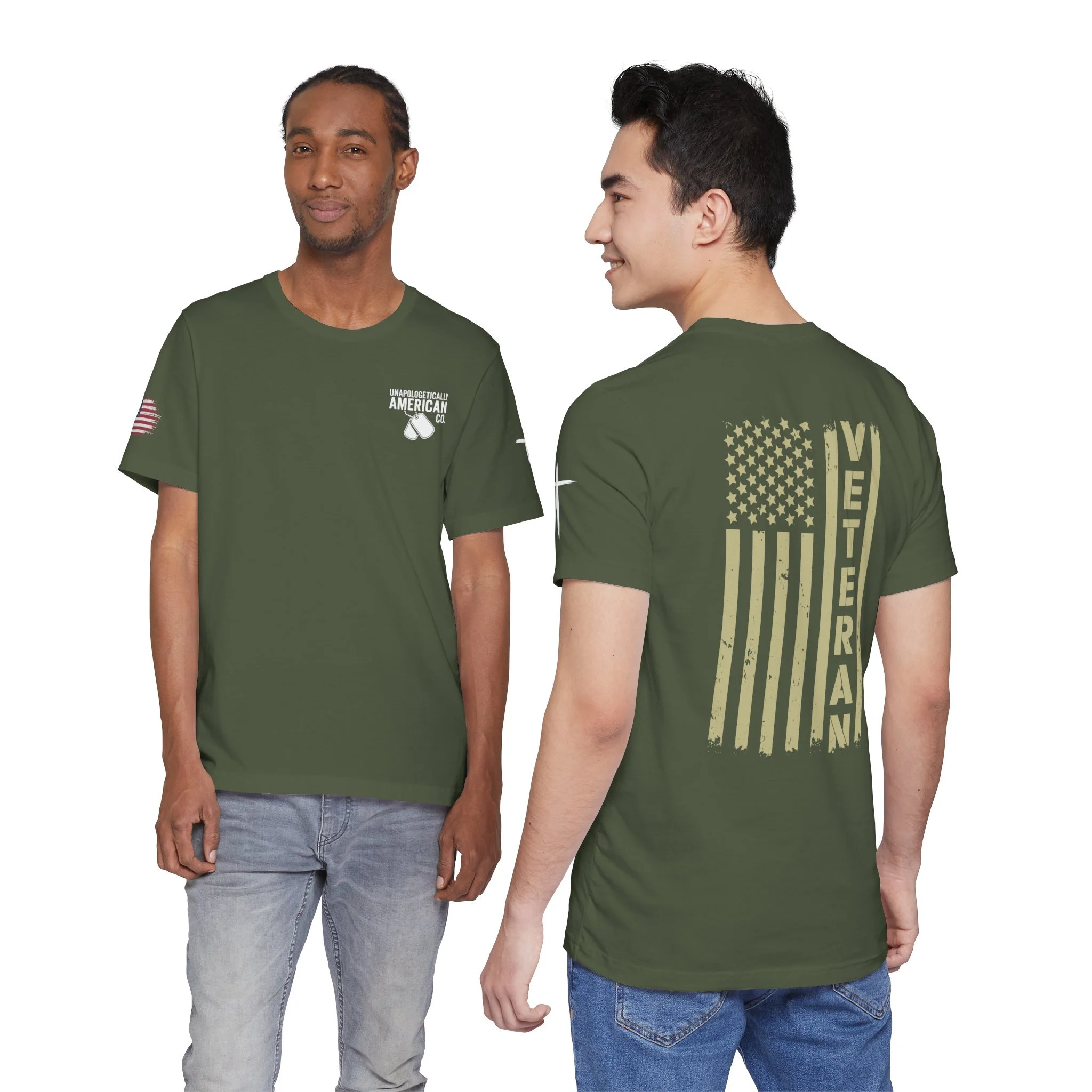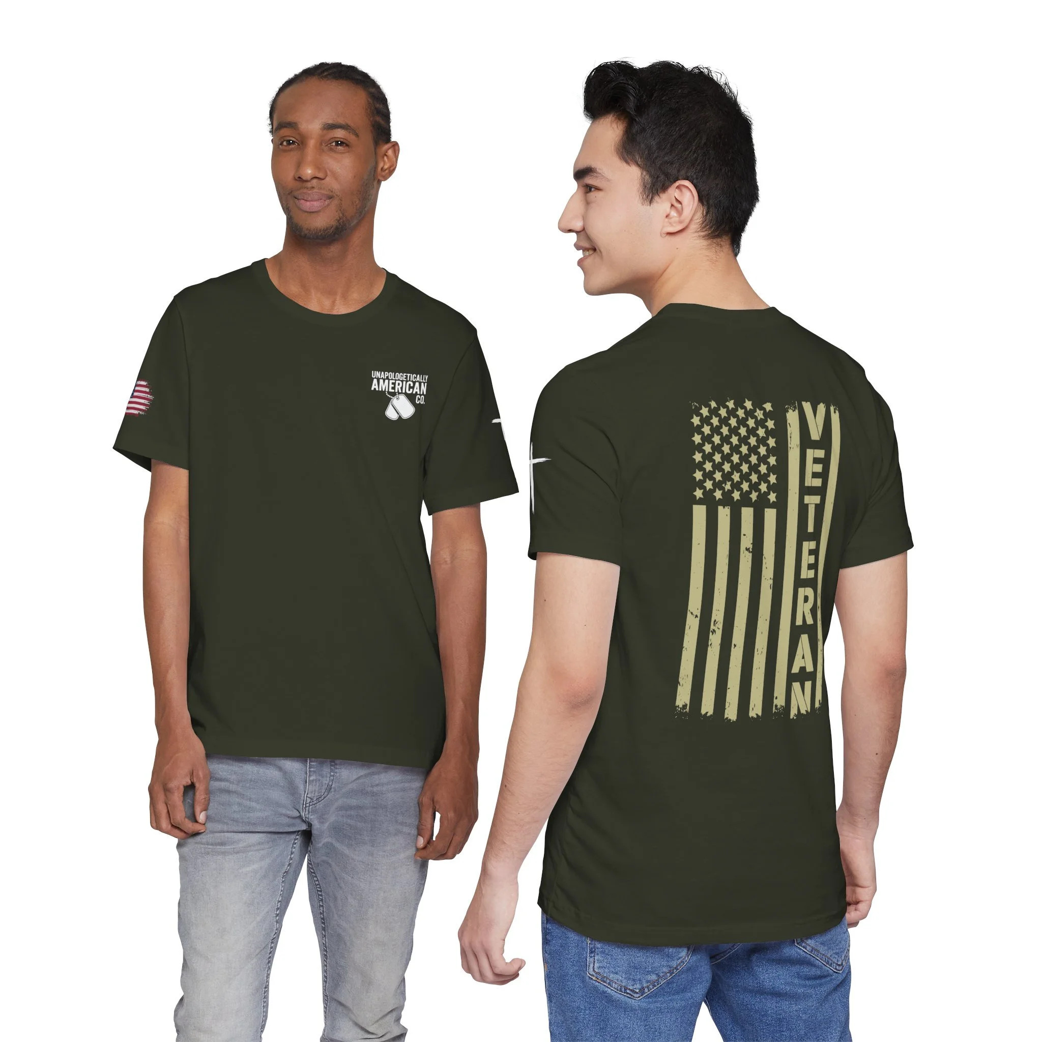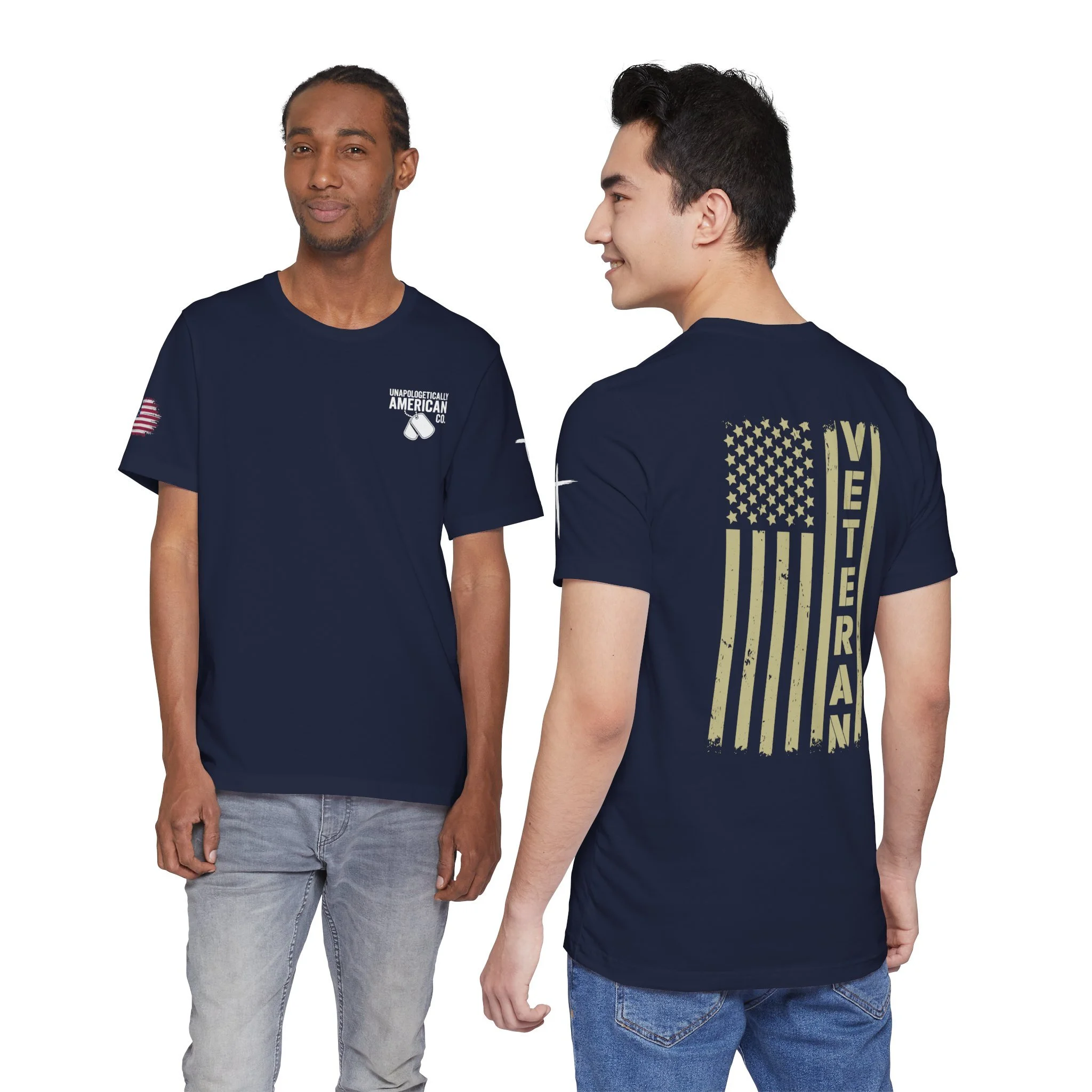 - Distressed chest flag graphic with vertical “VETERAN” text; small American flag print on sleeve