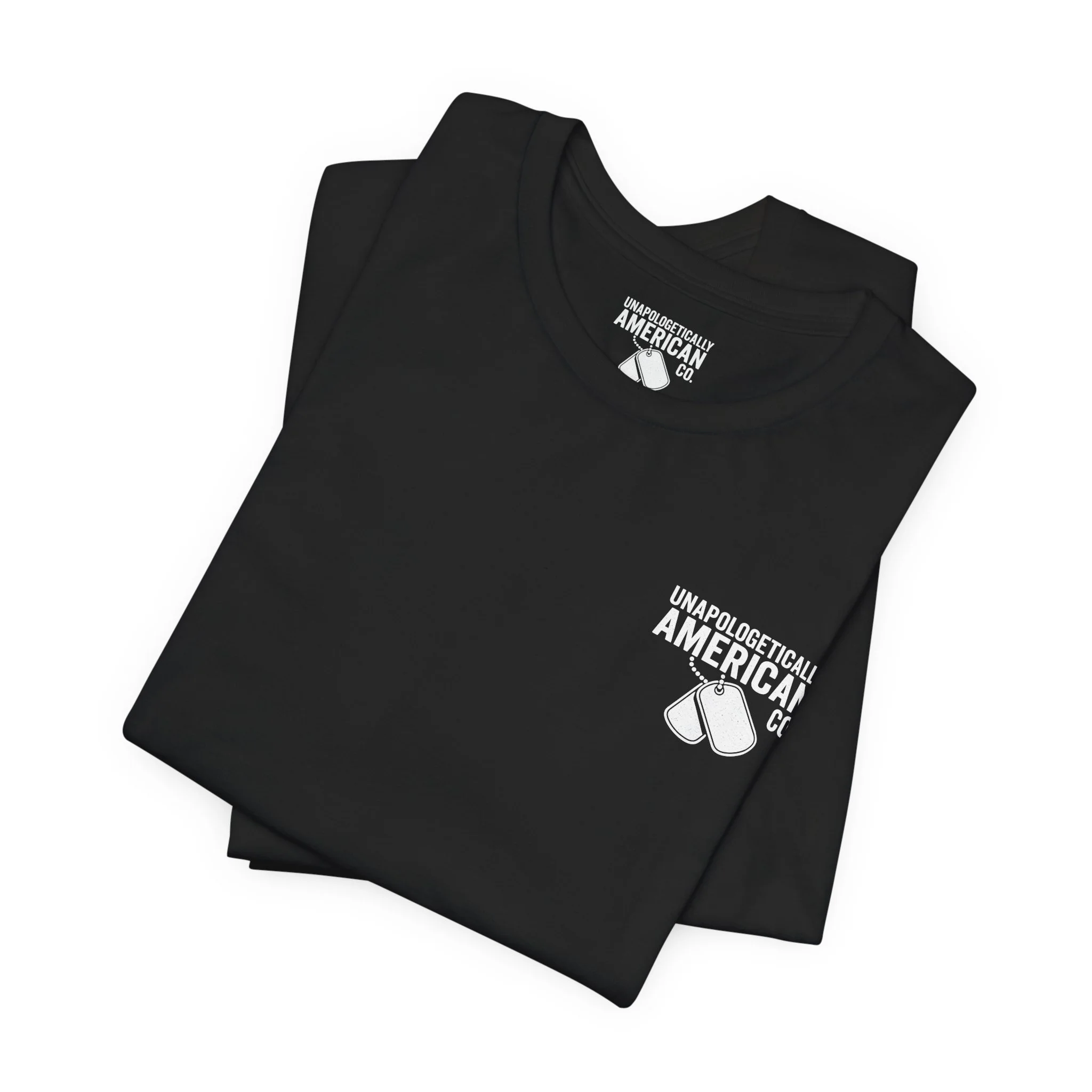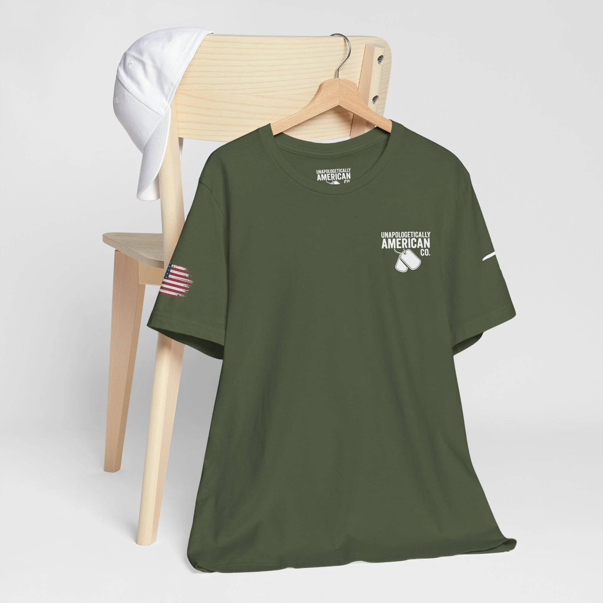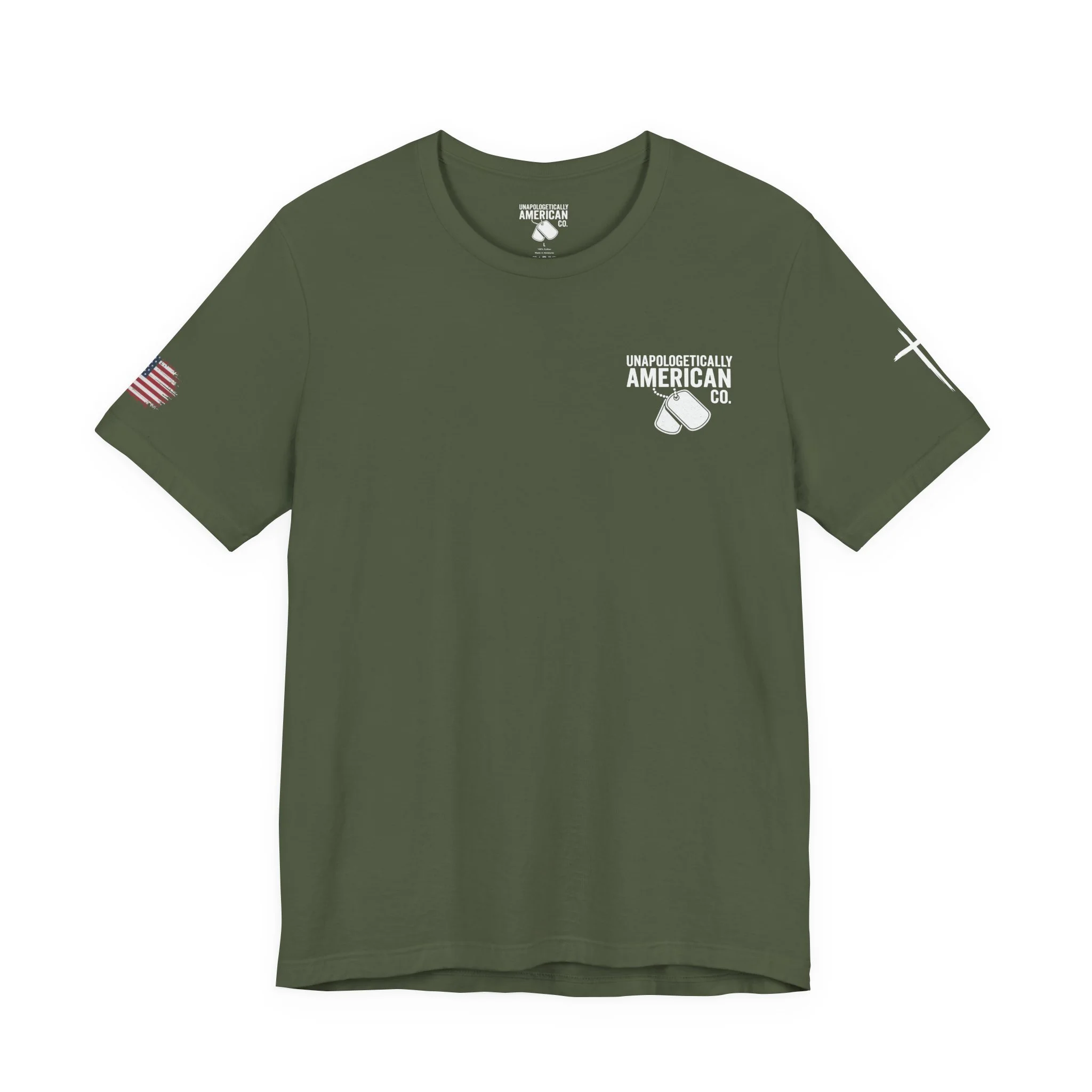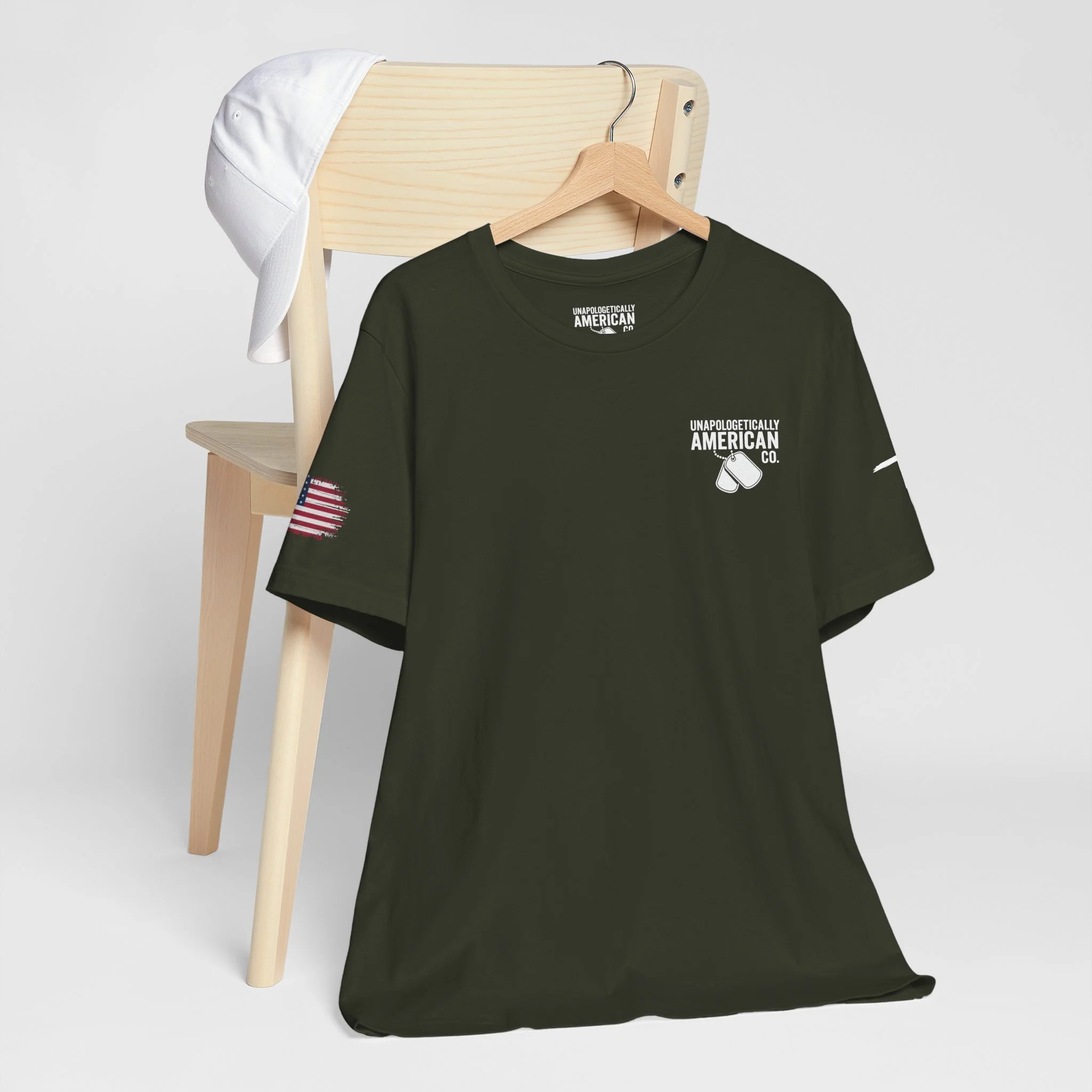 - Distressed chest flag graphic with vertical “VETERAN” text; small American flag print on sleeve