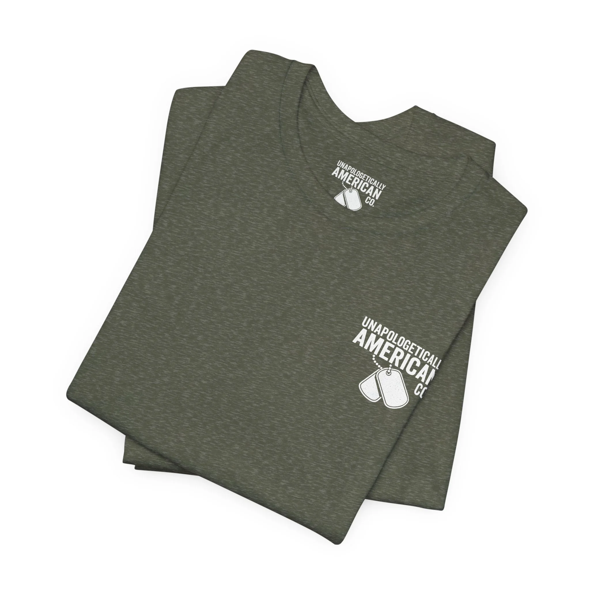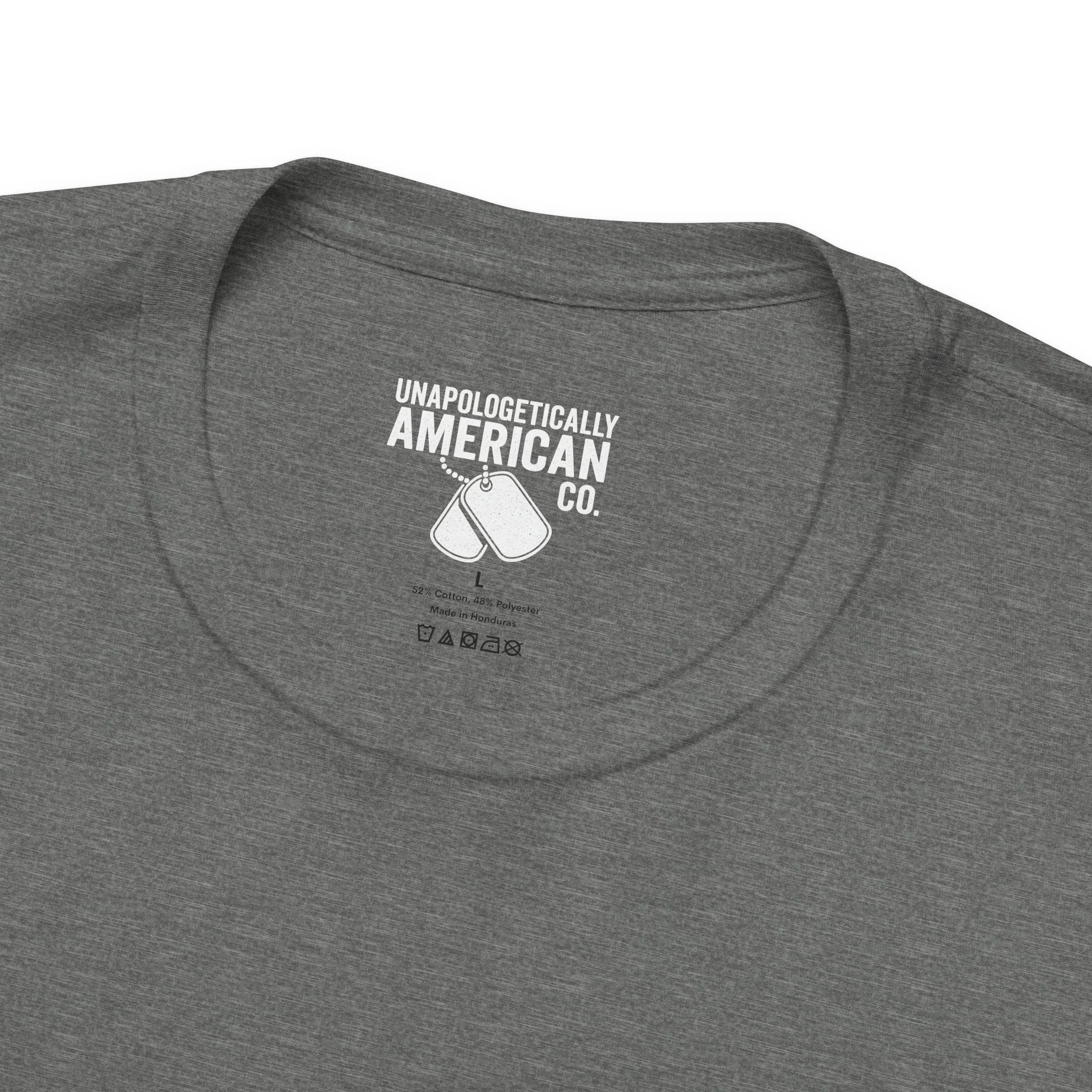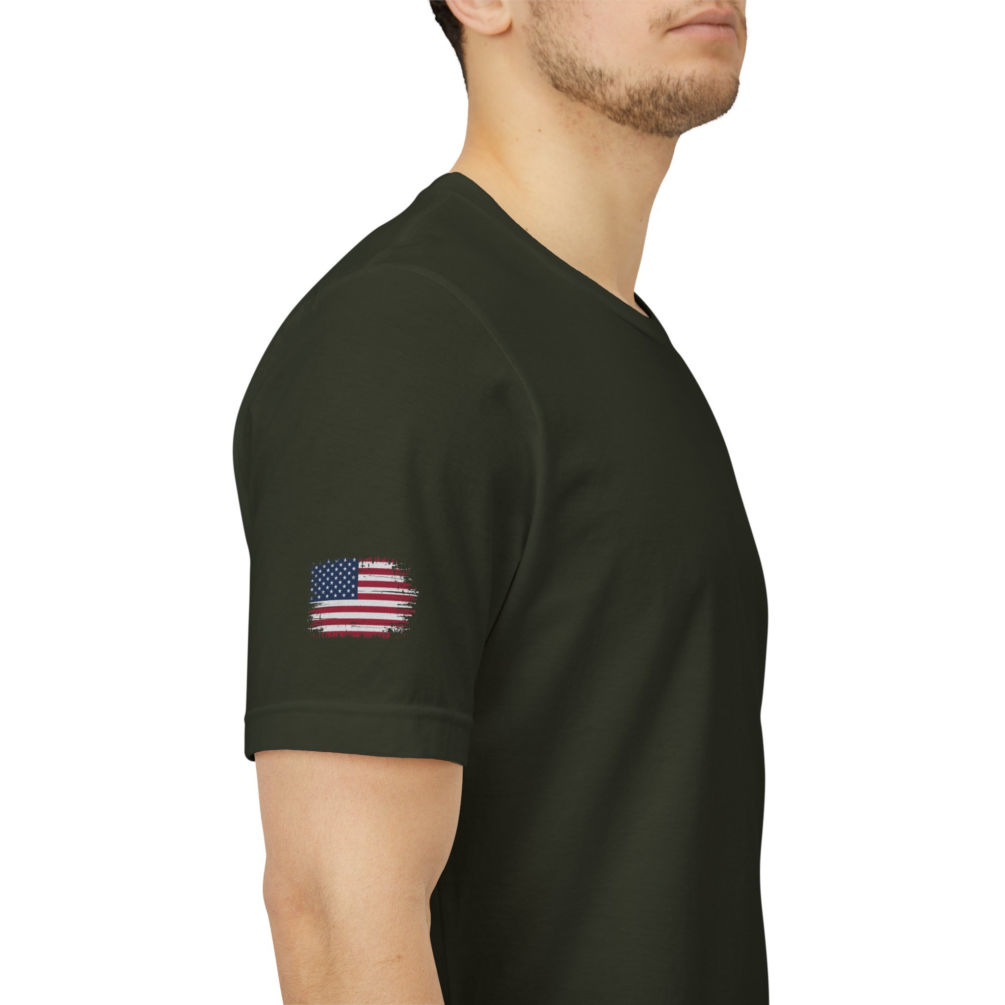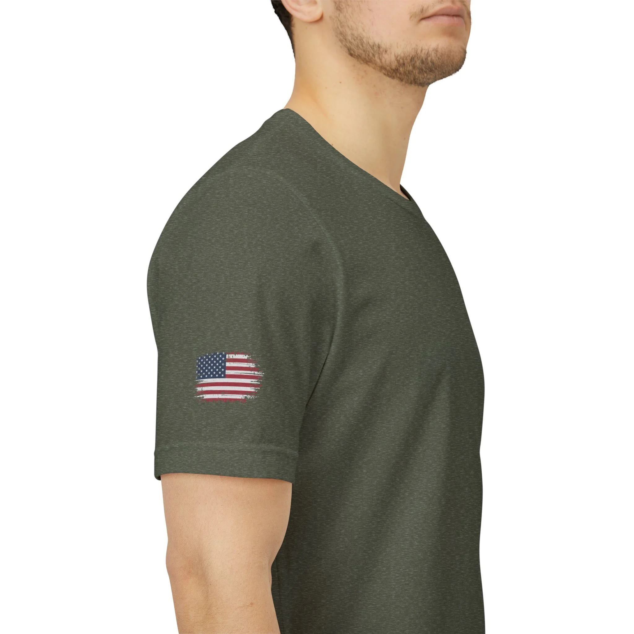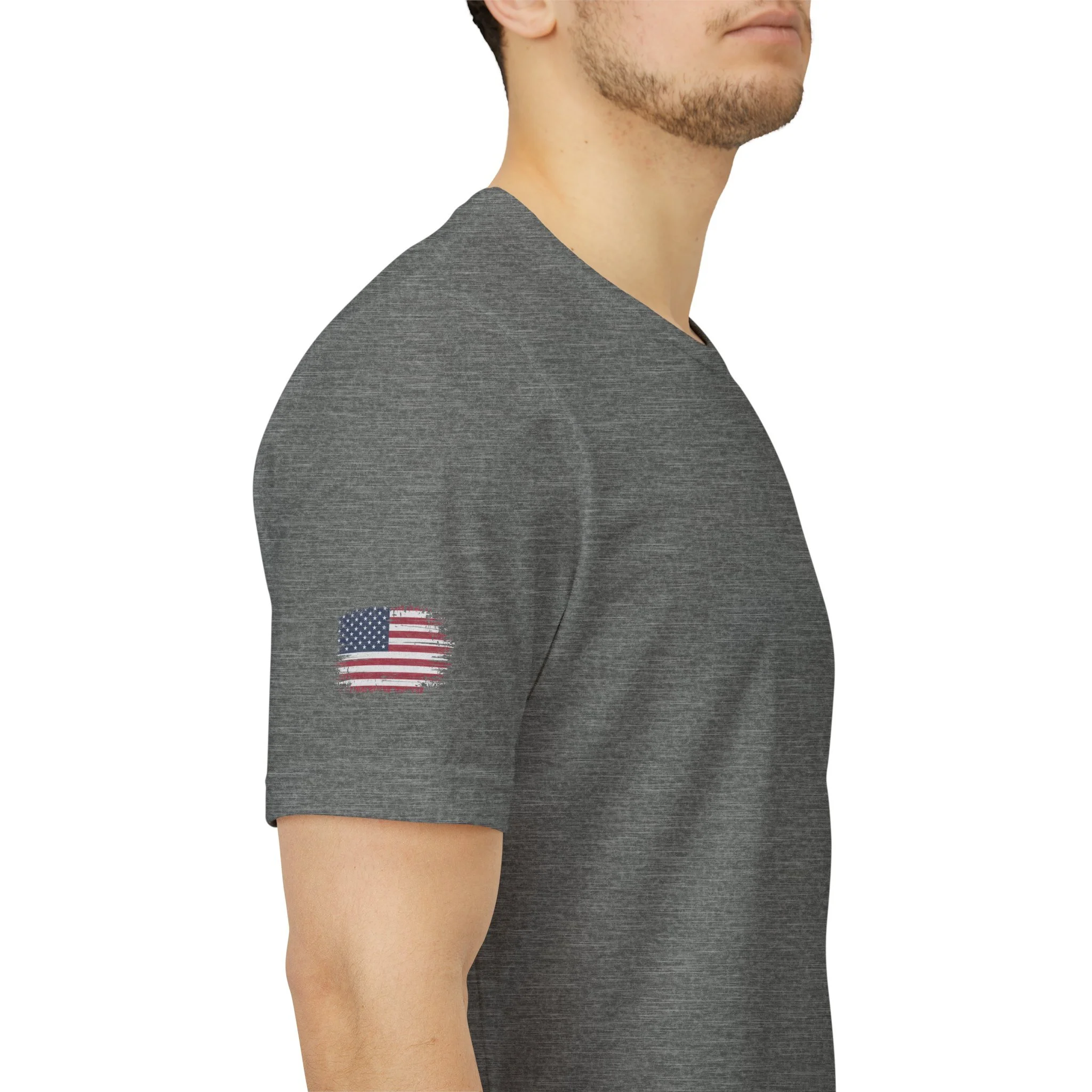 This soft, breathable jersey tee wears like a quiet salute. A muted, distressed American flag sits off-center on the chest with a vertical “VETERAN” down the right side—subtle, honorable, and rugged without shouting. The lightweight Airlume combed cotton feels cool against the skin and layers easily under jackets or work shirts. Built with a ribbed crew neck, shoulder tape, and side seams to hold its shape, the shirt stays comfortable after repeated wear and washes. The small flag on the sleeve adds a tidy, respectful detail. Wear it to remember service, to show steady support, or to bring a calm, veteran-focused statement to casual gatherings or commemorative events.